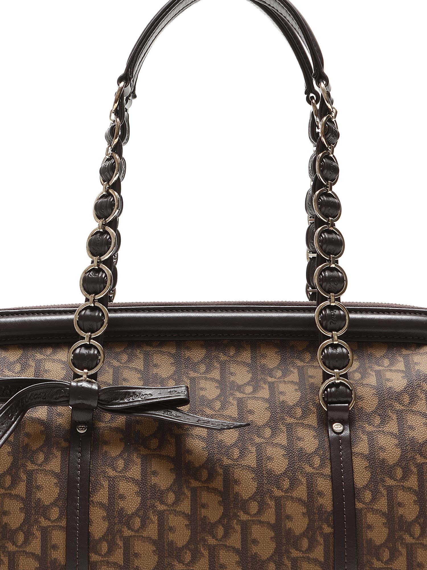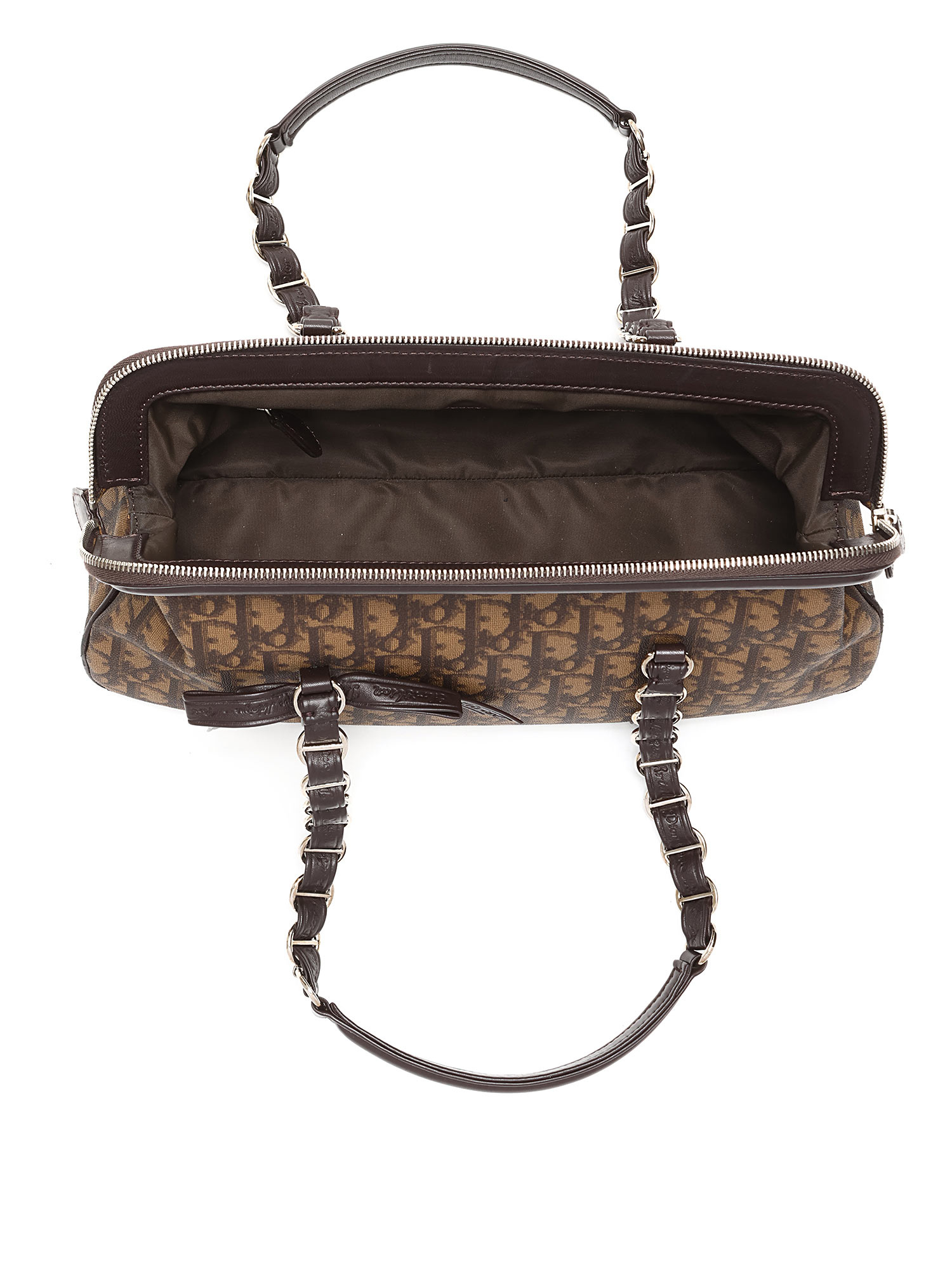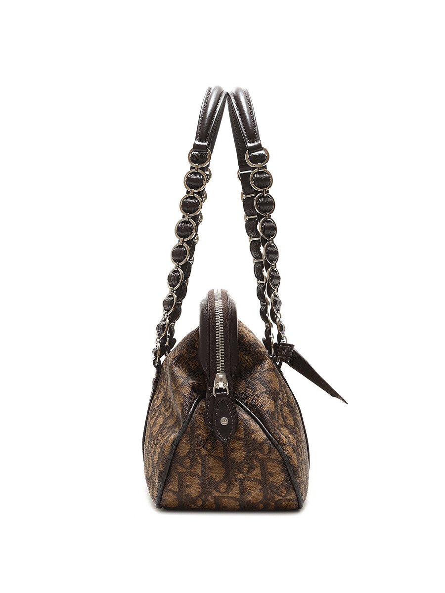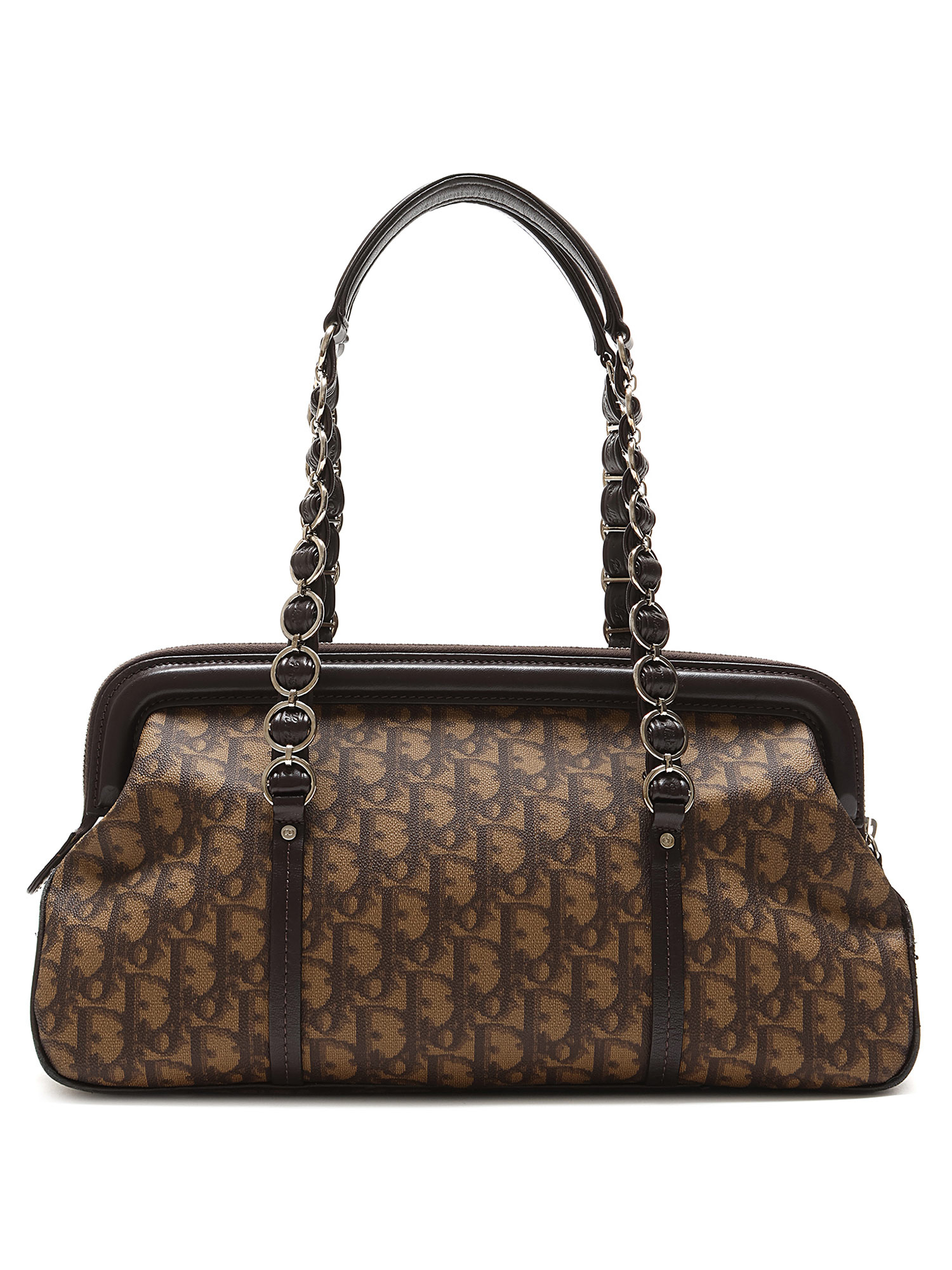 Sac en toile à motif monogramme en brun et noir. Fermeture à glissière sur le dessus. Deux poignées en cuir. Quincaillerie en métal argenté.