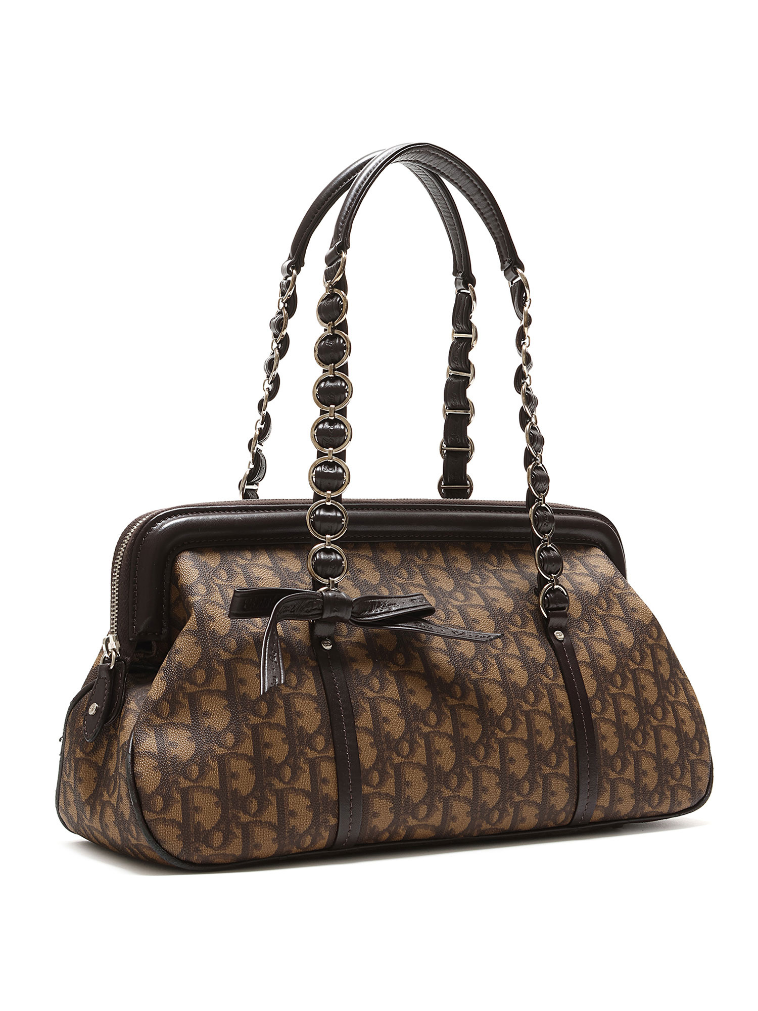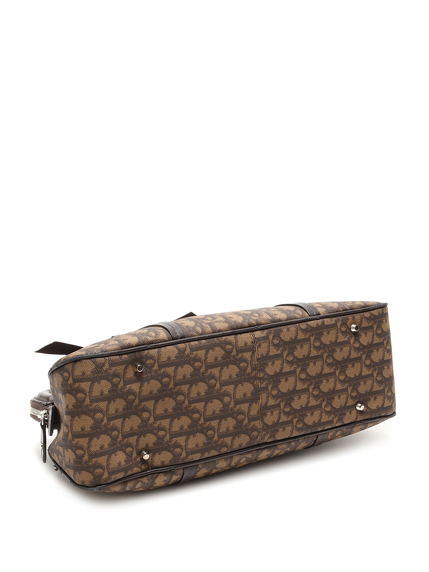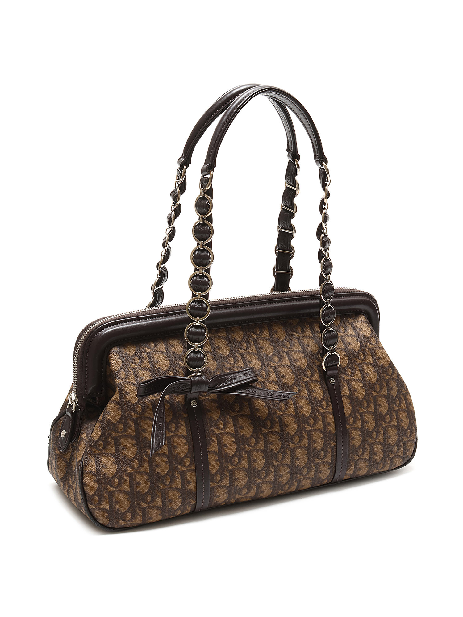 Sac en toile à motif monogramme en brun et noir. Fermeture à glissière sur le dessus. Deux poignées en cuir. Quincaillerie en métal argenté.