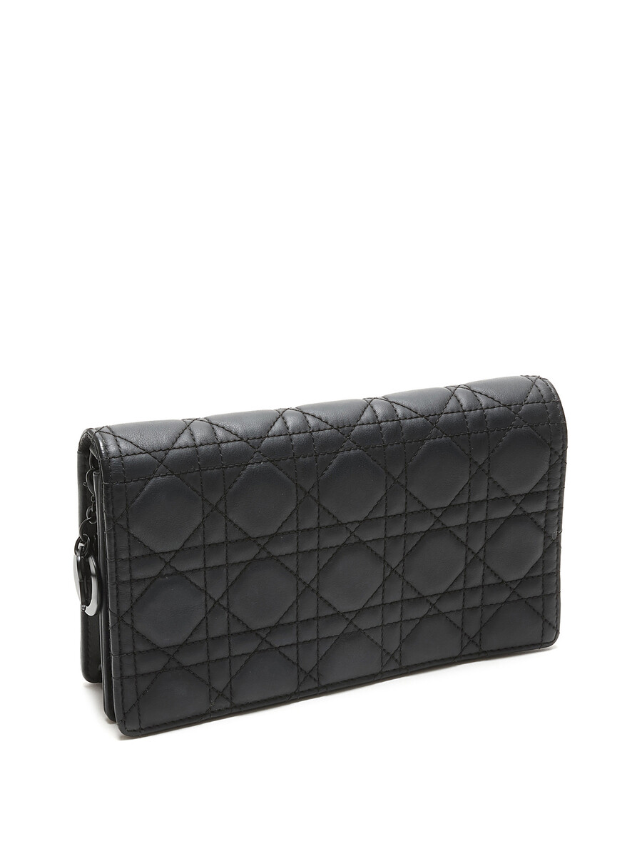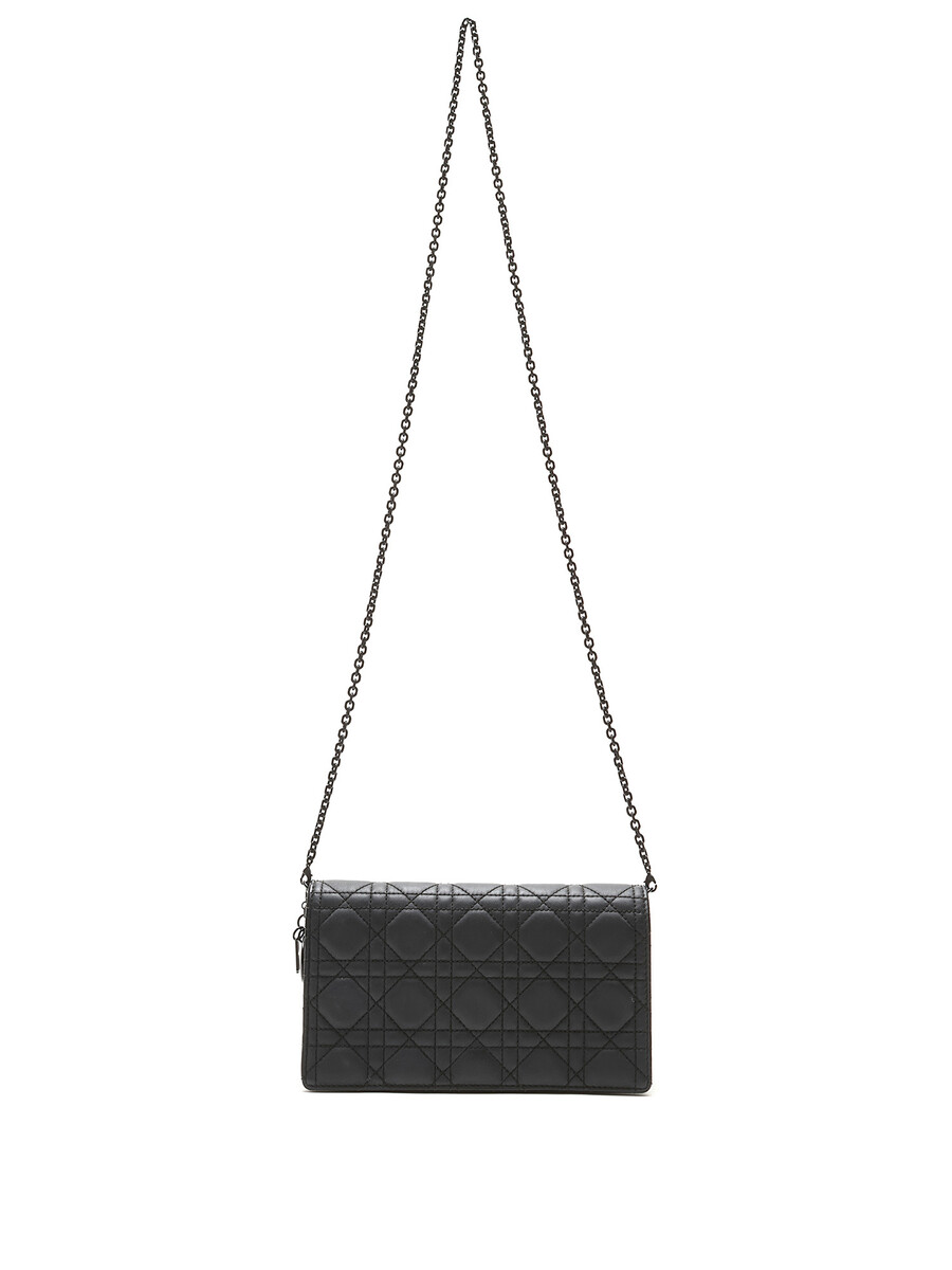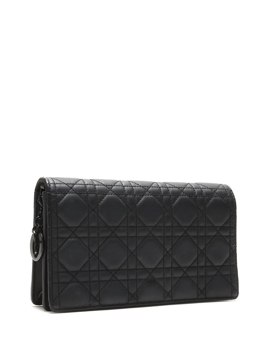 Pochette en cuir grainé Cannage noir de Christian Dior. Fermeture magnétique à pression et bandoulière en chaîne. Quincaillerie en métal noir avec finitions en cuir. Cuir grainé