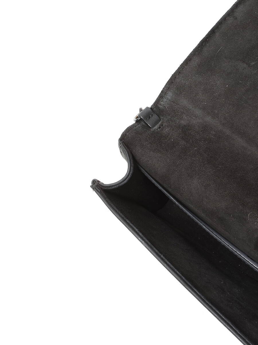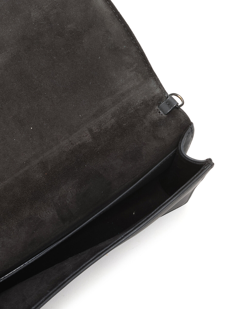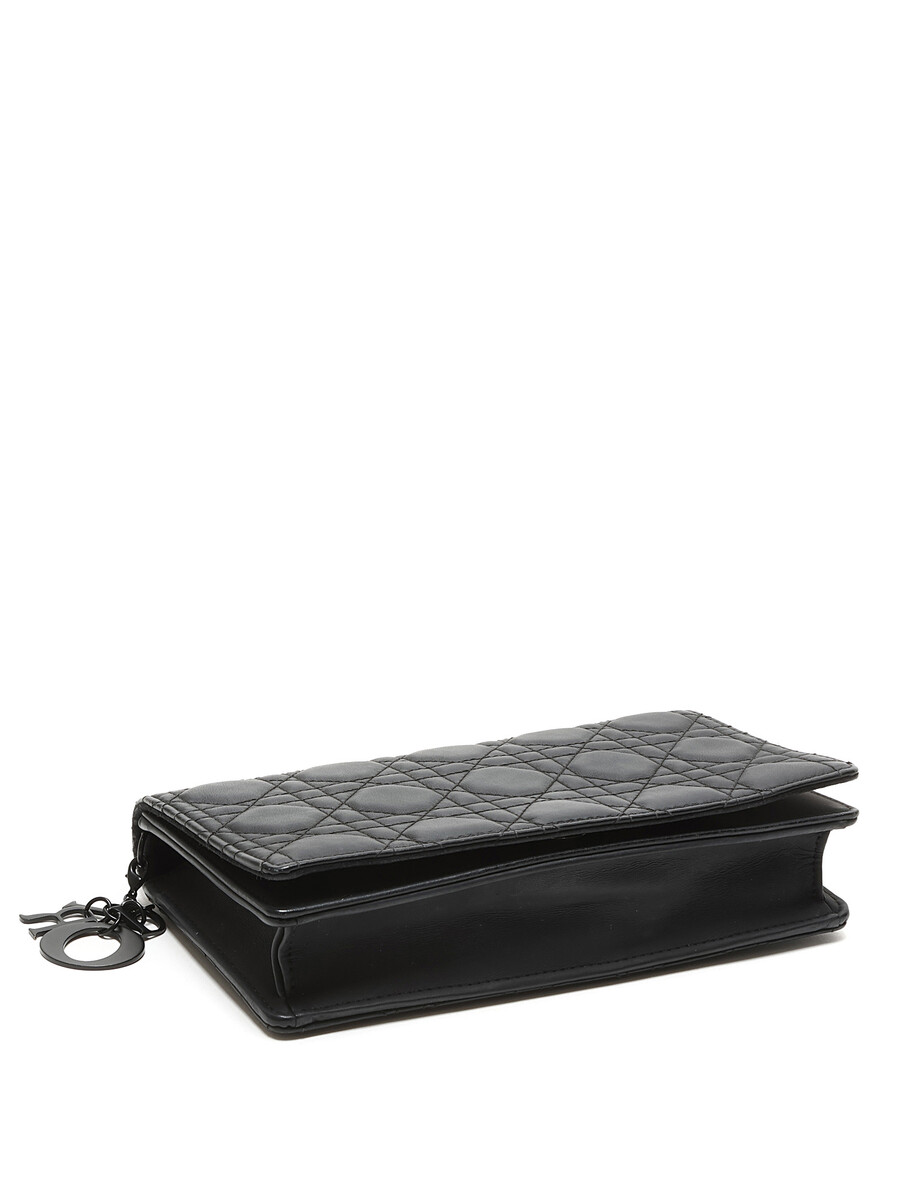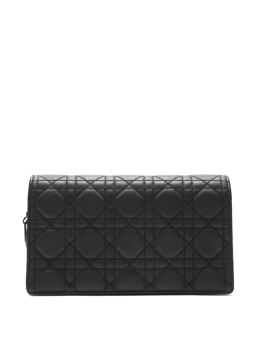 Pochette en cuir grainé Cannage noir de Christian Dior. Fermeture magnétique à pression et bandoulière en chaîne. Quincaillerie en métal noir avec finitions en cuir. Cuir grainé
