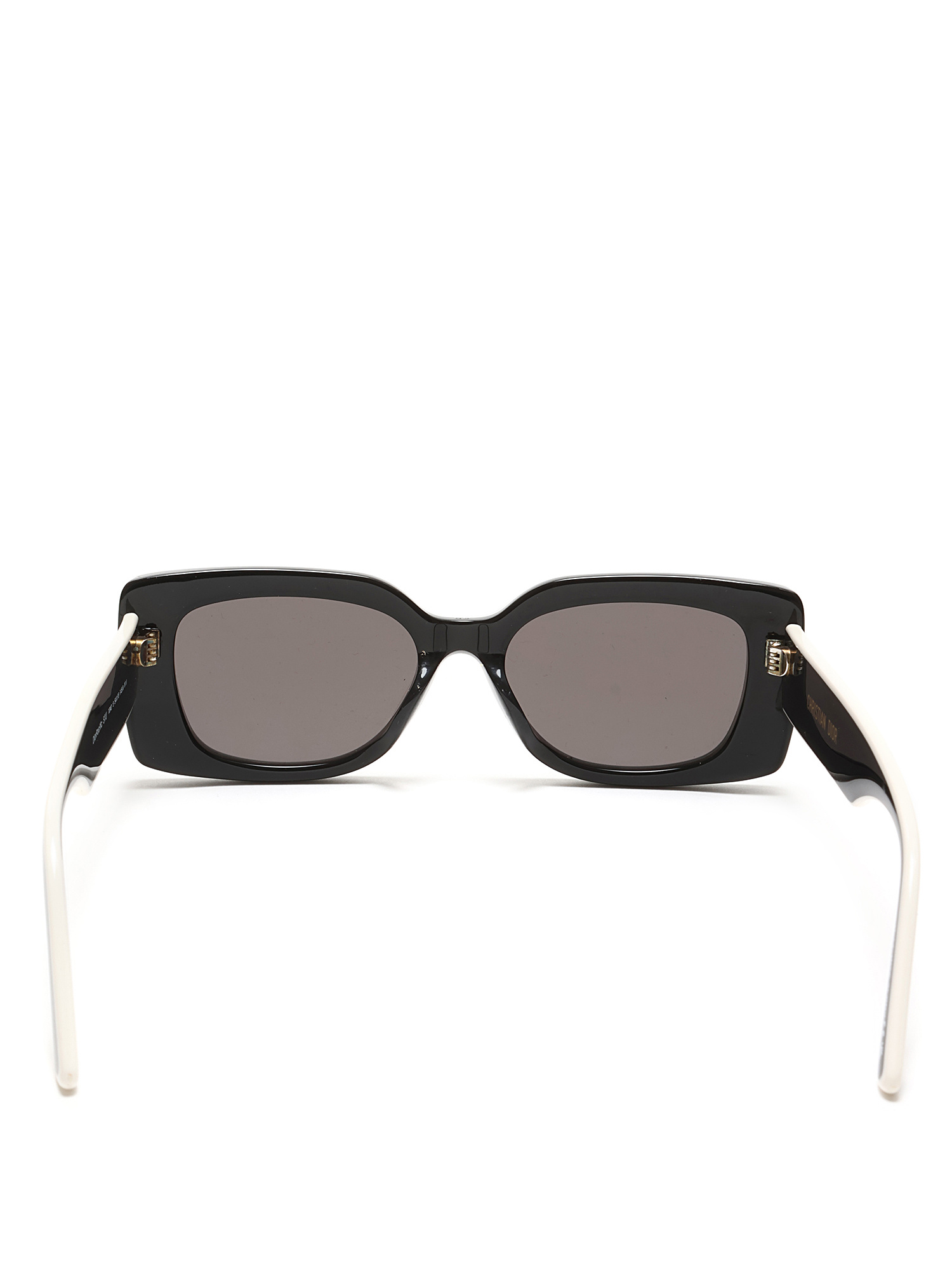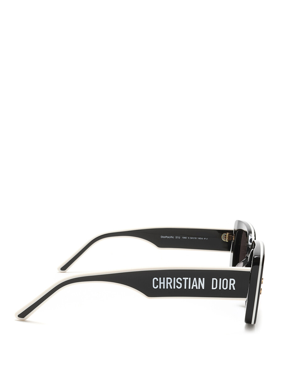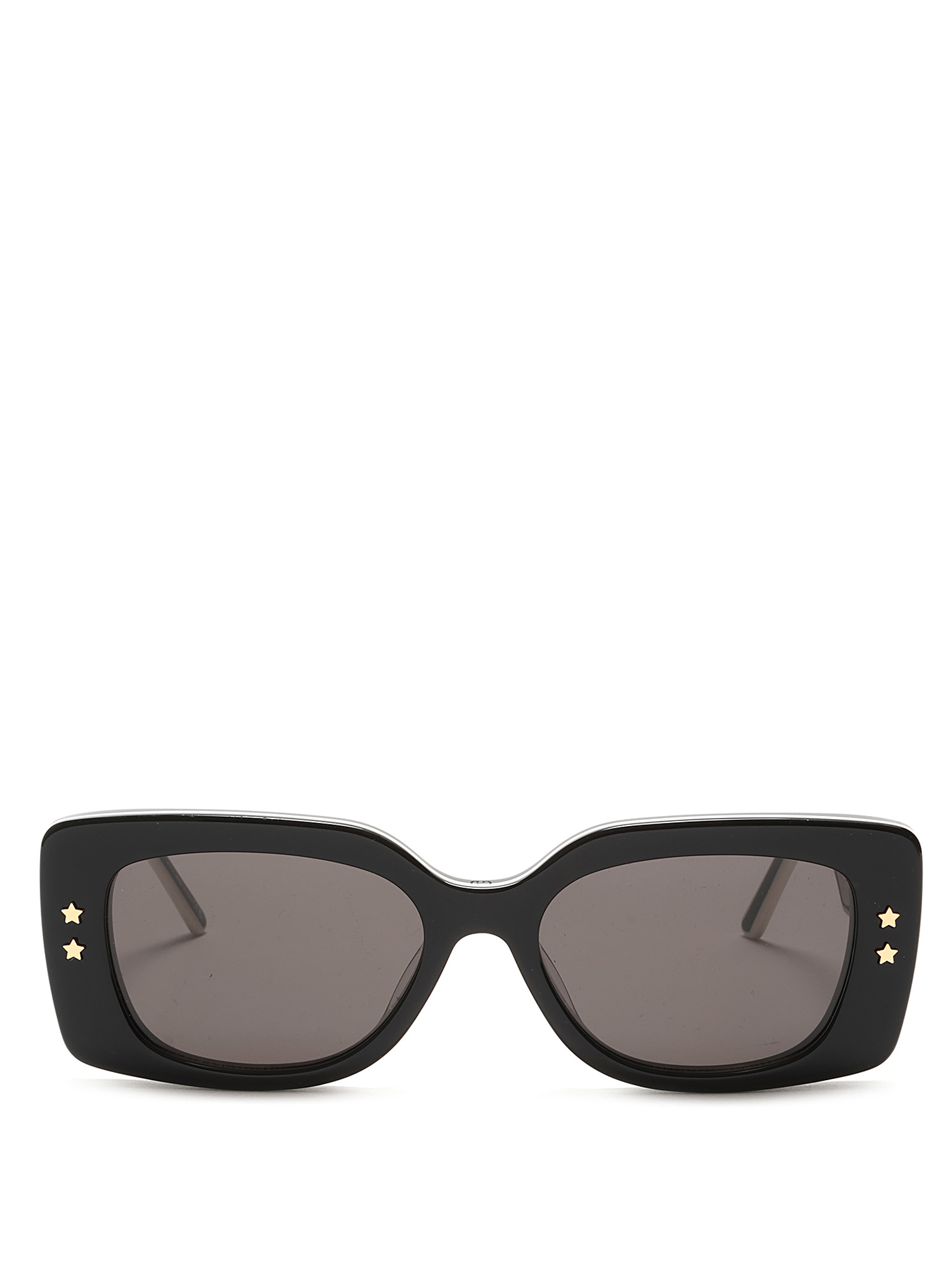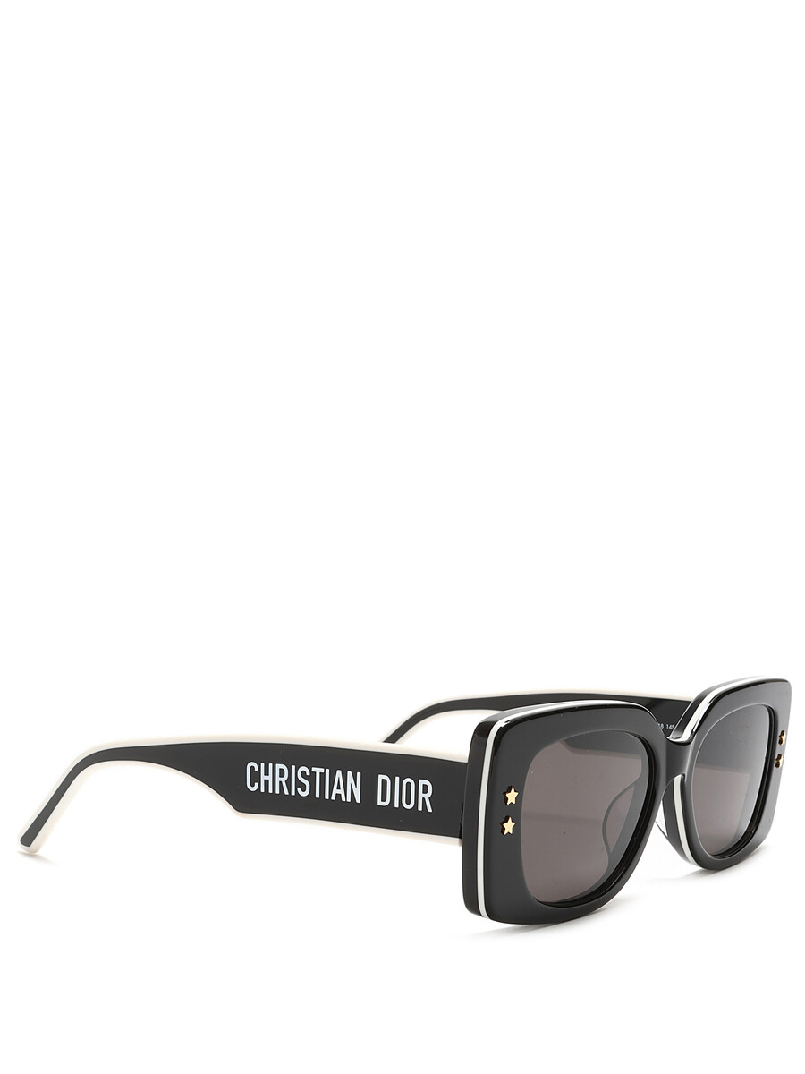 Lunettes de soleil en acétate noir et blanc avec logo Christian Dior sur les branches. Éléments décoratifs en forme d'étoile sur le devant.