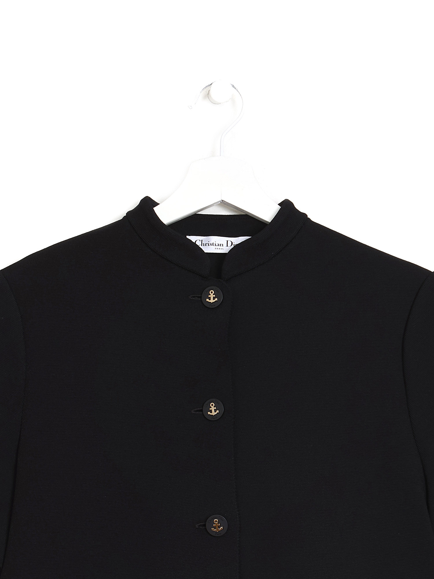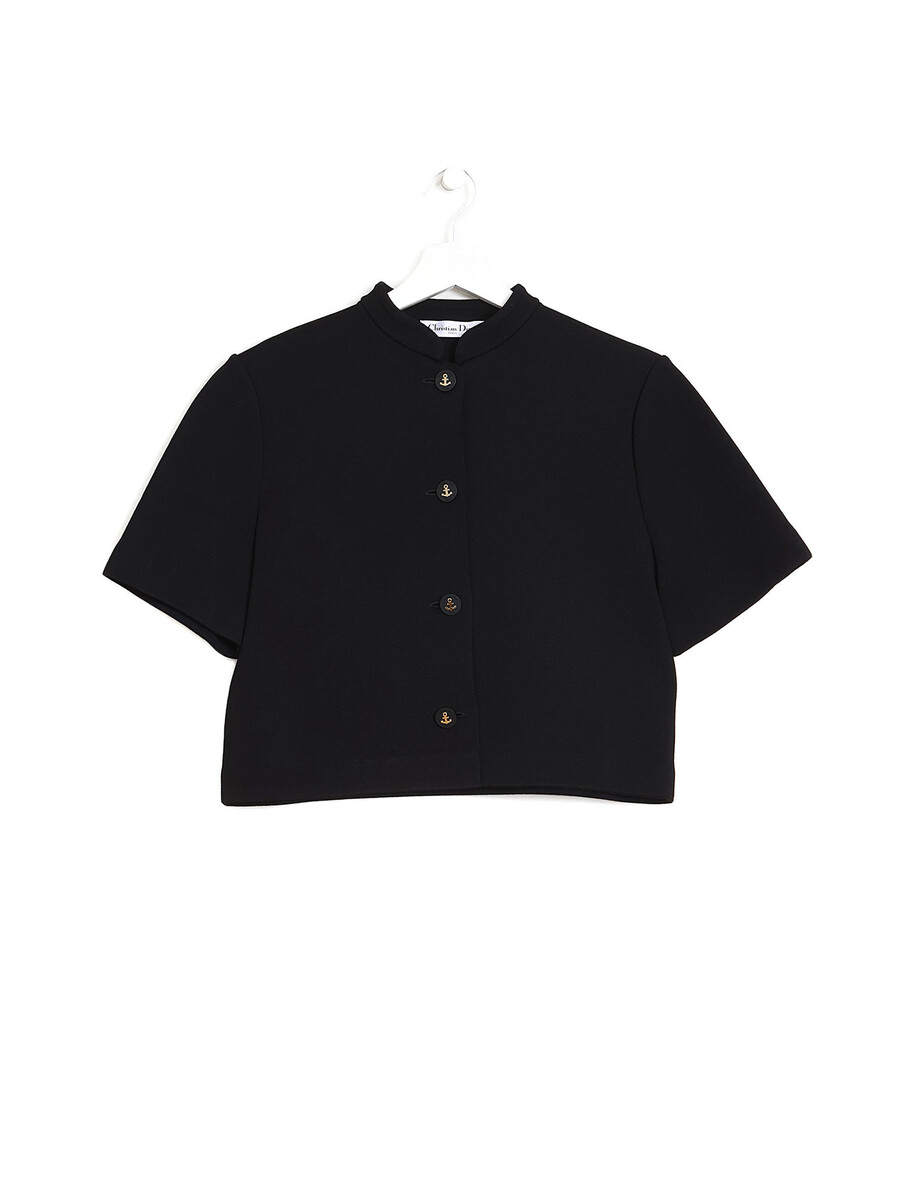 Haut à manches courtes noir de Christian Dior avec boutons nautiques en métal doré. Fermeture à boutons devant. Col officier.