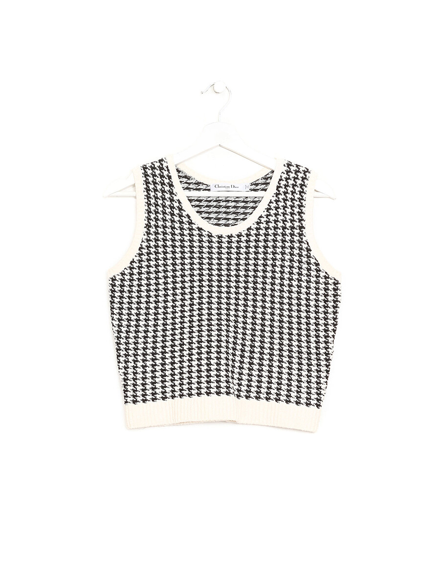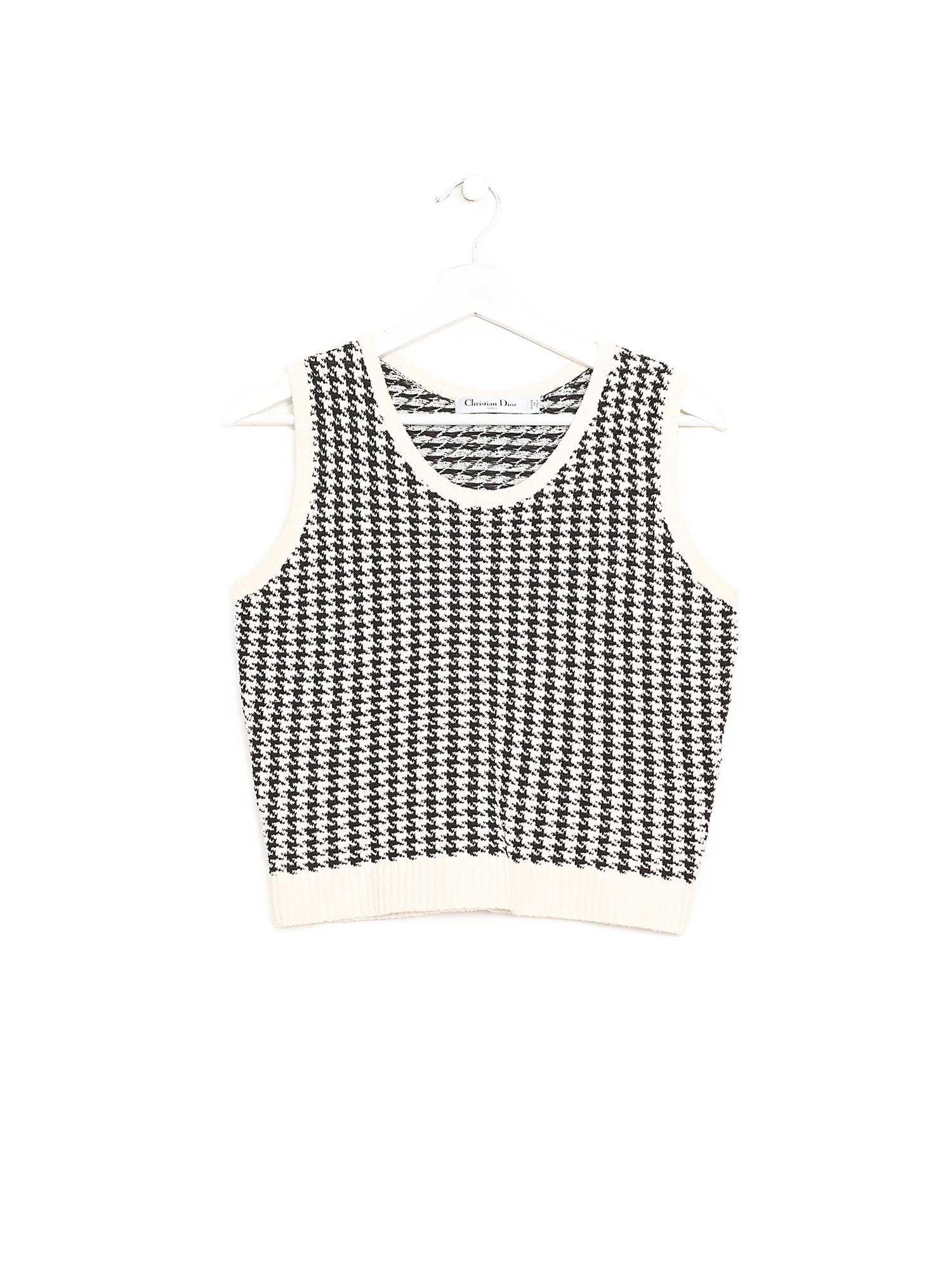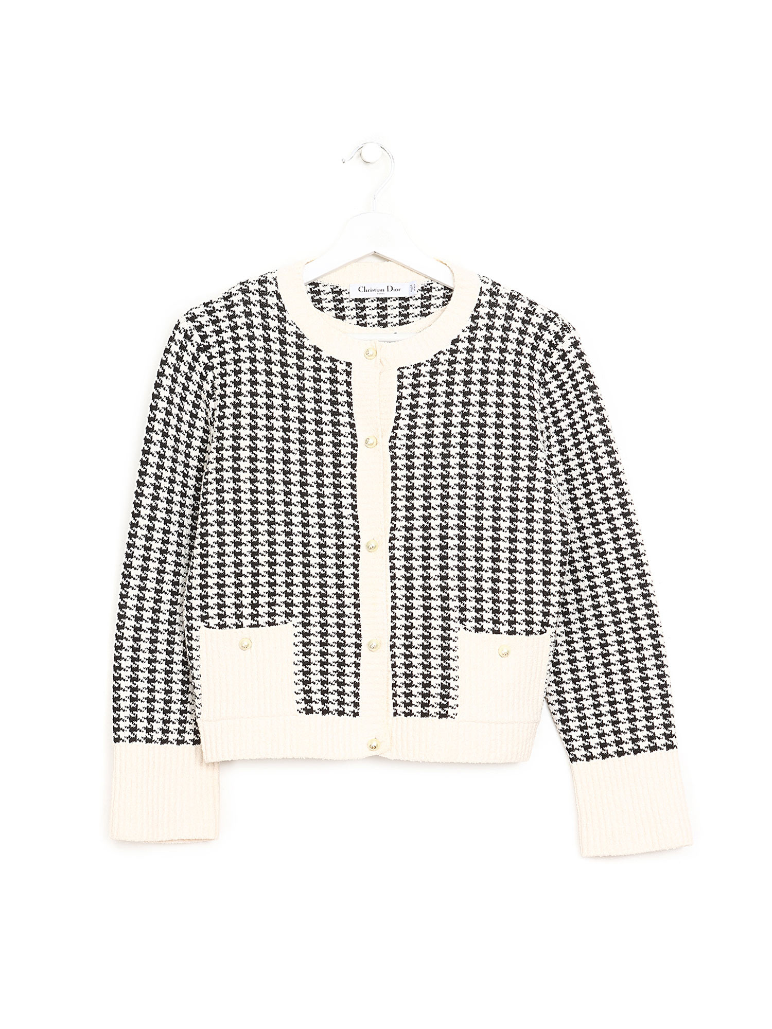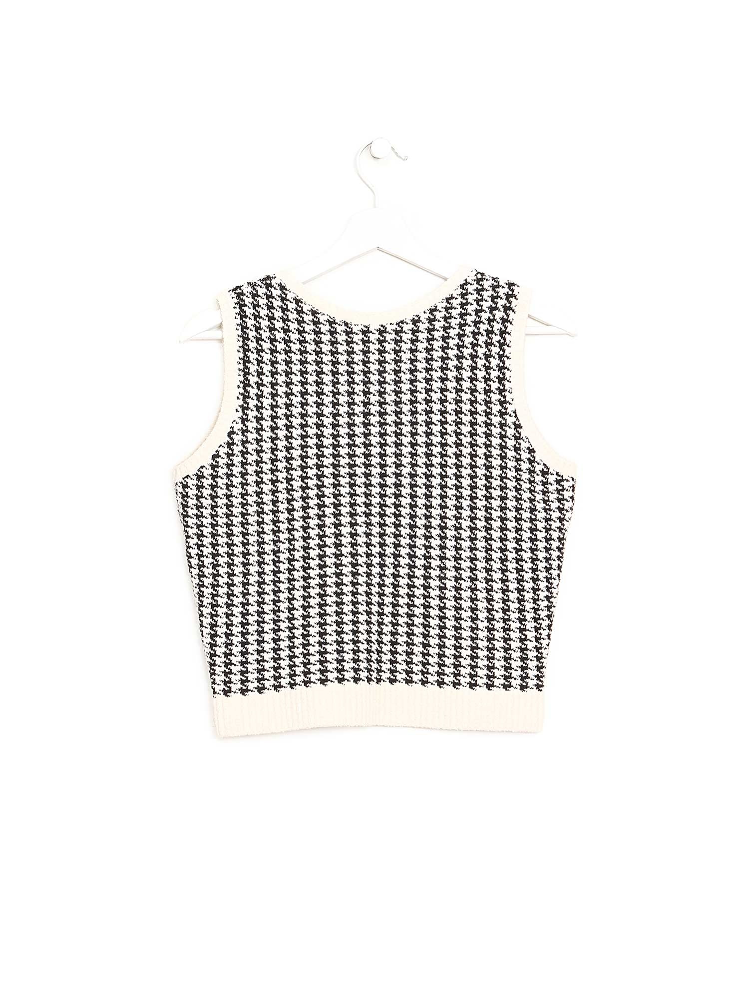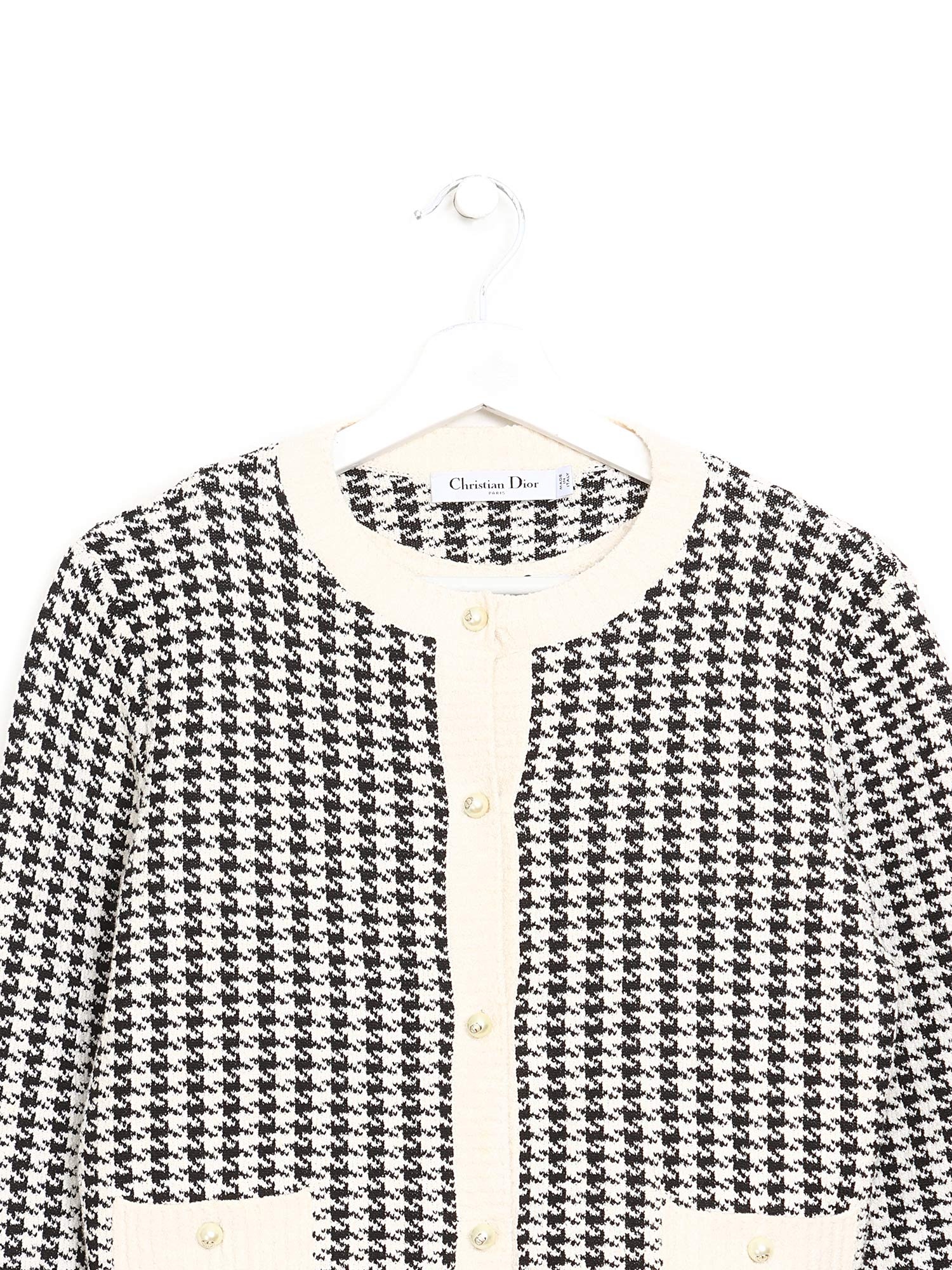 Cardigan twinset à motif pied-de-poule noir et blanc. Manches longues avec poignets et ourlet côtelés. Fermeture boutonnée à l'avant. Texture douce en tricot.