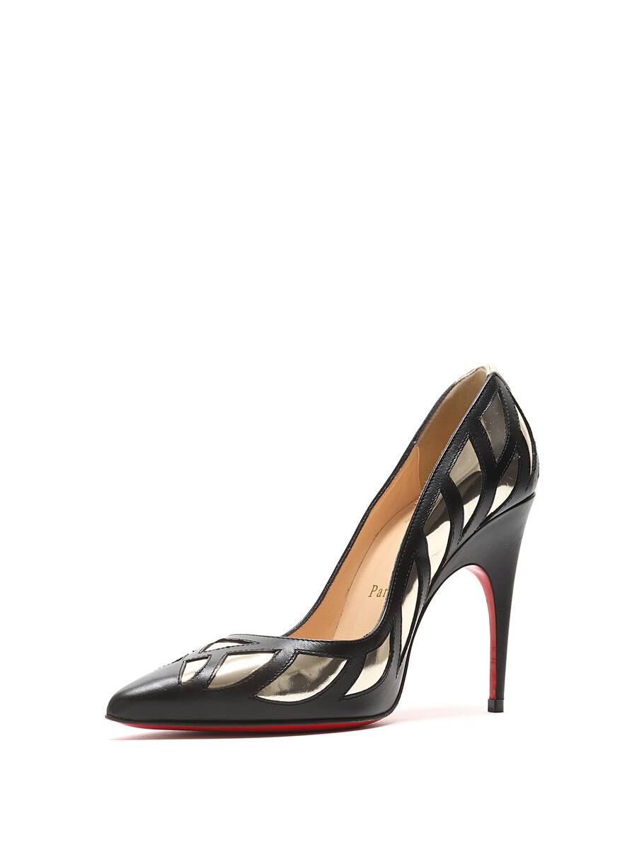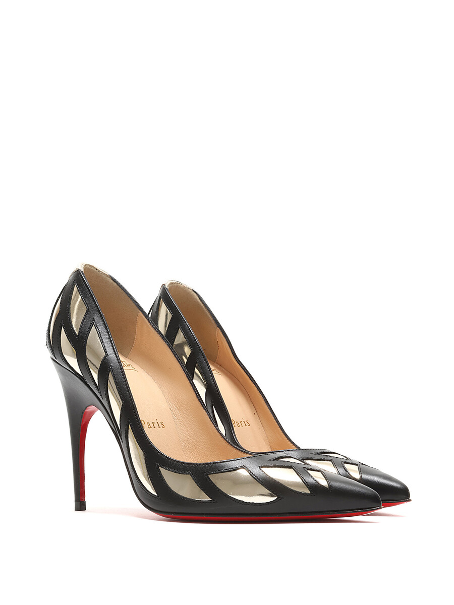 Escarpins en cuir verni noir avec design découpé et semelles rouges emblématiques. Style à enfiler avec bout pointu. Semelle en cuir.