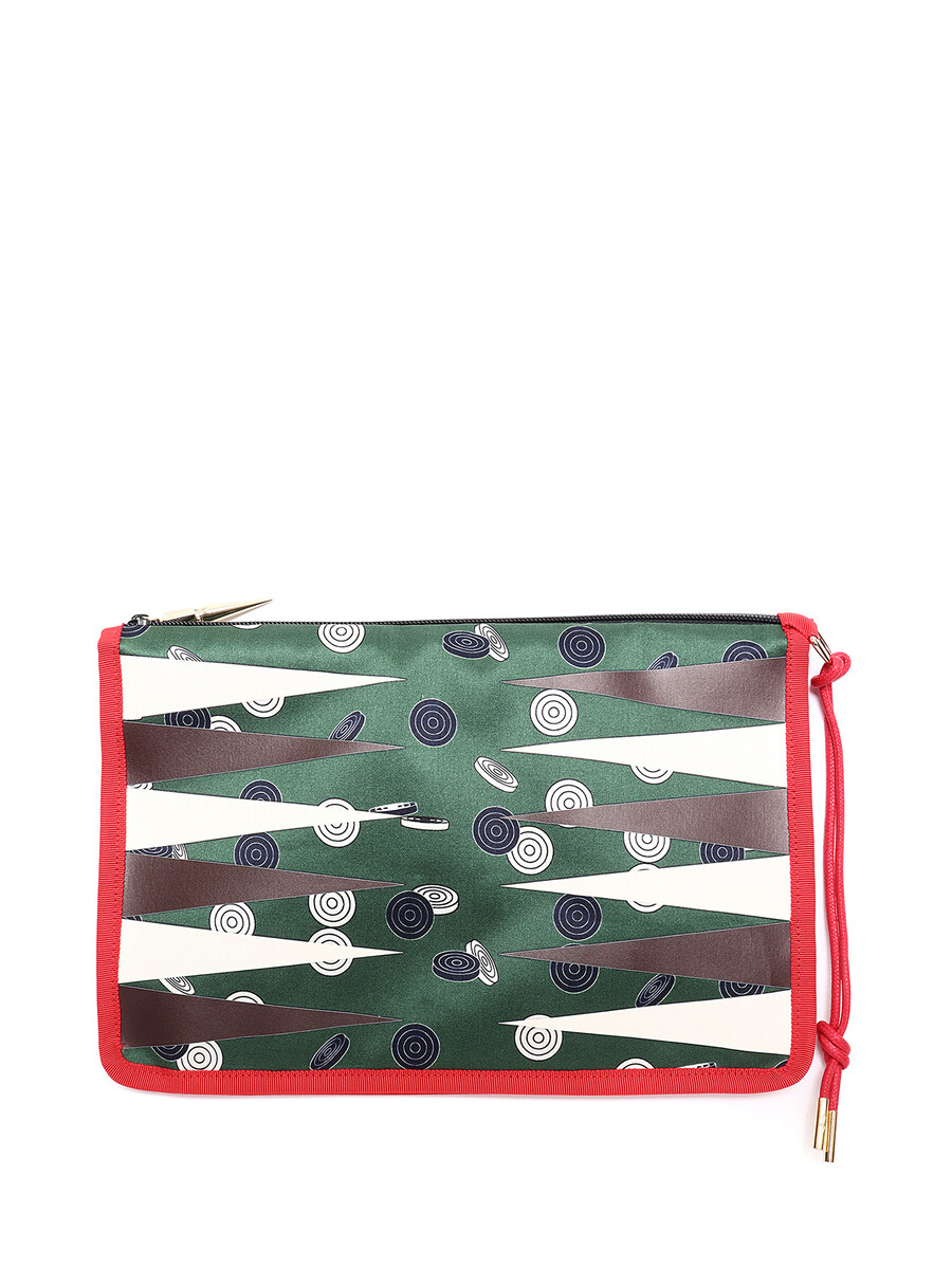 Ensemble de backgammon luxueux avec un motif géométrique en vert, noir, blanc et rouge. Ferrures dorées emblématiques avec fermeture à glissière sécurisée. Livré avec une boîte, des pièces de jeu et un sac de rangement.