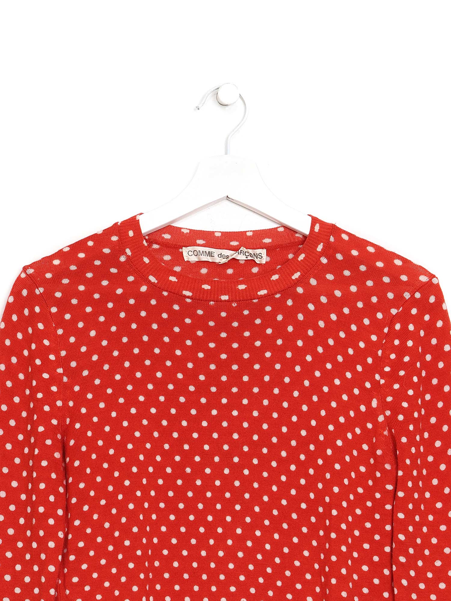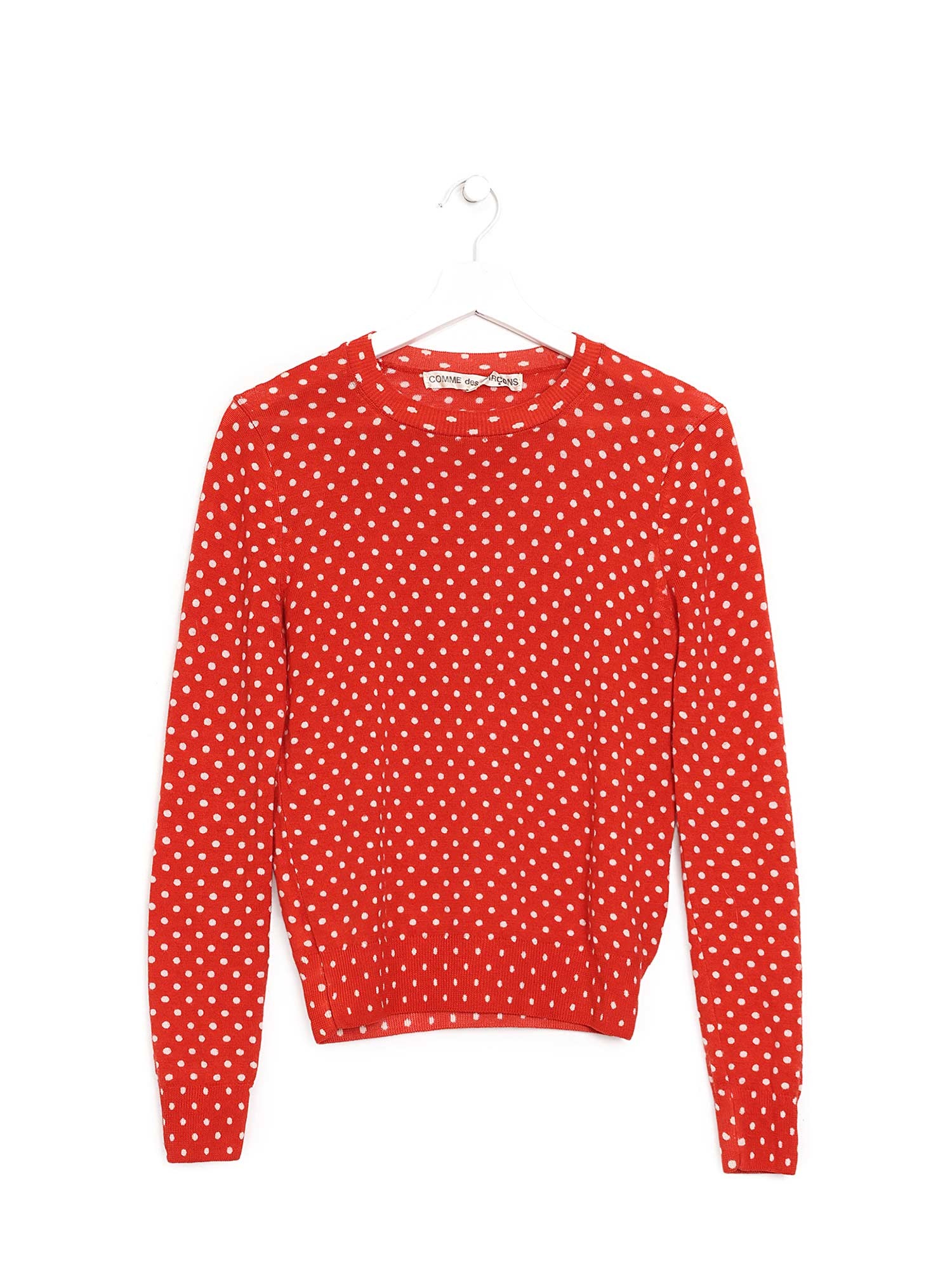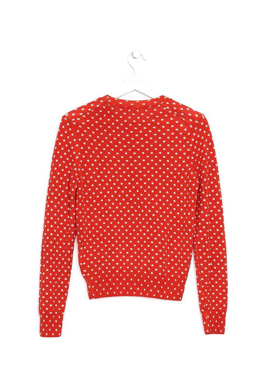Pull en laine rouge à pois avec manches longues.