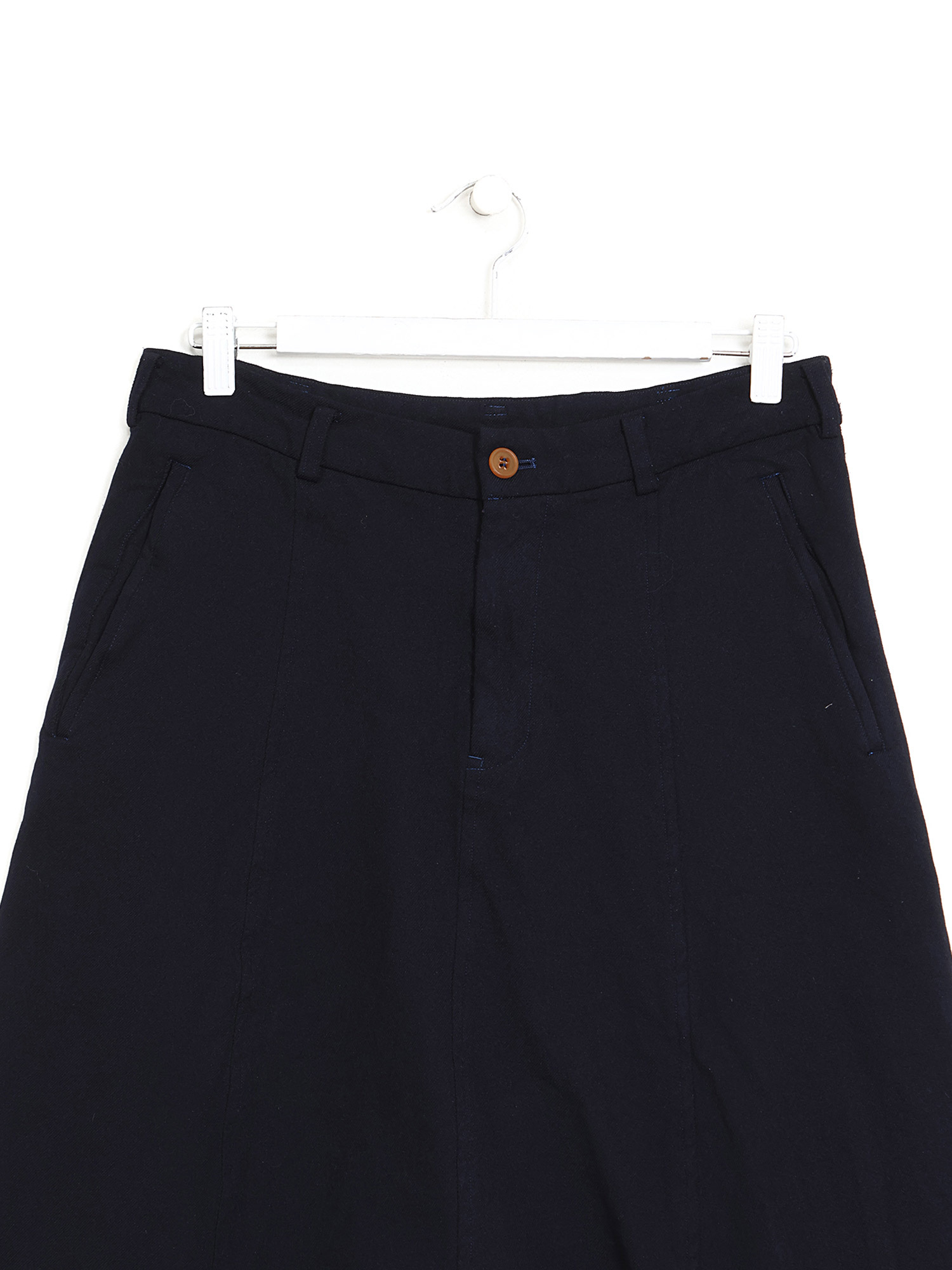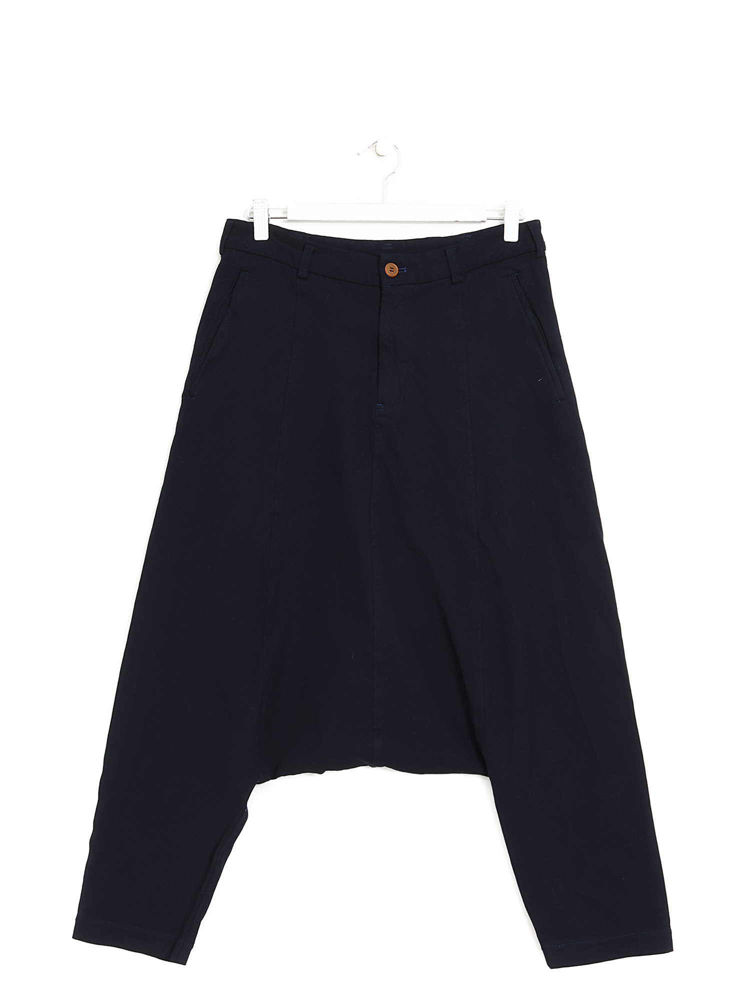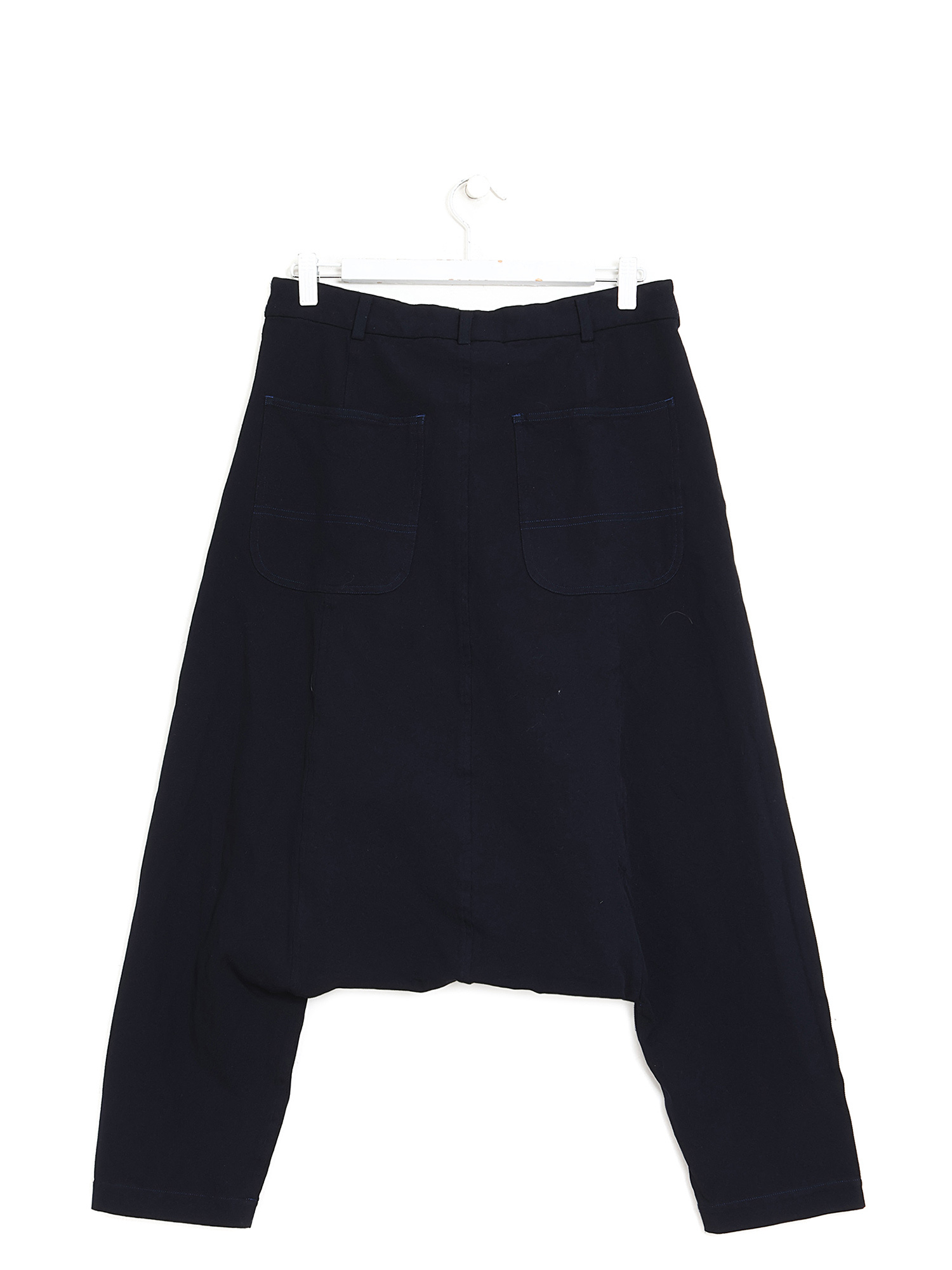 Pantalon noir à entrejambe bas avec fermeture à boutons. Jambe droite. Coupe ample et confortable.