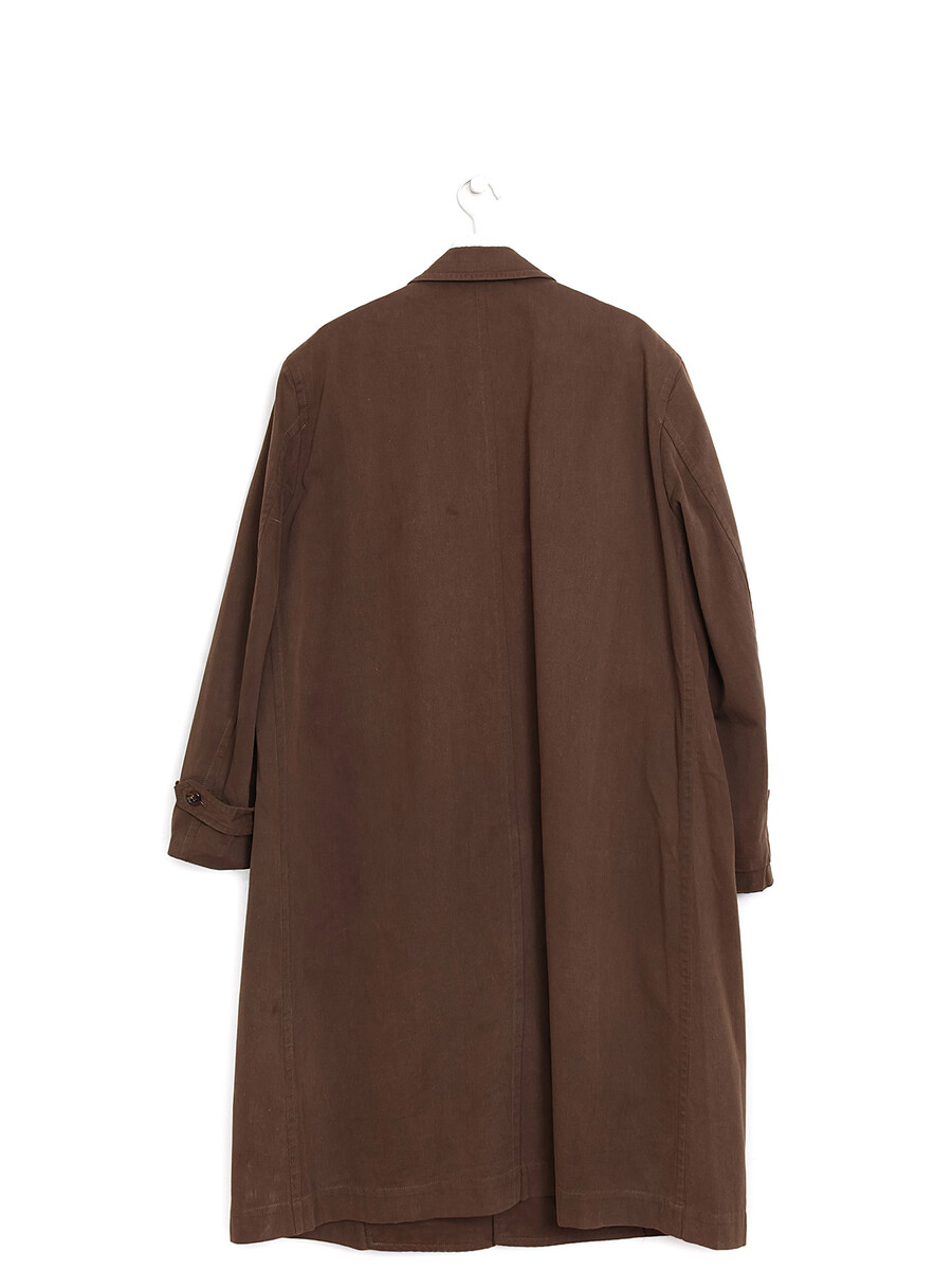 Manteau long en coton brun à manches longues. Fermeture à boutons sur le devant. Col de chemise.