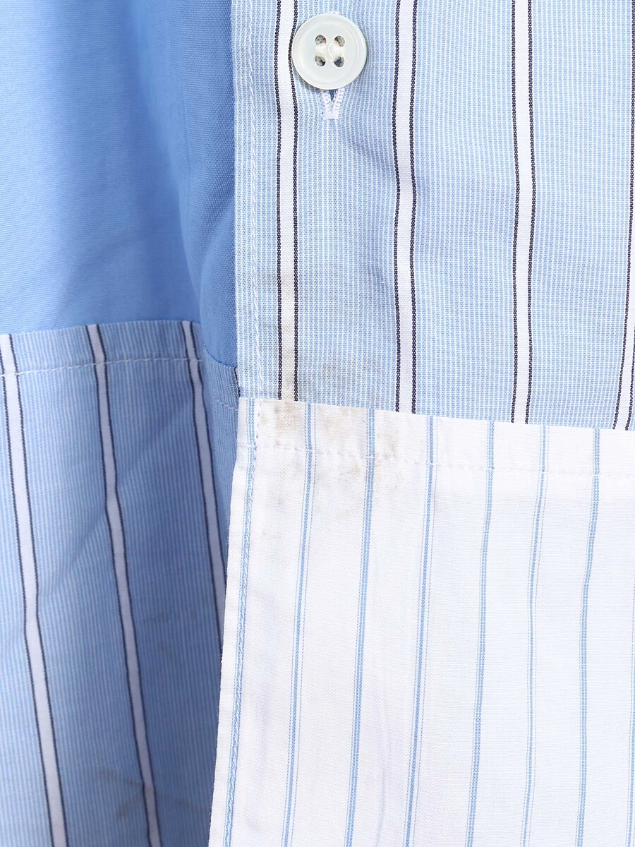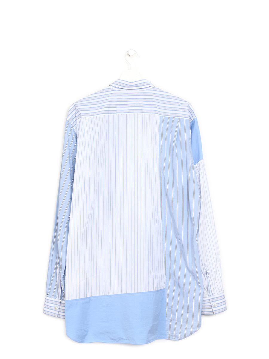 Chemise rayée à manches longues en blanc et bleu. Fermeture à boutons de perles. Motif à rayures sur l'ensemble. Poche à la poitrine.
