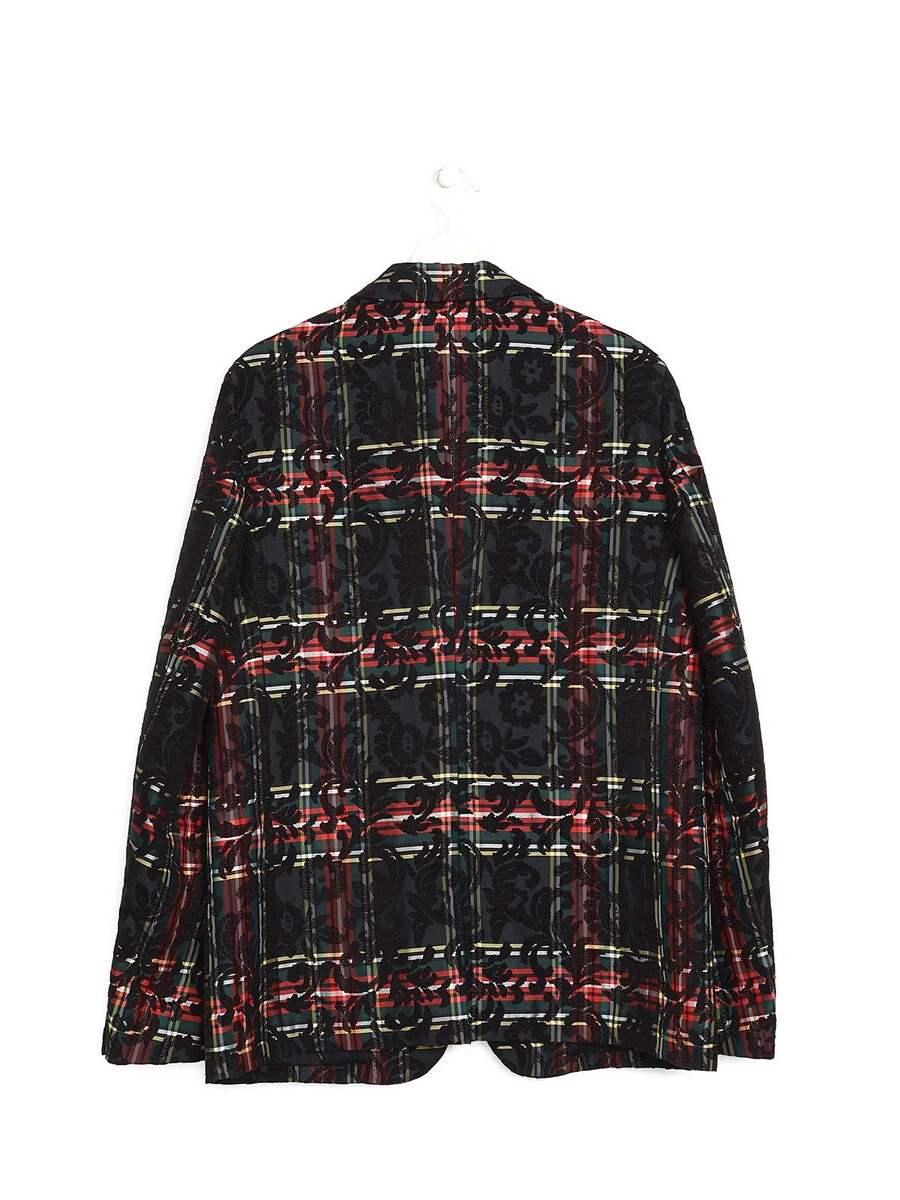 Blazer à carreaux écossais en rouge, vert, jaune et noir. Imprimé floral superposé. Épaules structurées et poignets à boutons. Fermeture simple à un rang.