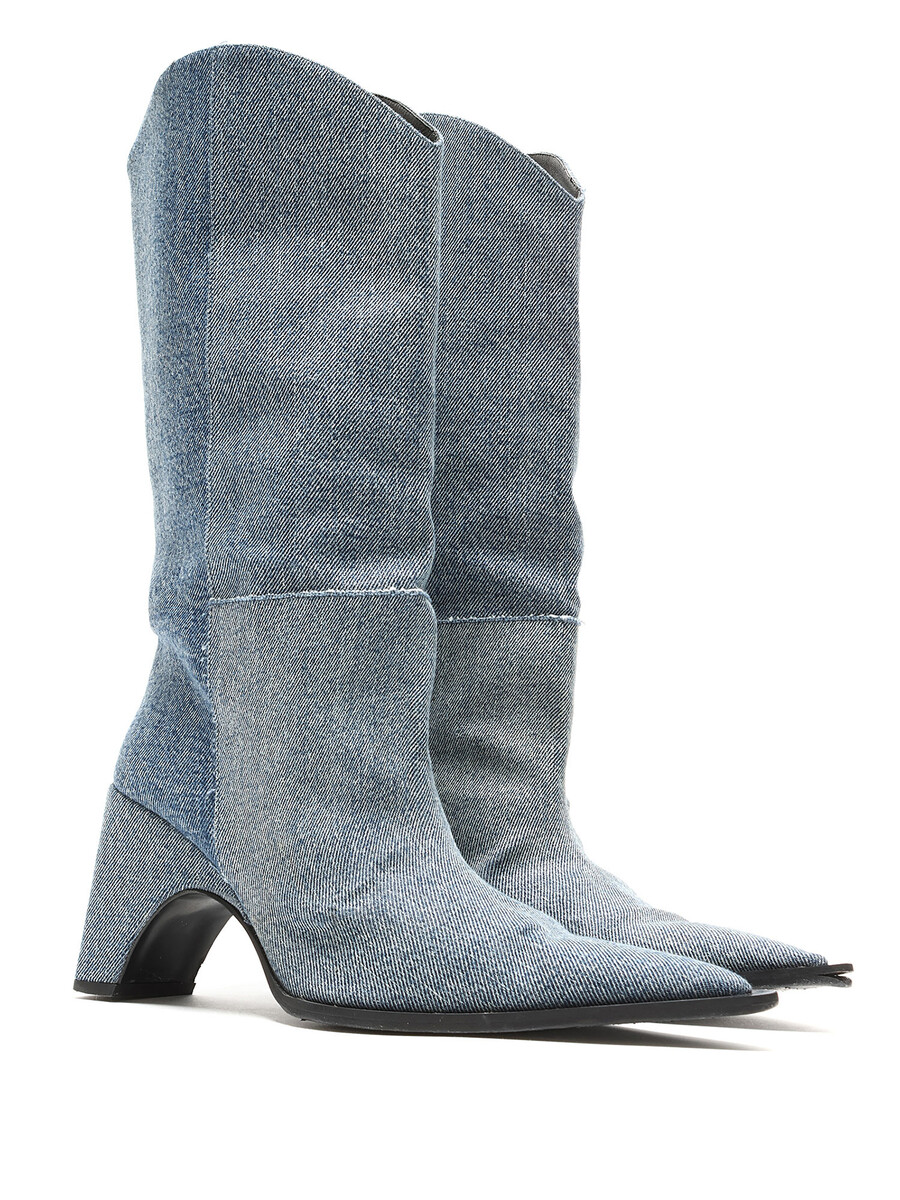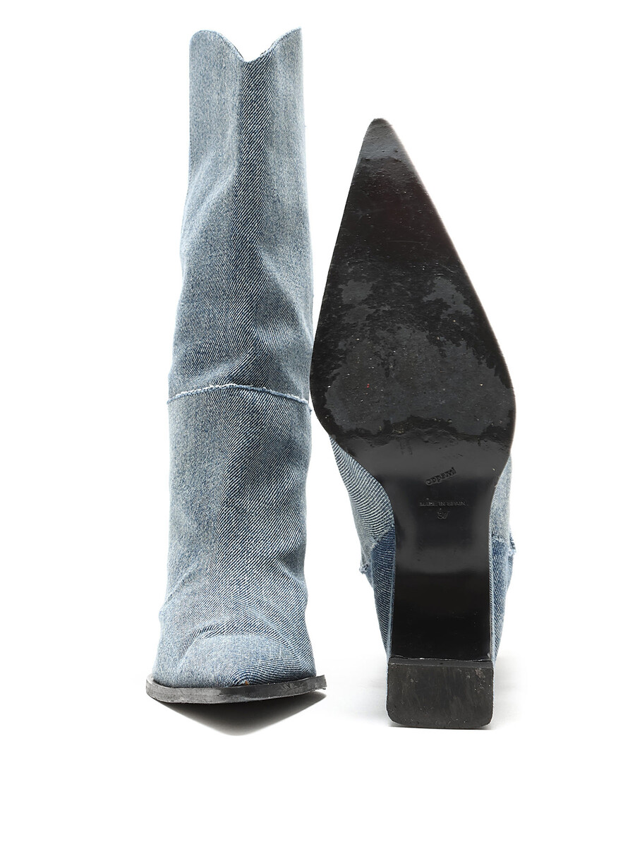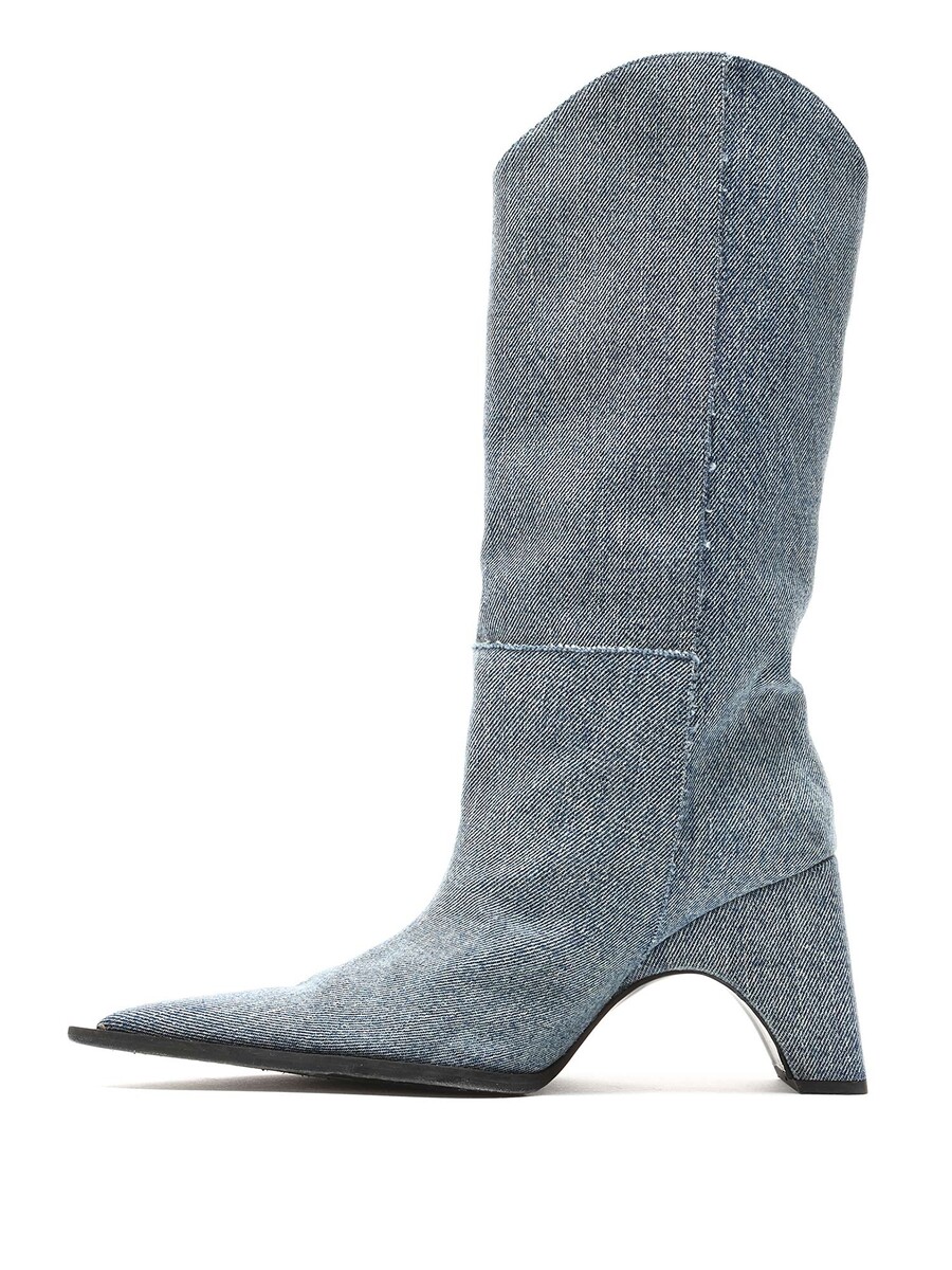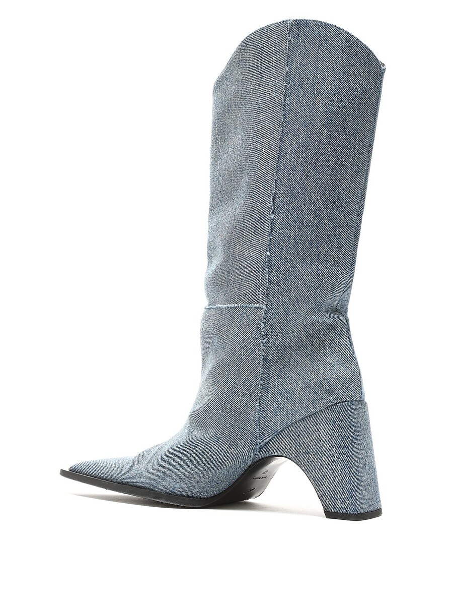 Bottes en denim bleu à hauteur de genou avec un design matelassé. Style à bout pointu. Semelle en cuir.
