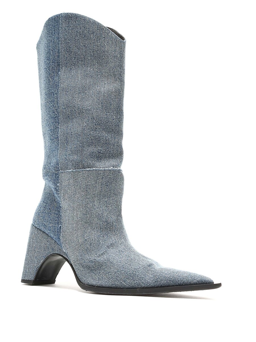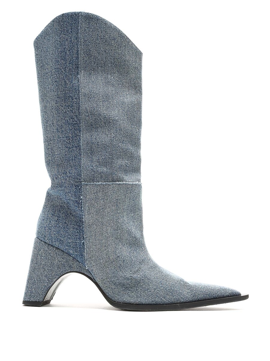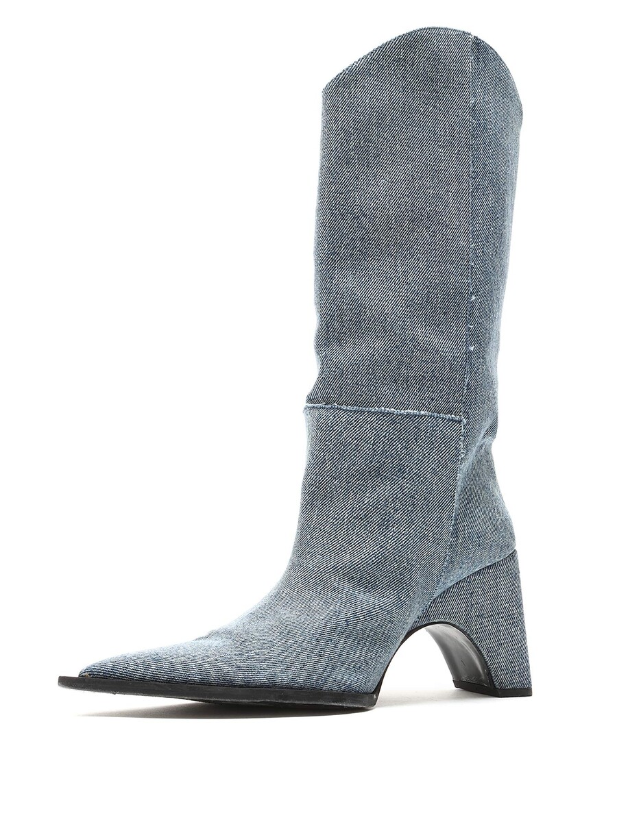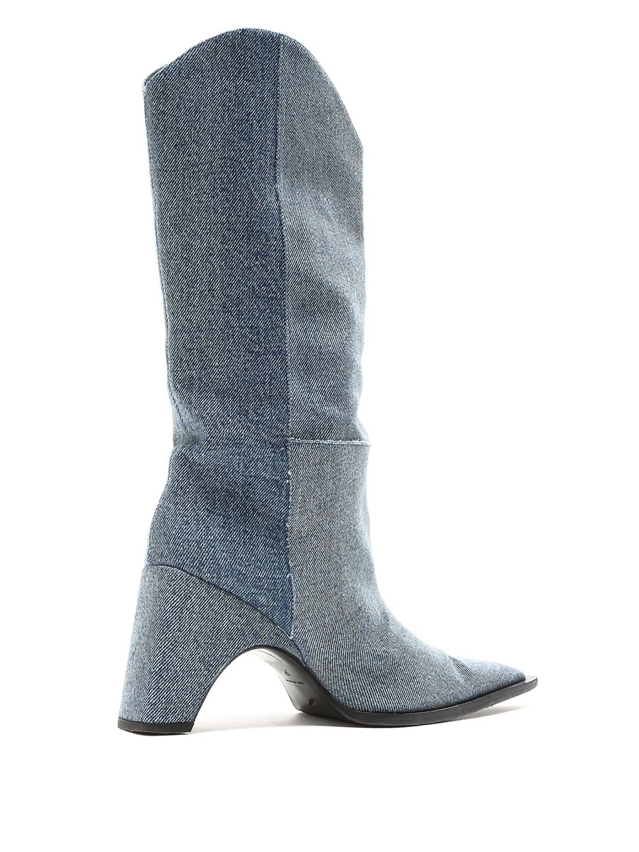 Bottes en denim bleu à hauteur de genou avec un design matelassé. Style à bout pointu. Semelle en cuir.
