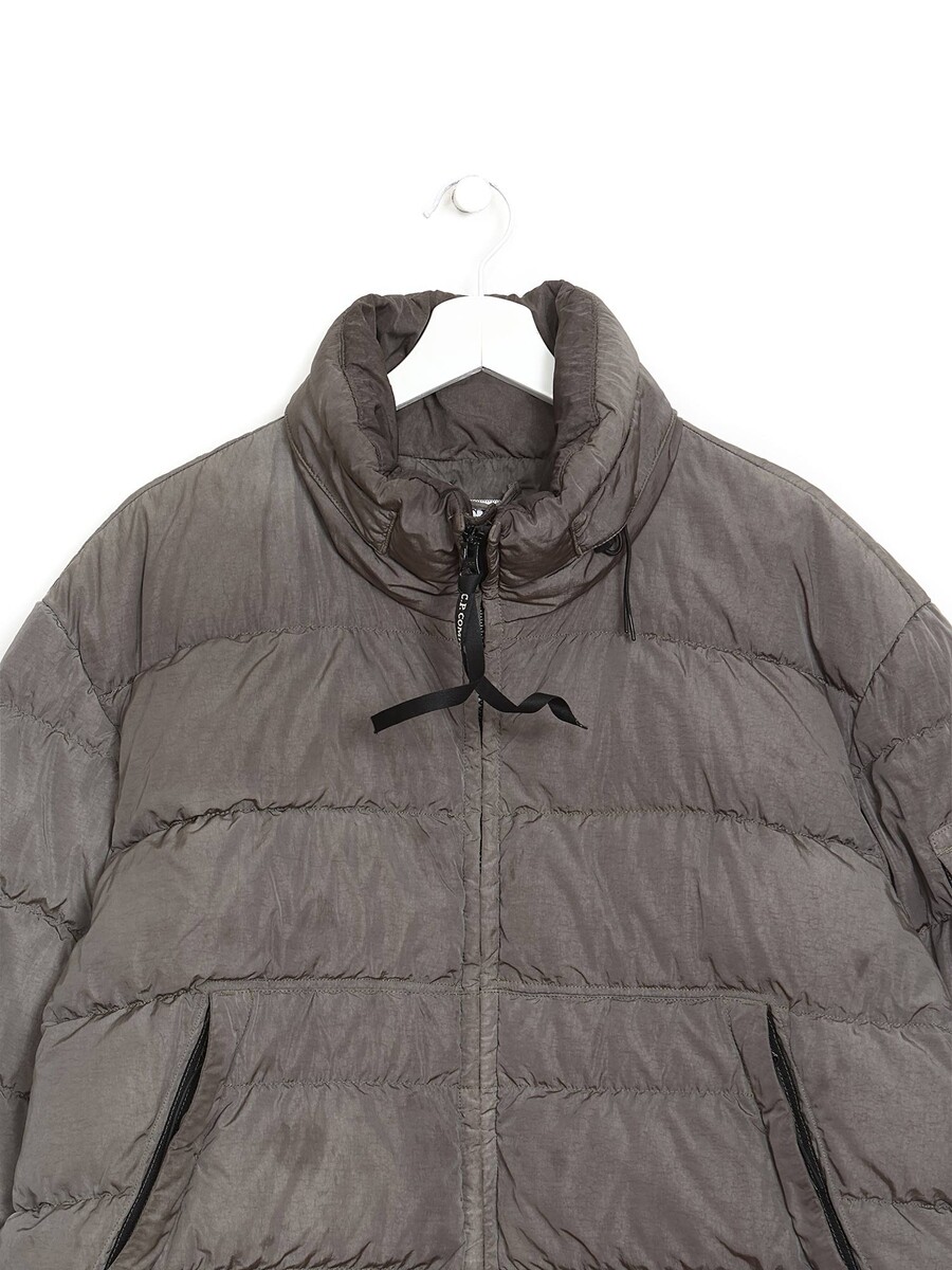 Veste matelassée à manches longues avec capuche et cordons de serrage. Fermeture à glissière. Poches à rabat. Fabriquée en Eco-Chrome R avec un rembourrage en duvet de canard gris.