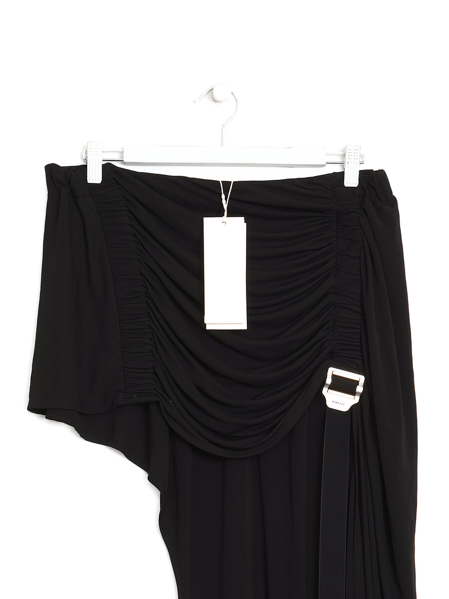 Minijupe froncée asymétrique en noir. Boucle en métal bicolore au devant, ajoutant une touche de sophistication audacieuse. Avec étiquette.