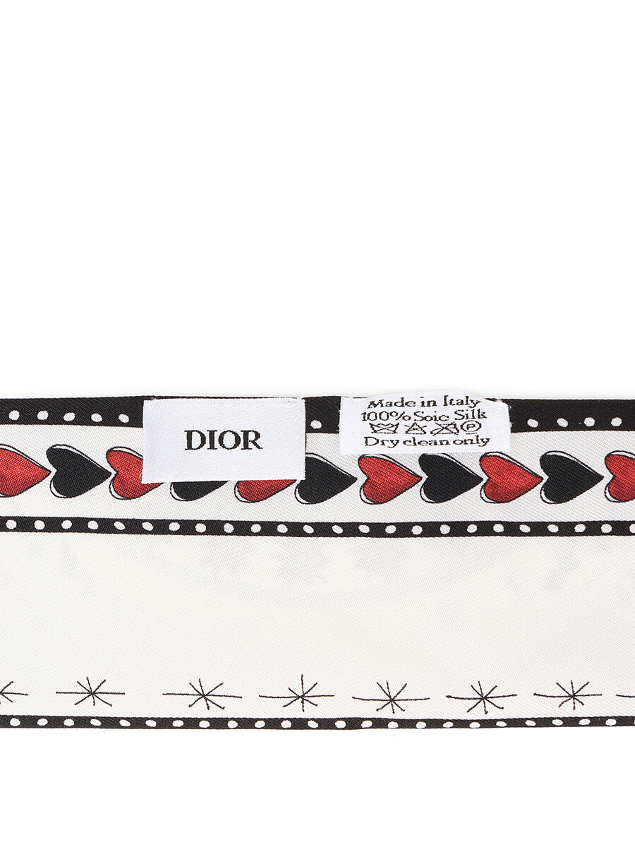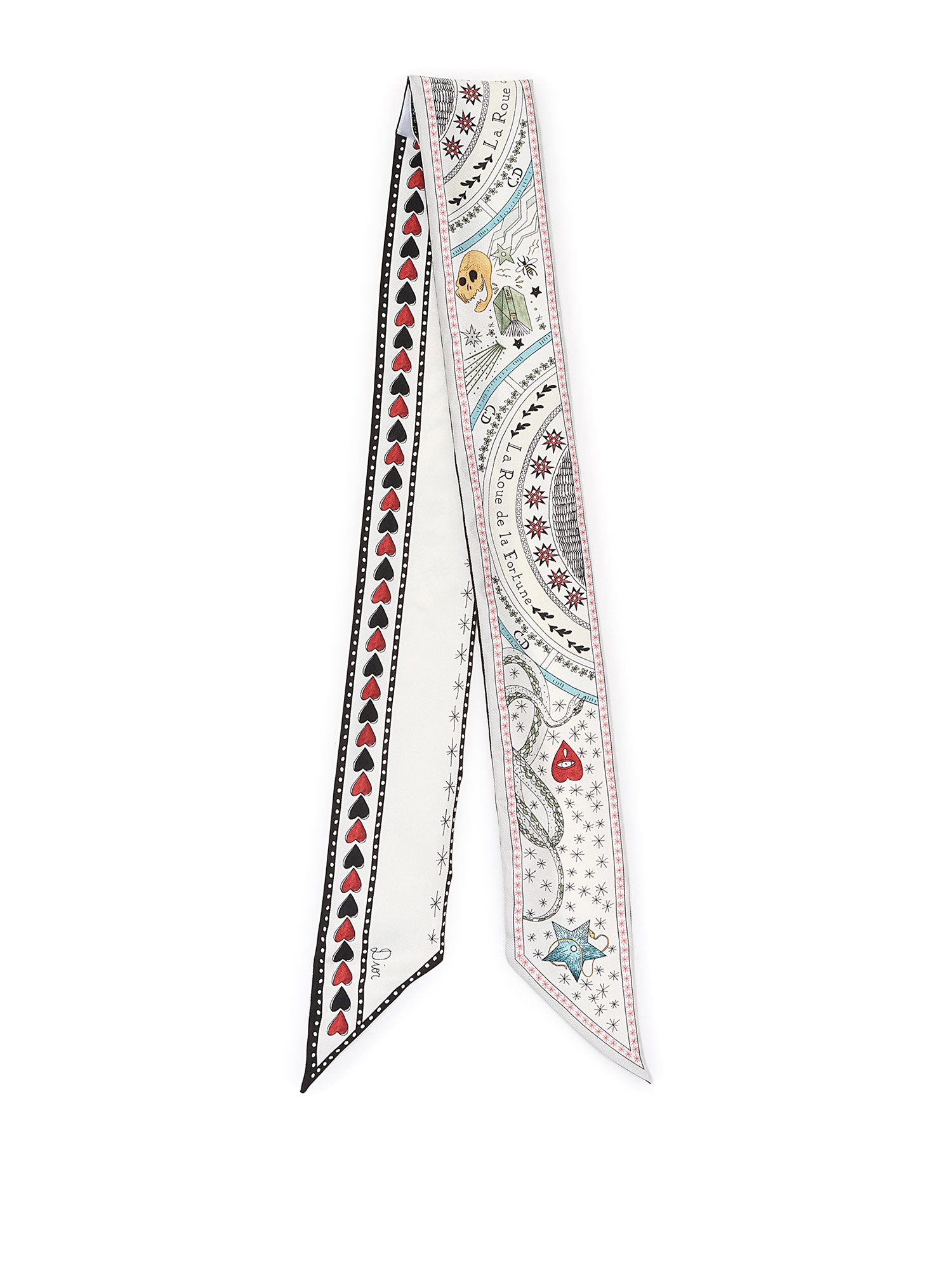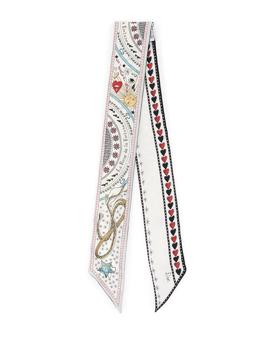 Foulard en soie au motif inspiré des tarots, blanc avec des touches de rouge, noir, bleu et or. Avec boîte estampillée Dior.