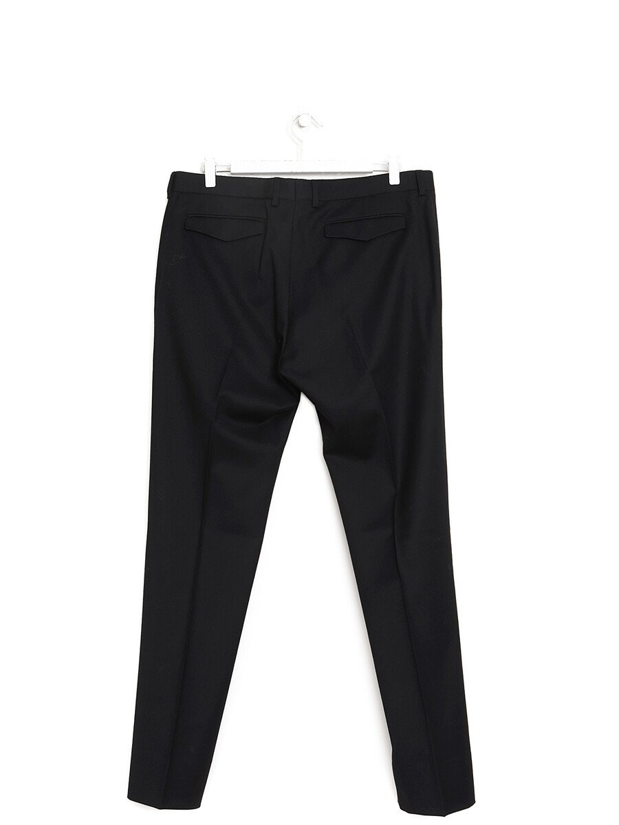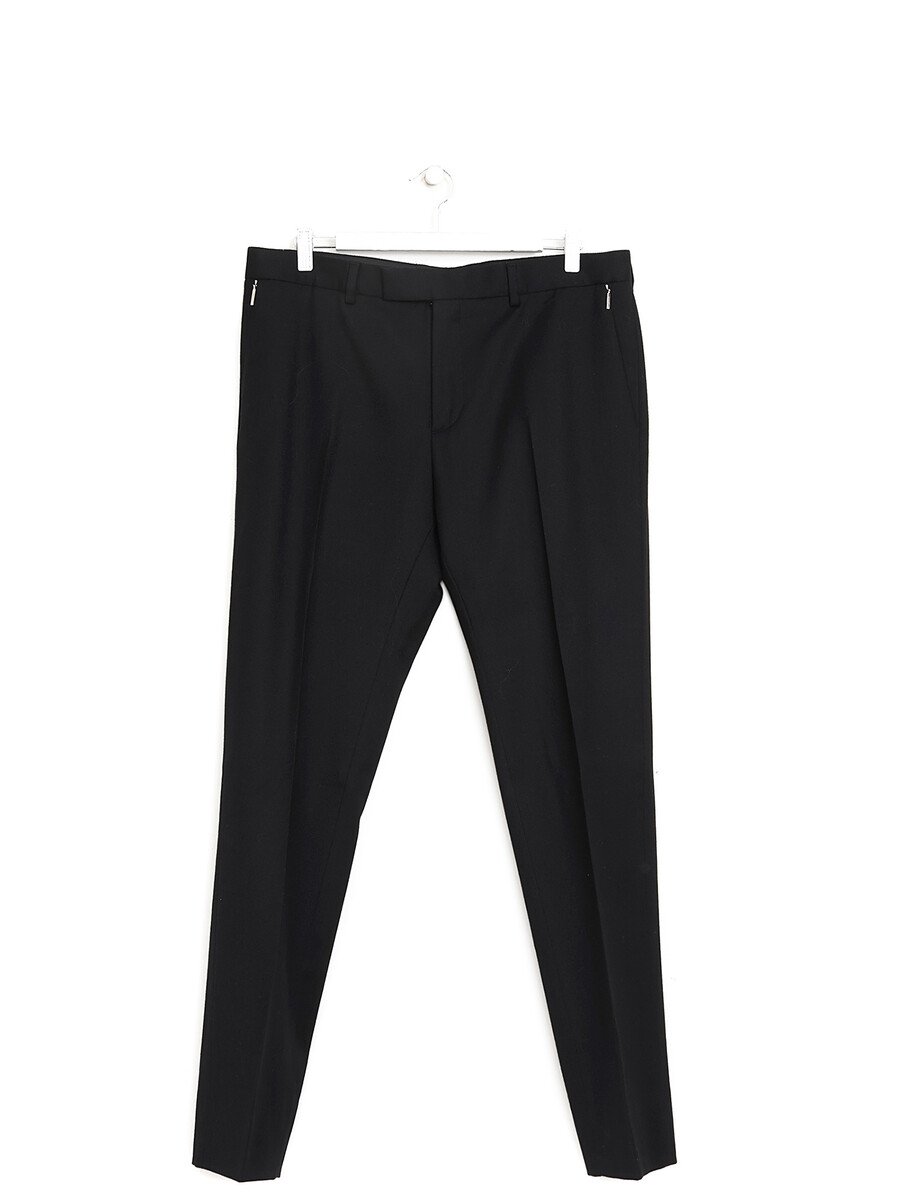 Pantalon à jambe étroite en laine de couleur noire. Poches fermetures éclair latérales. Fermeture éclair dissimulée à l'avant. Silhouette ajustée aux lignes épurées.