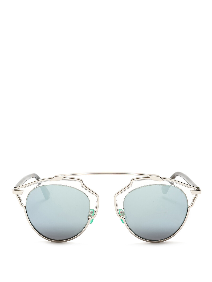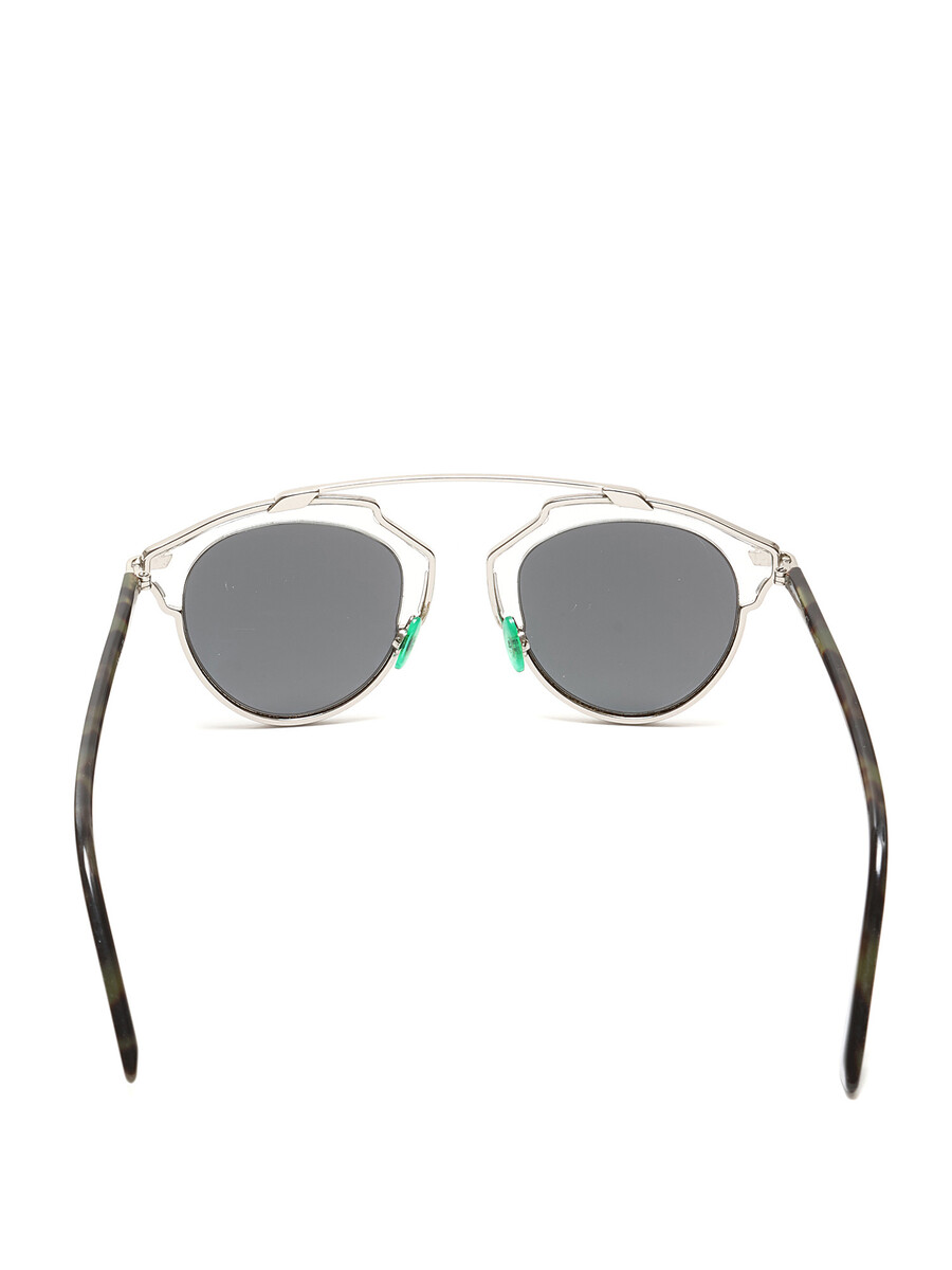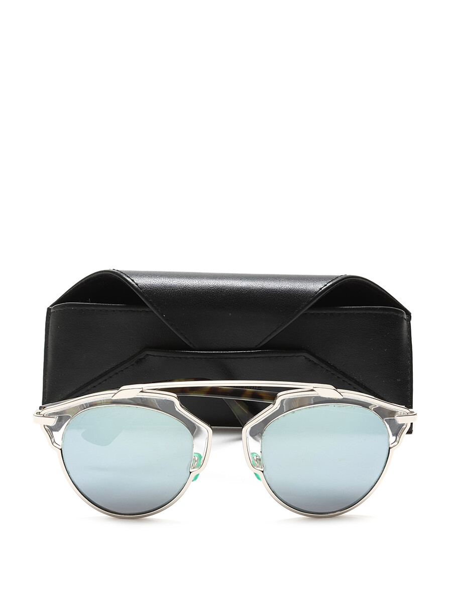 Lunettes de soleil rondes à monture argentée avec verres teintés argent. Branches en métal avec extrémités en écailles.