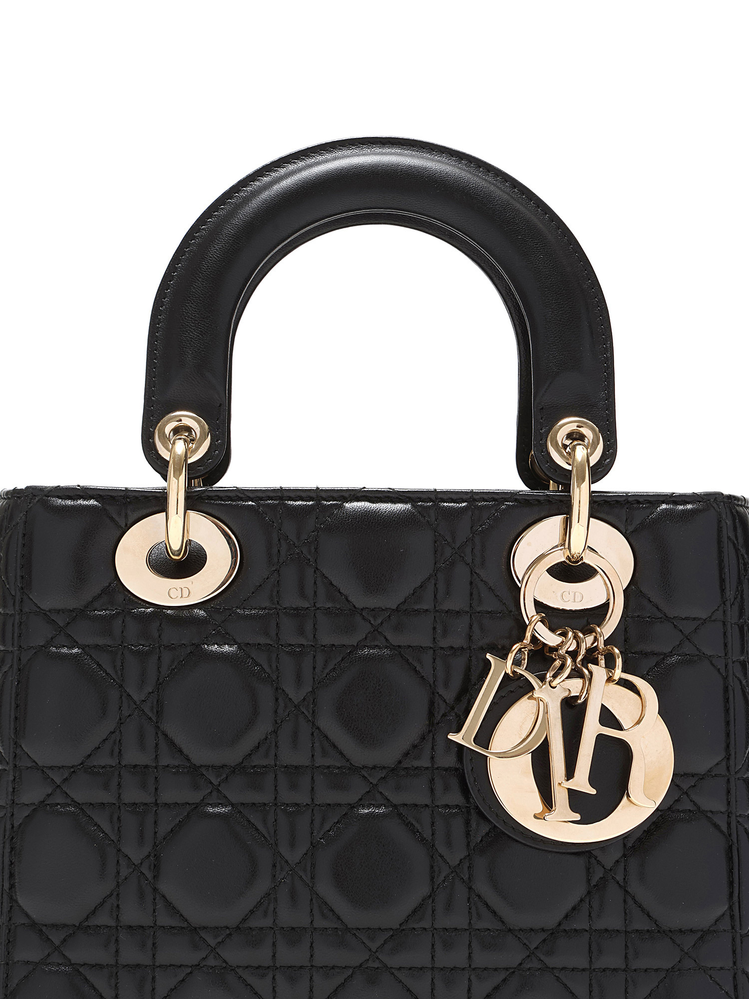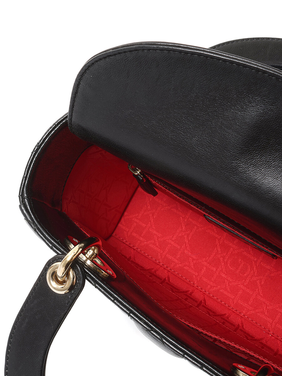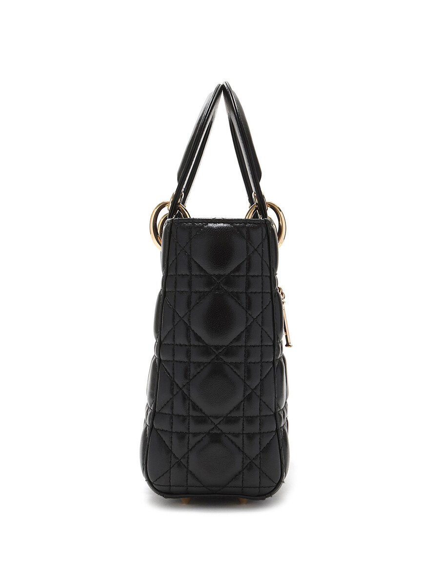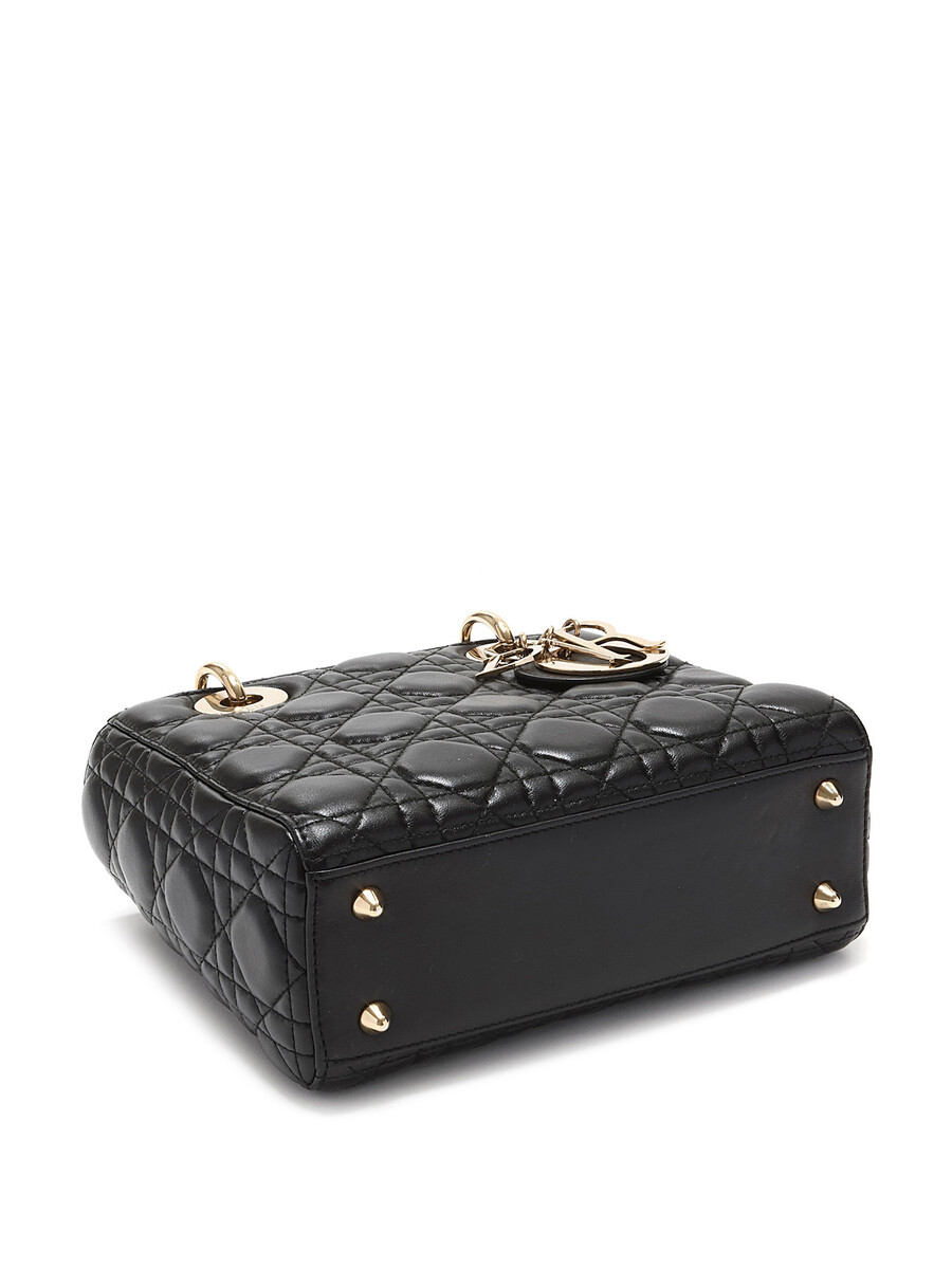 Sac à main en cuir matelassé 'cannage' noir avec anses supérieures et bandoulière amovible. Fermeture à rabat. Ferrures en métal doré gravées du logo. Pieds protecteurs au fond.