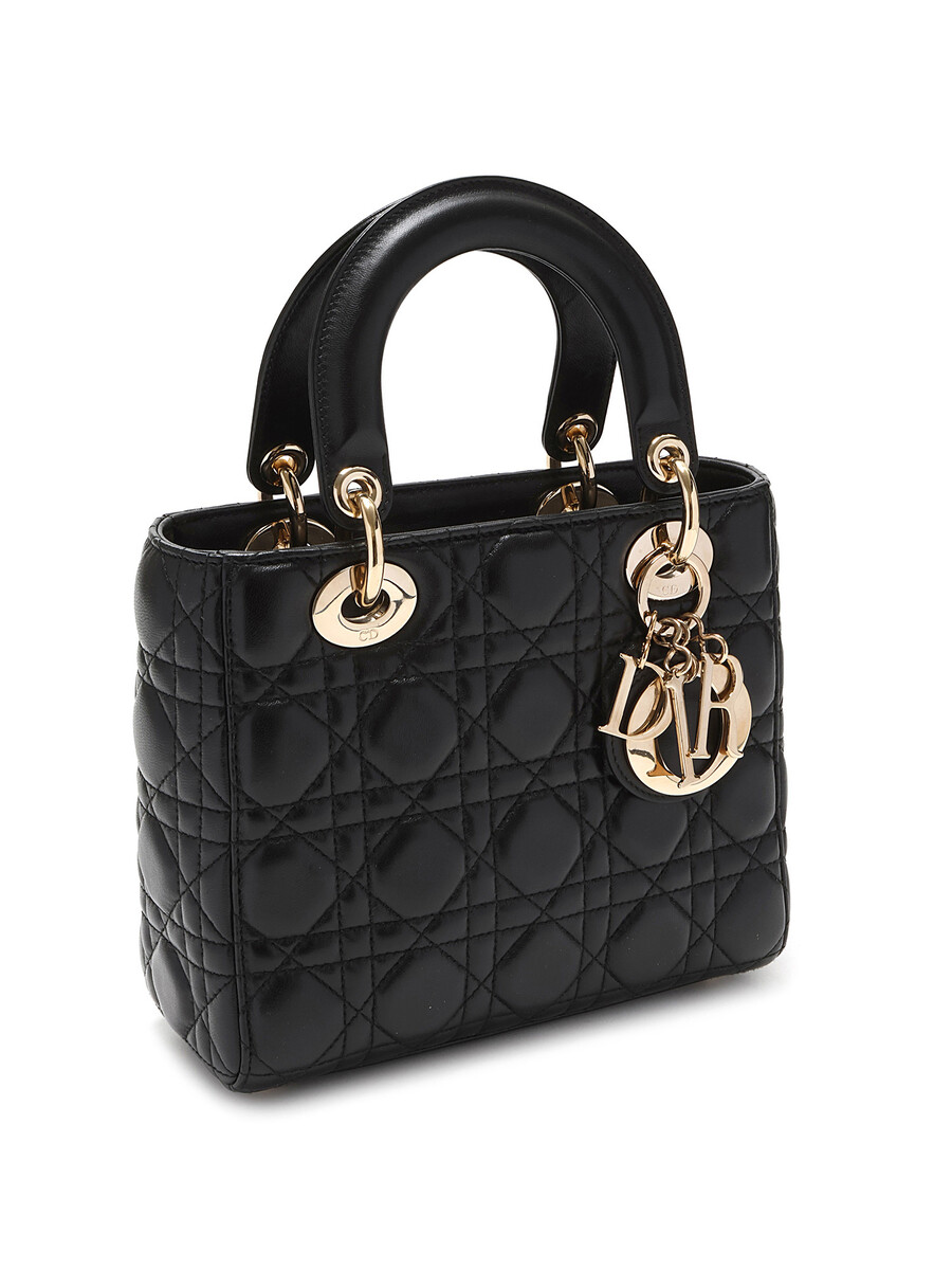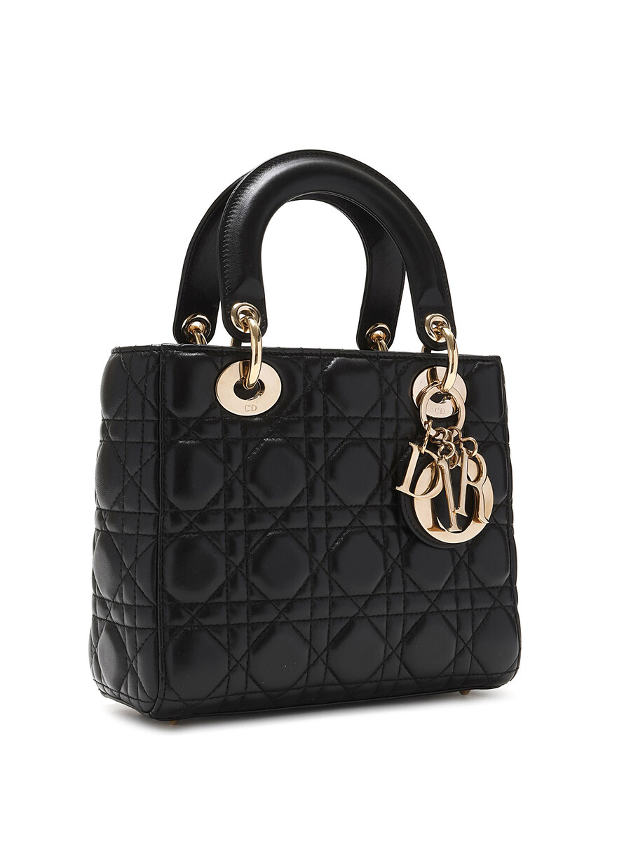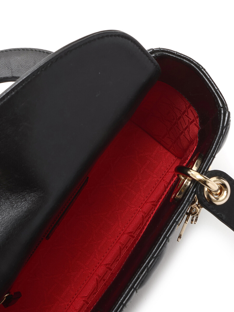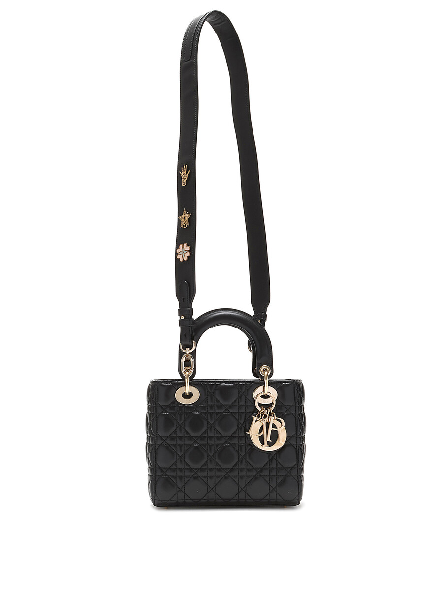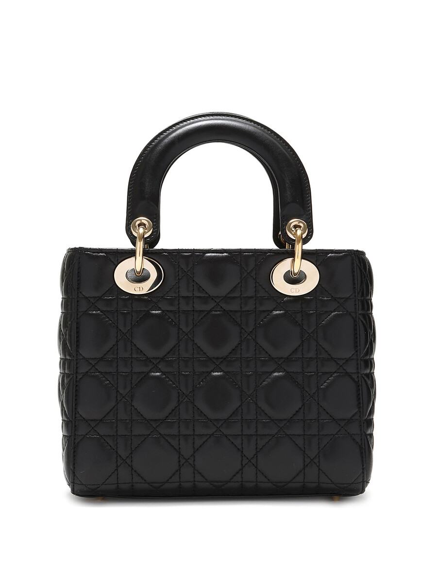 Sac à main en cuir matelassé 'cannage' noir avec anses supérieures et bandoulière amovible. Fermeture à rabat. Ferrures en métal doré gravées du logo. Pieds protecteurs au fond.