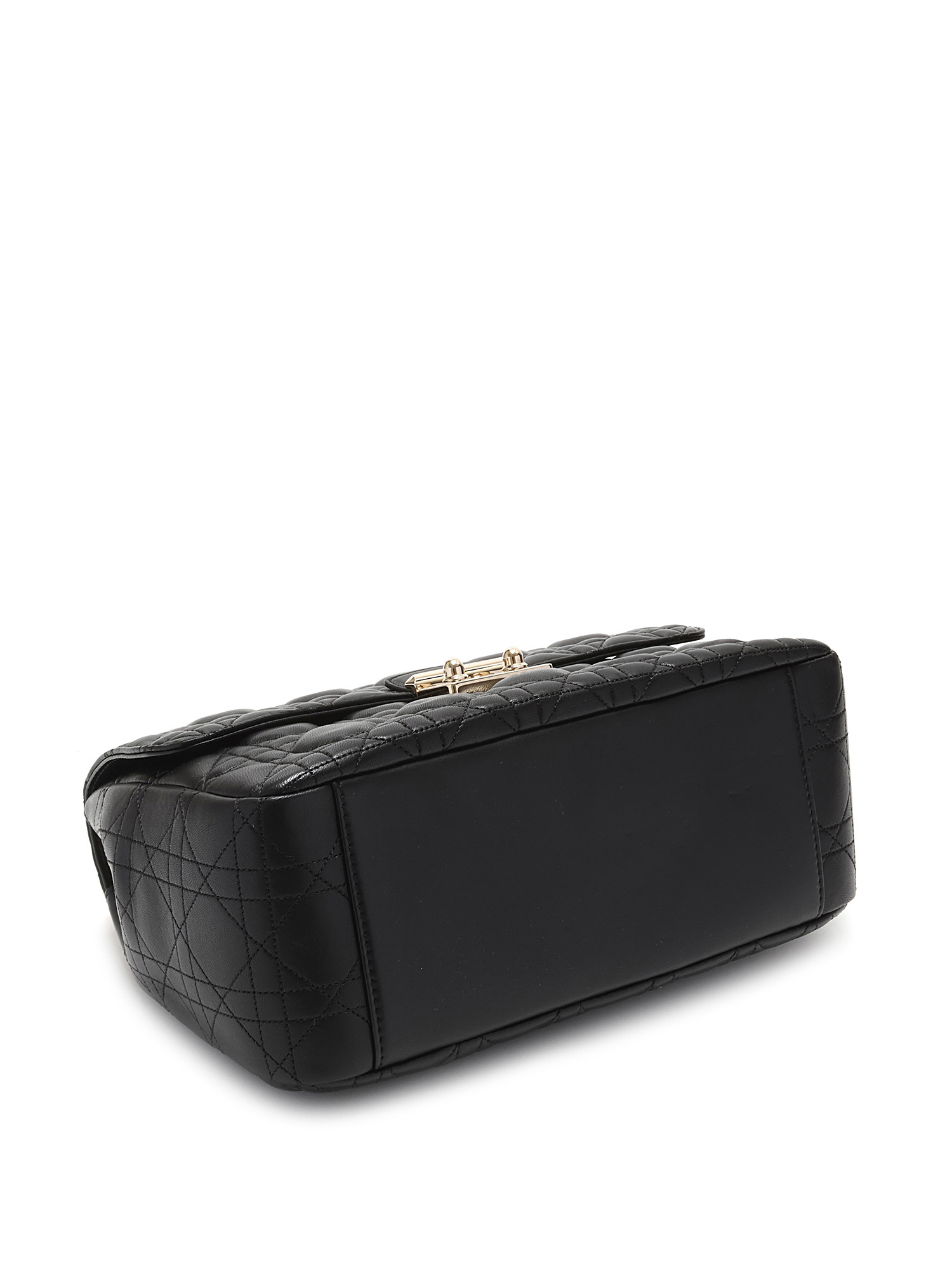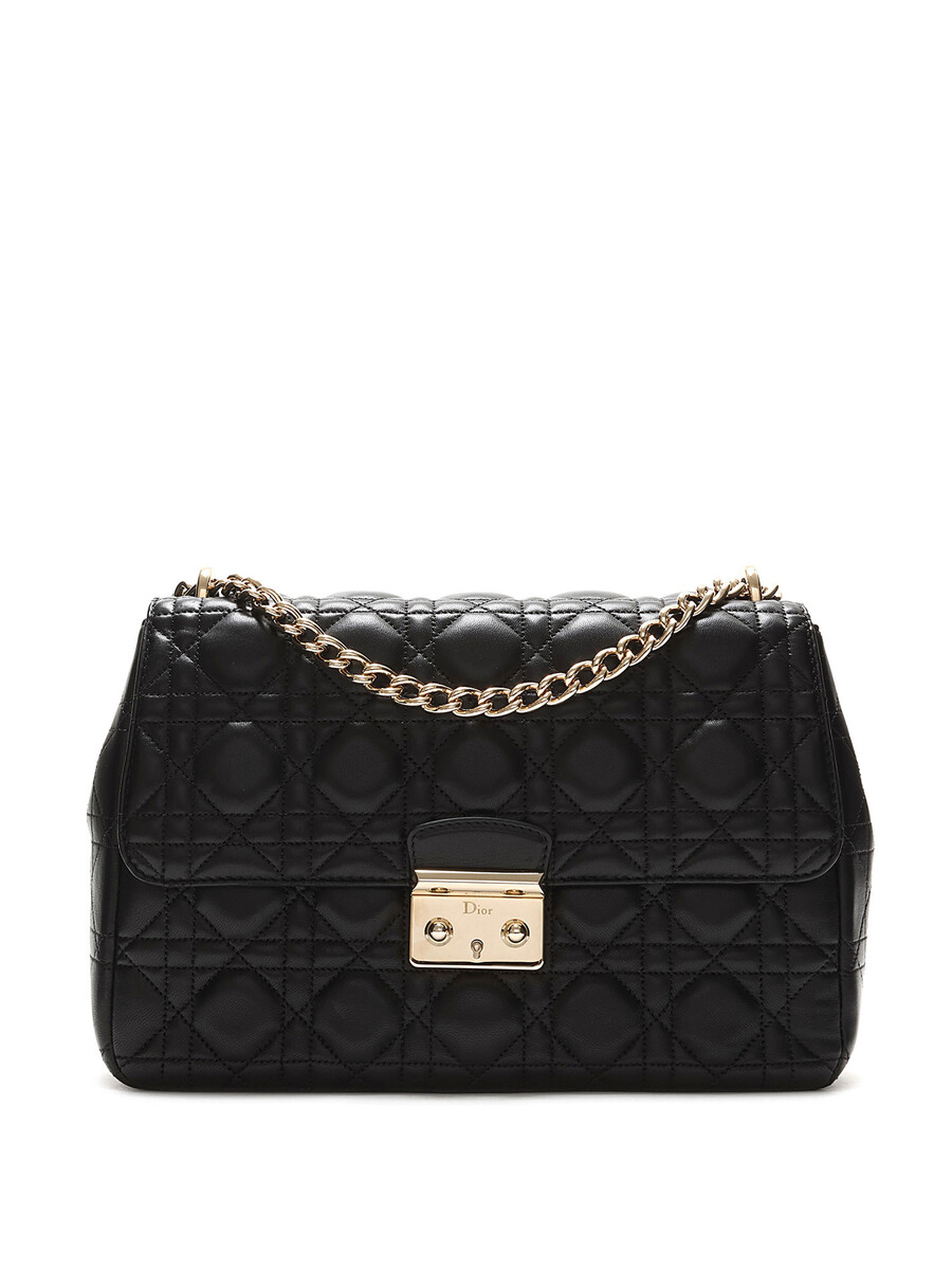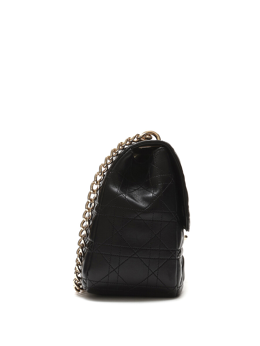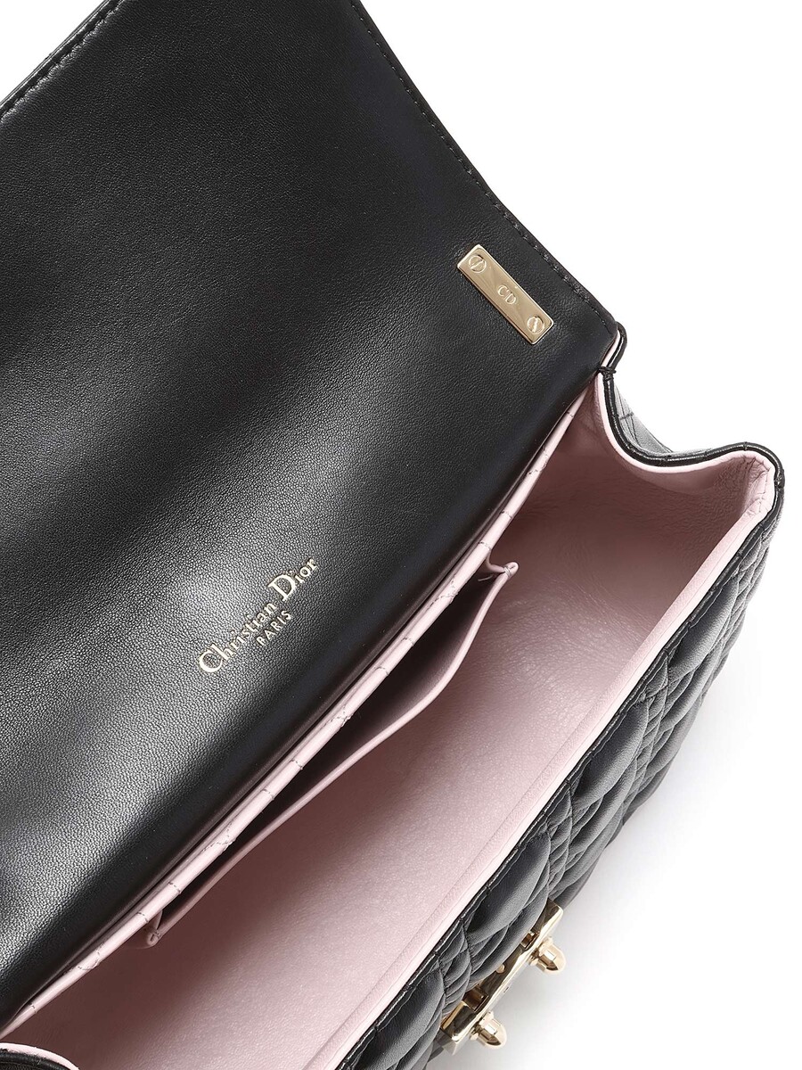 Sac à rabat en cuir d'agneau noir de taille moyenne avec le motif signature Cannage matelassé. Fermeture à verrou et quincaillerie dorée.