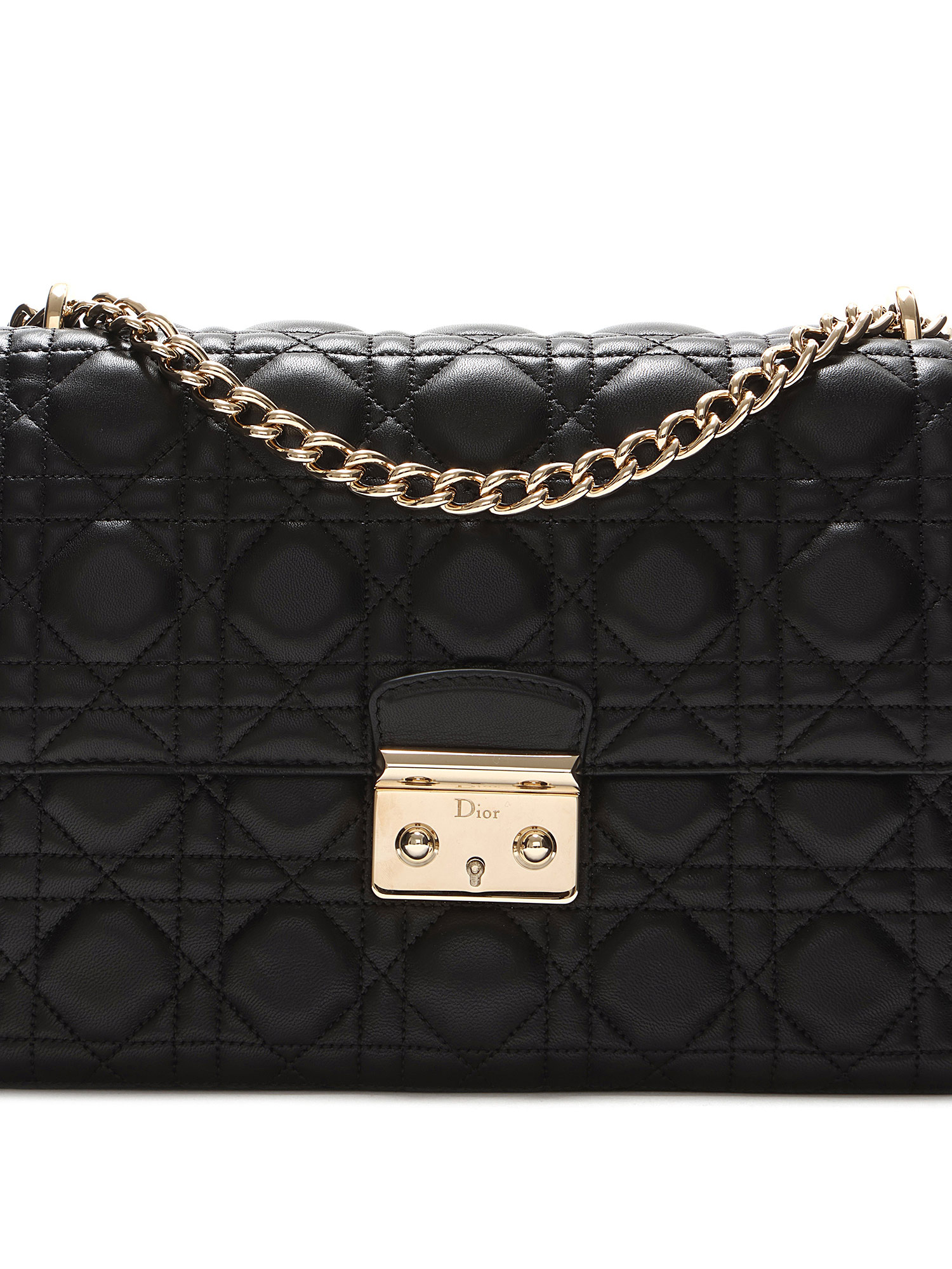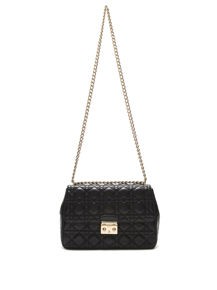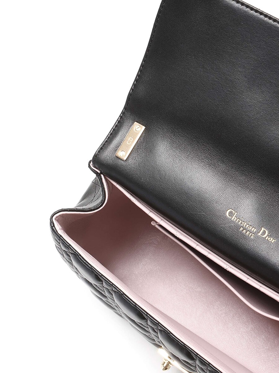 Sac à rabat en cuir d'agneau noir de taille moyenne avec le motif signature Cannage matelassé. Fermeture à verrou et quincaillerie dorée.