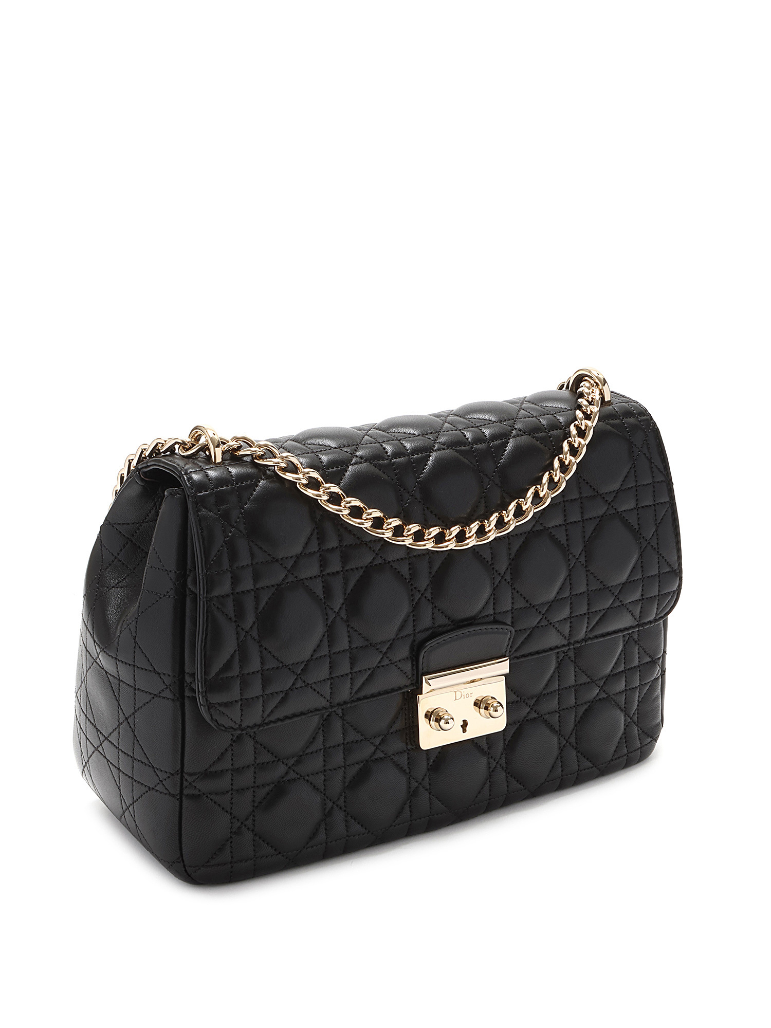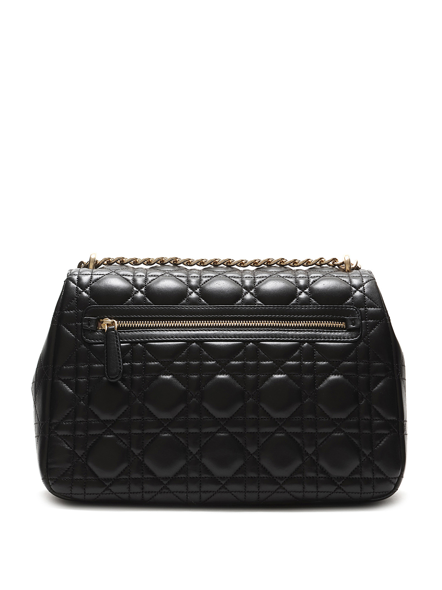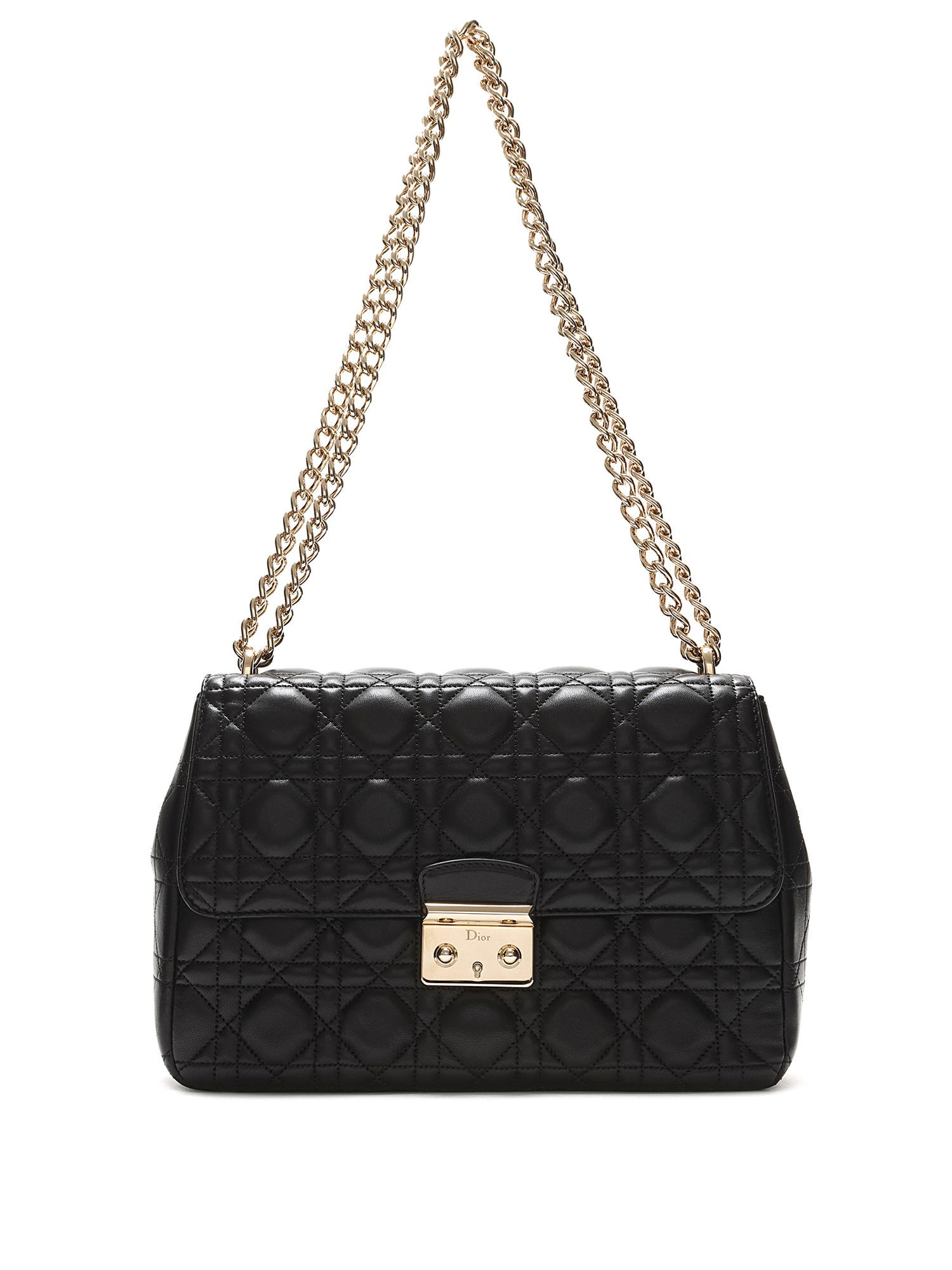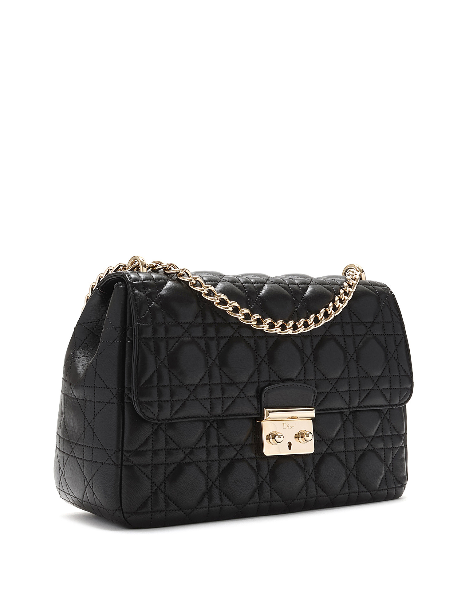 Sac à rabat en cuir d'agneau noir de taille moyenne avec le motif signature Cannage matelassé. Fermeture à verrou et quincaillerie dorée.