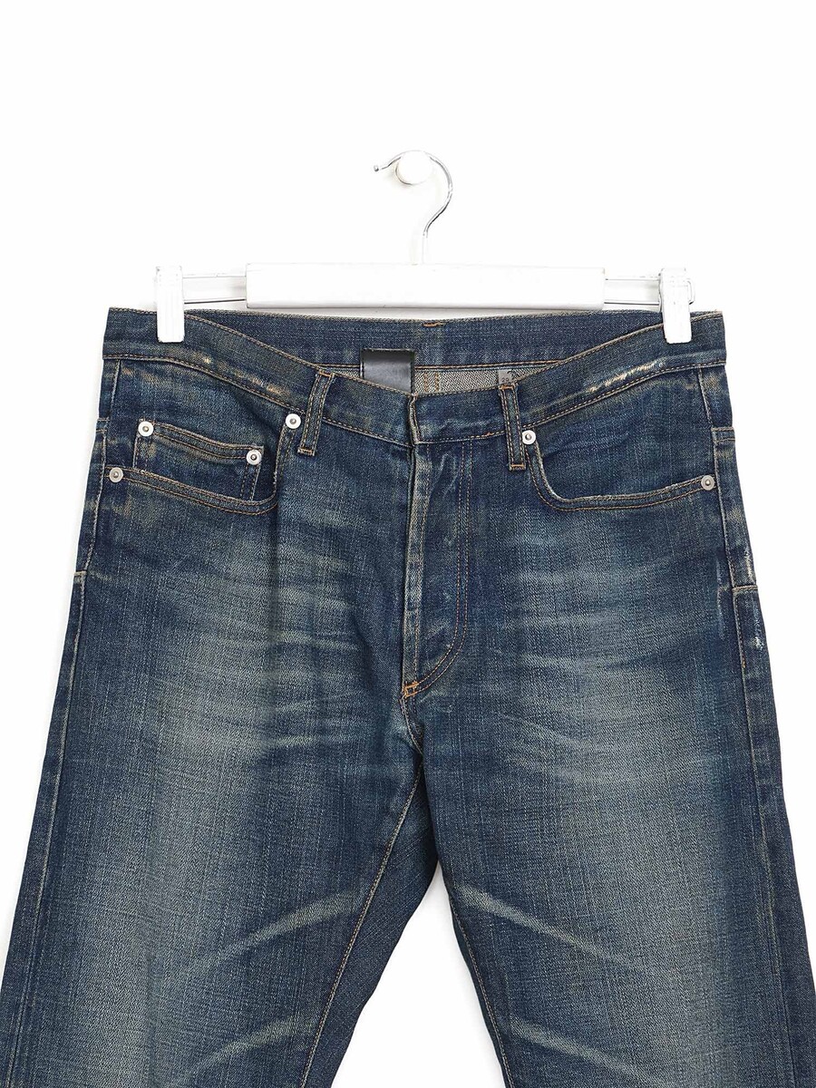 Jean en denim délavé bleu foncé à cinq poches classiques. Passants de ceinture et fermeture à bouton à la taille. Usure visible à l'ourlet et aux poches arrière.