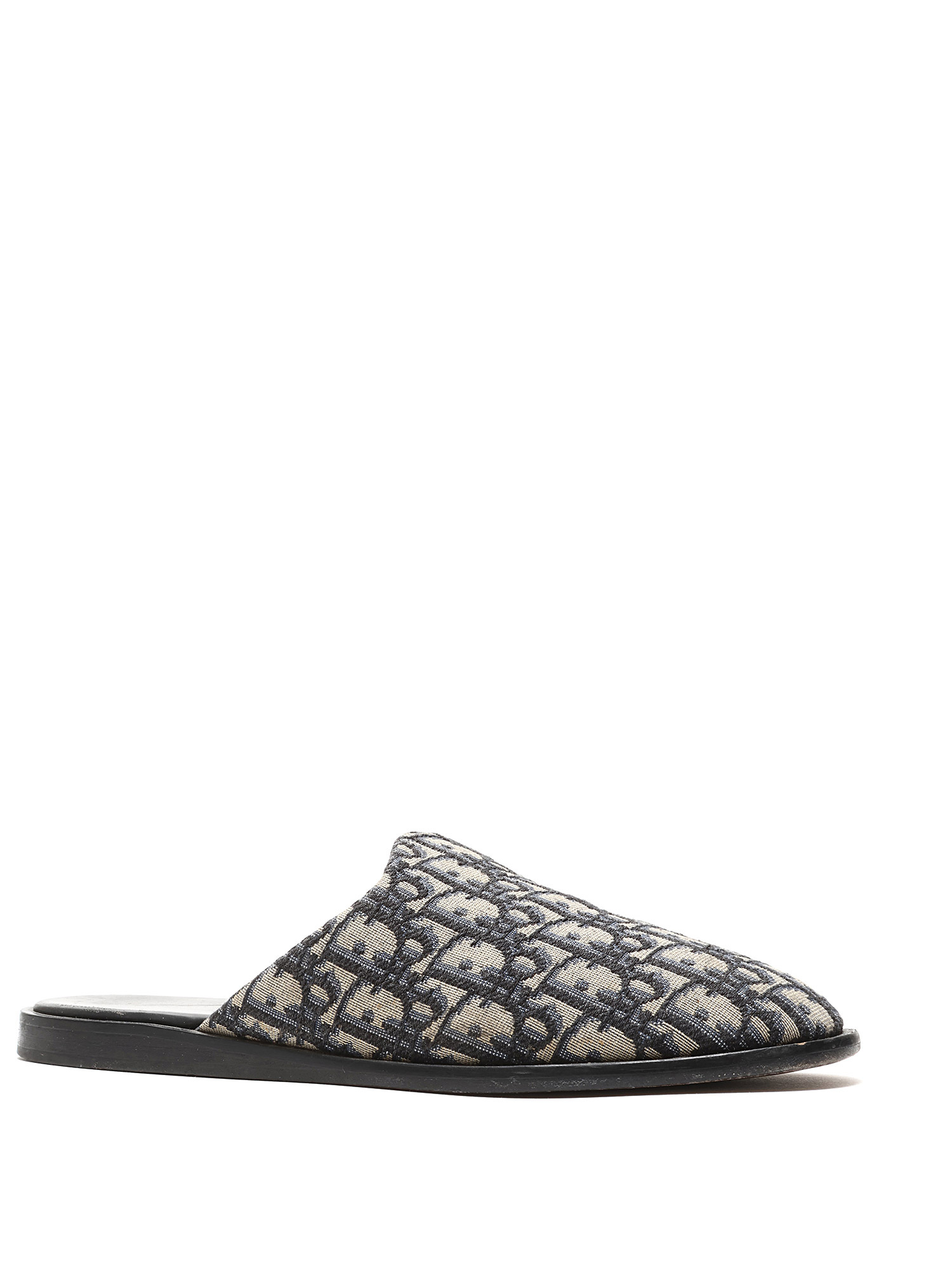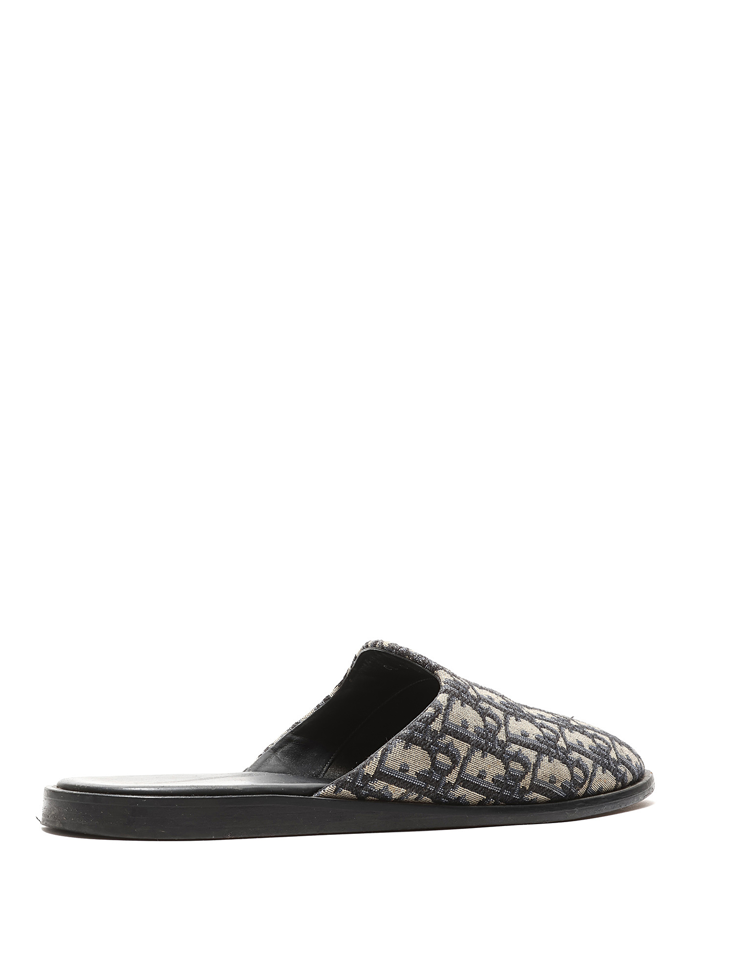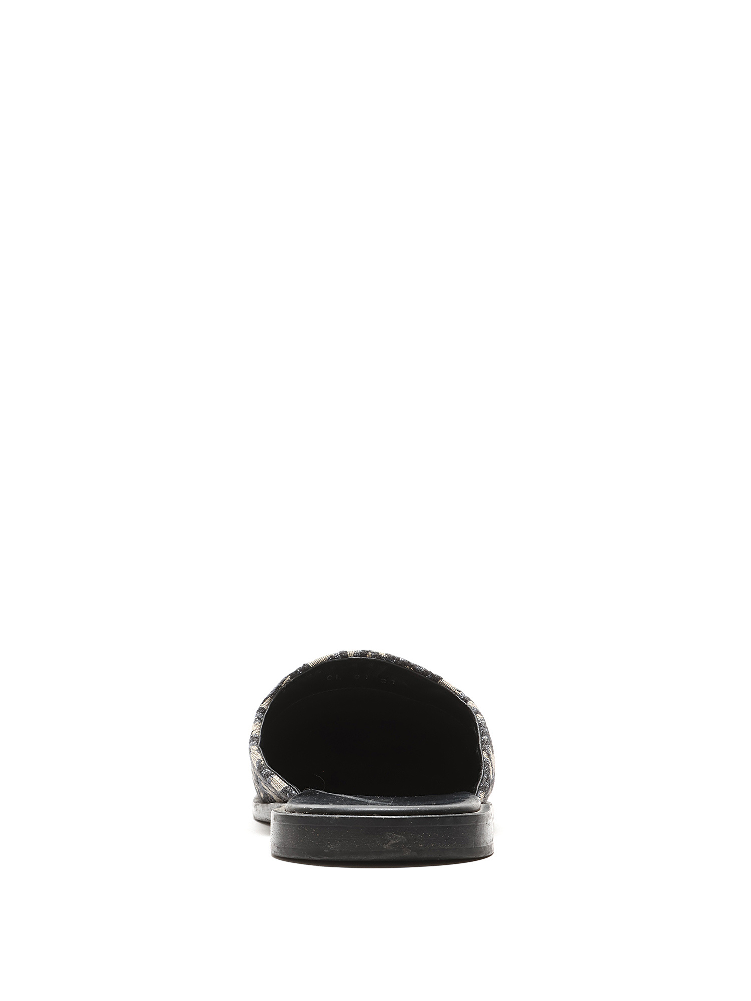 Mules en tissu à motif monogramme noir et beige. Design à enfiler avec bout rond fermé et semelle plate en caoutchouc.
