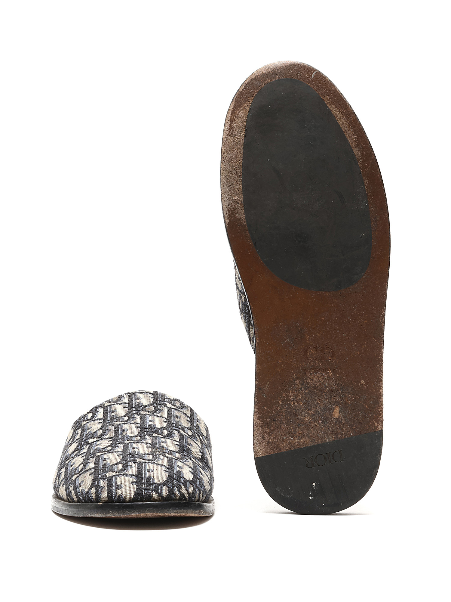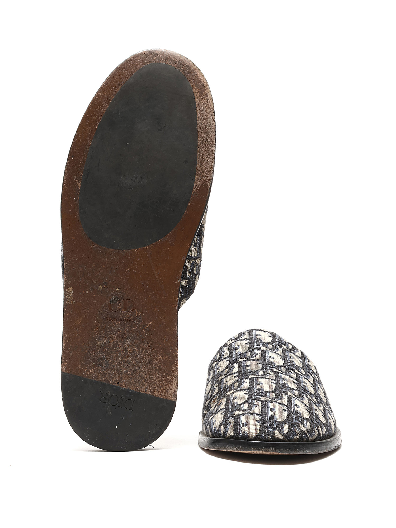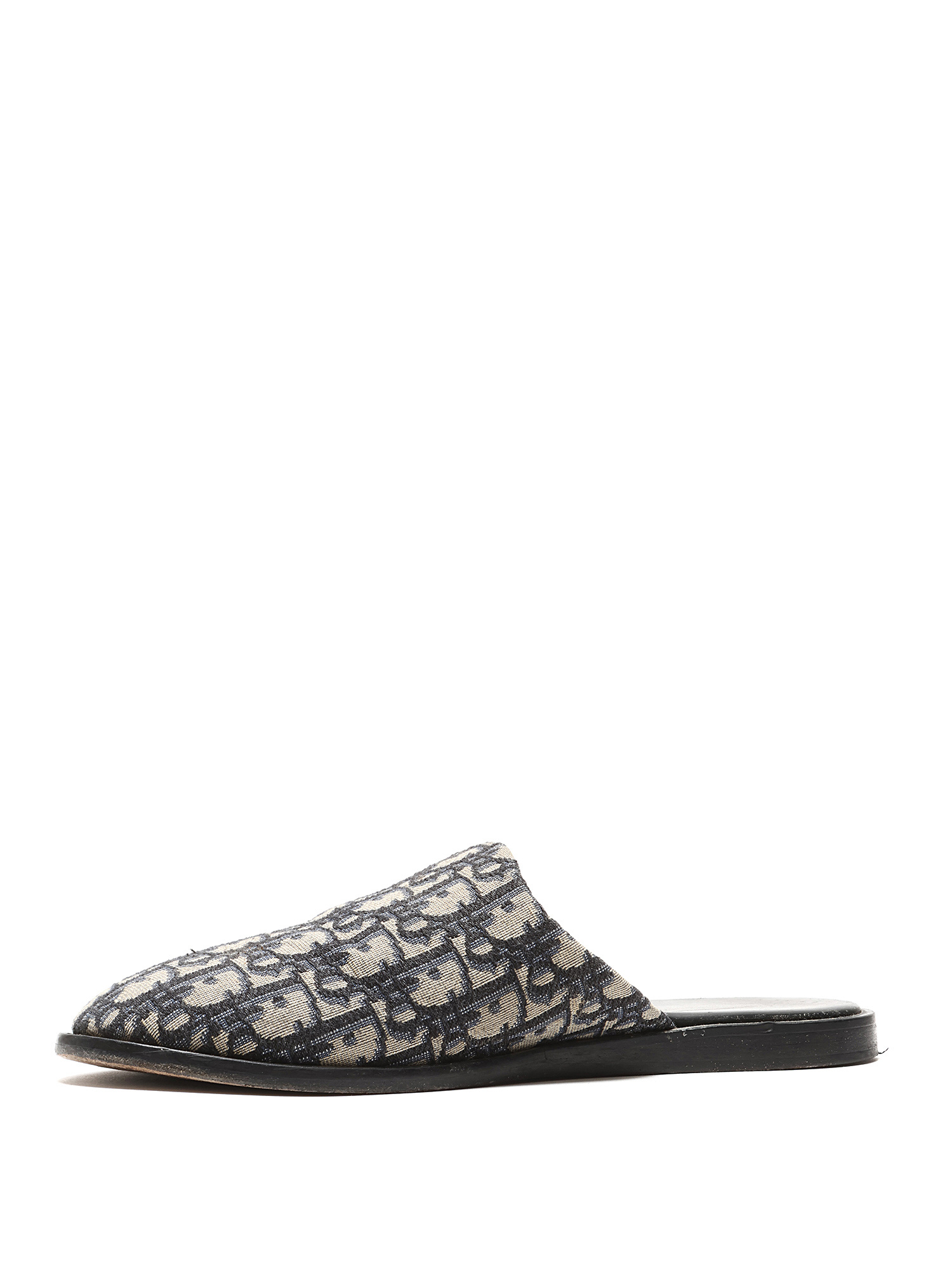 Mules en tissu à motif monogramme noir et beige. Design à enfiler avec bout rond fermé et semelle plate en caoutchouc.