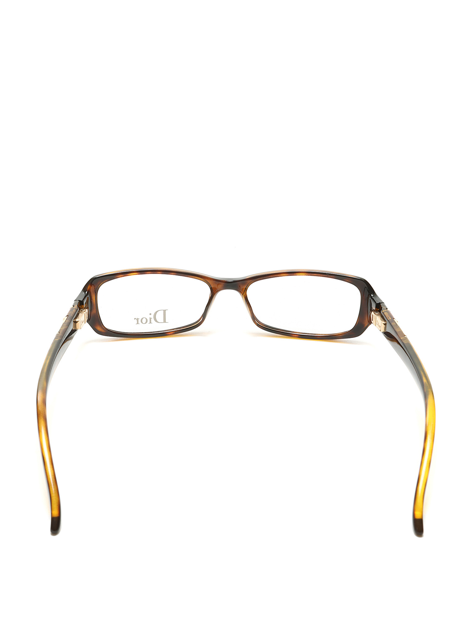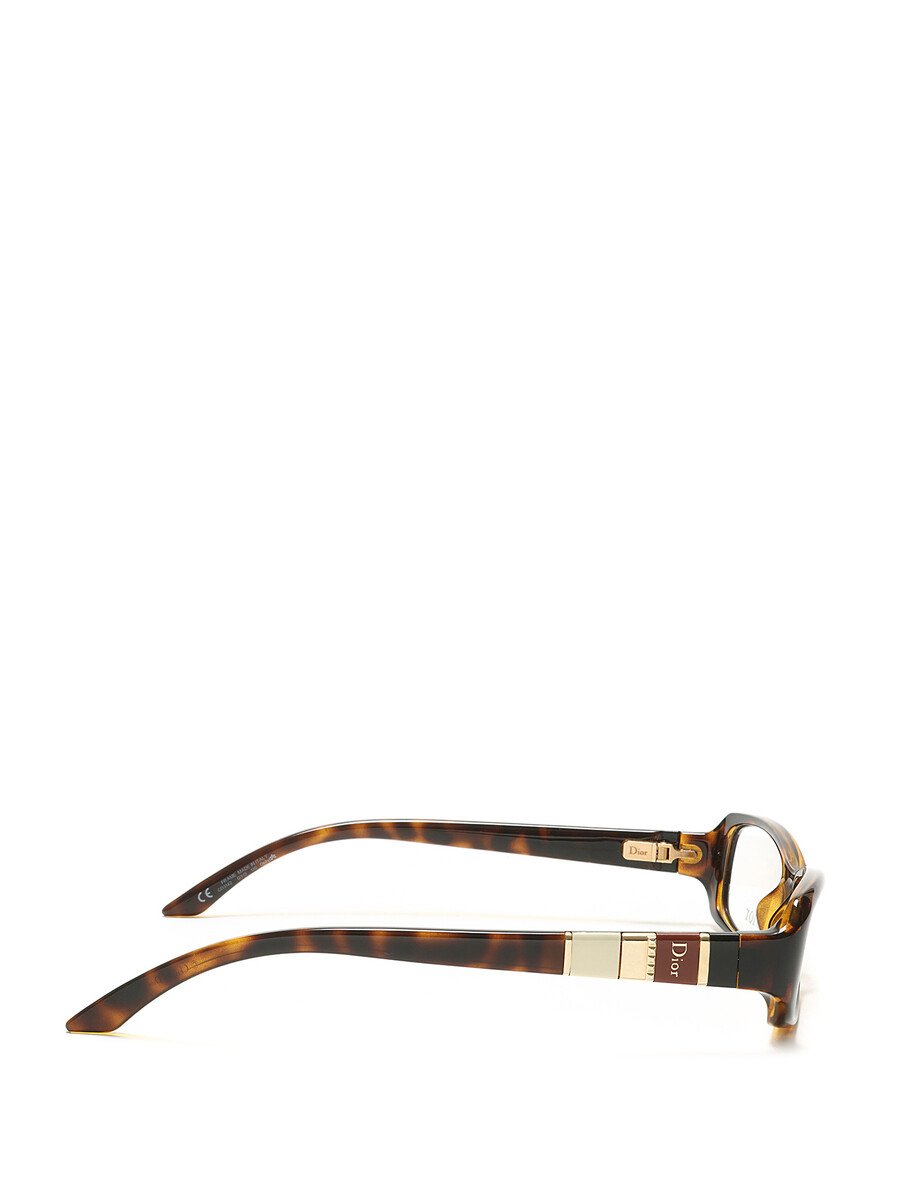 Lunettes rectangulaires en acétate à motif écaille-de-tortue. Logo en métal dorée sur les branches. Avec étui et boîte.