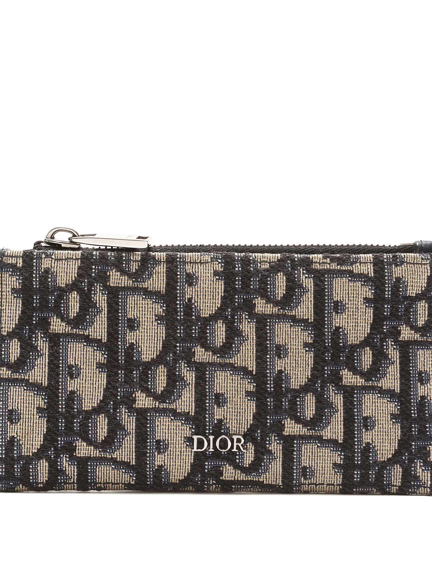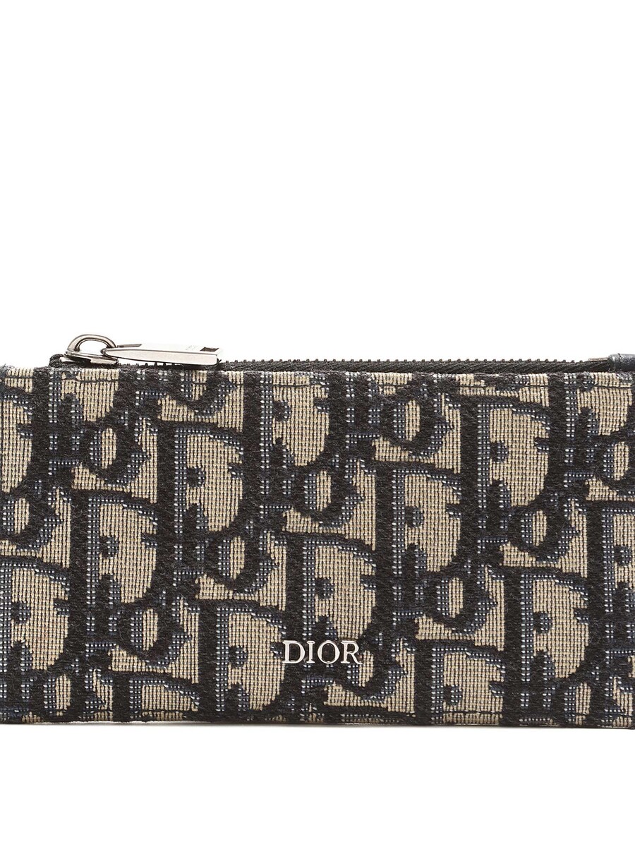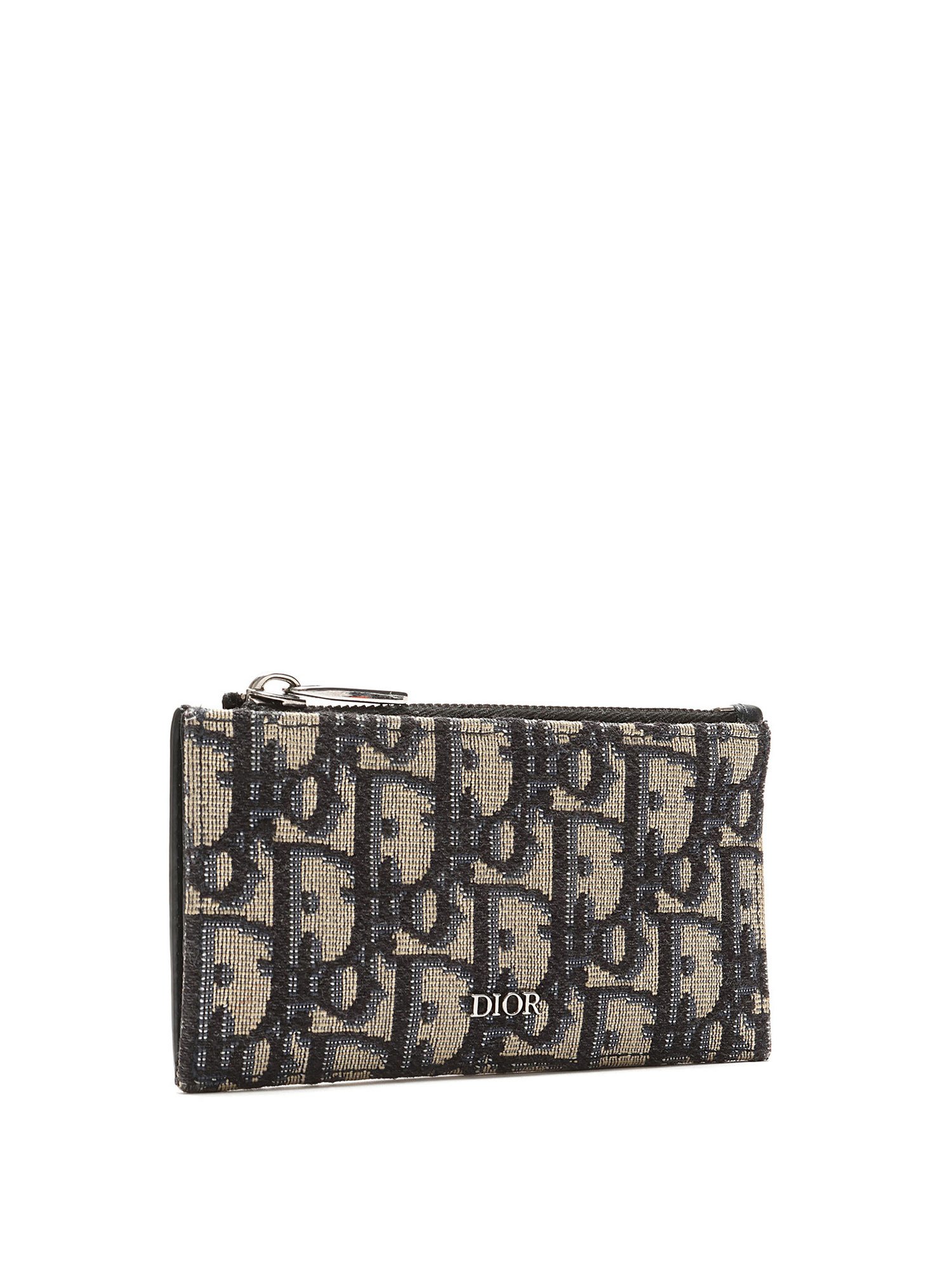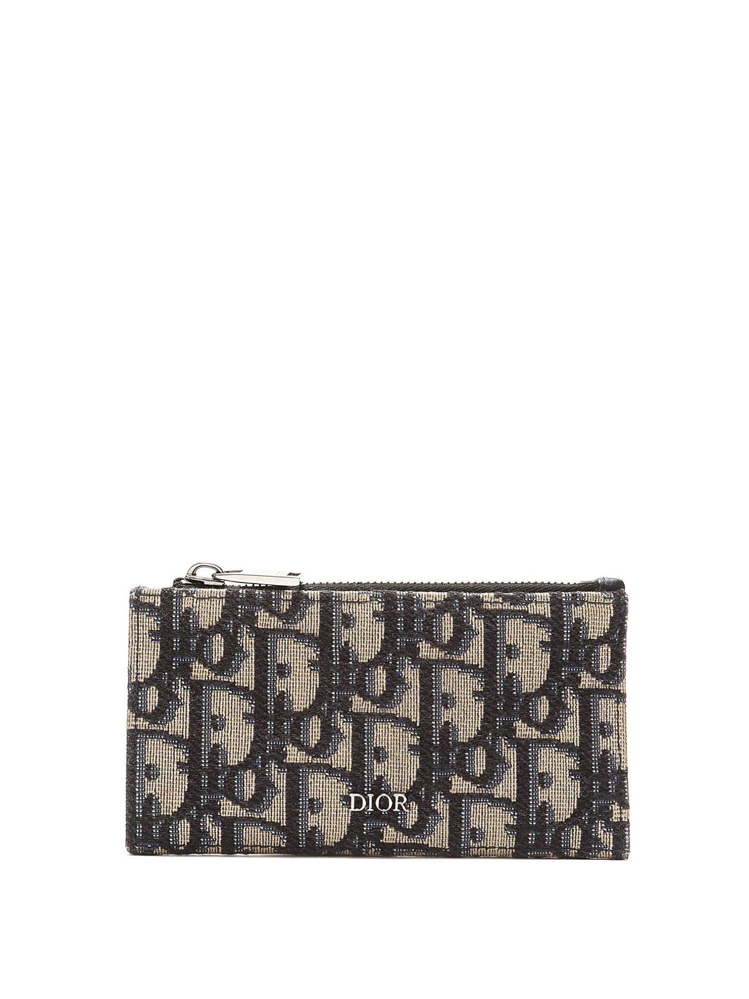 Porte-cartes en toile et cuir avec motif Dior Oblique en bleu marine, noir et beige. Fermeture à glissière. Avec boîte.