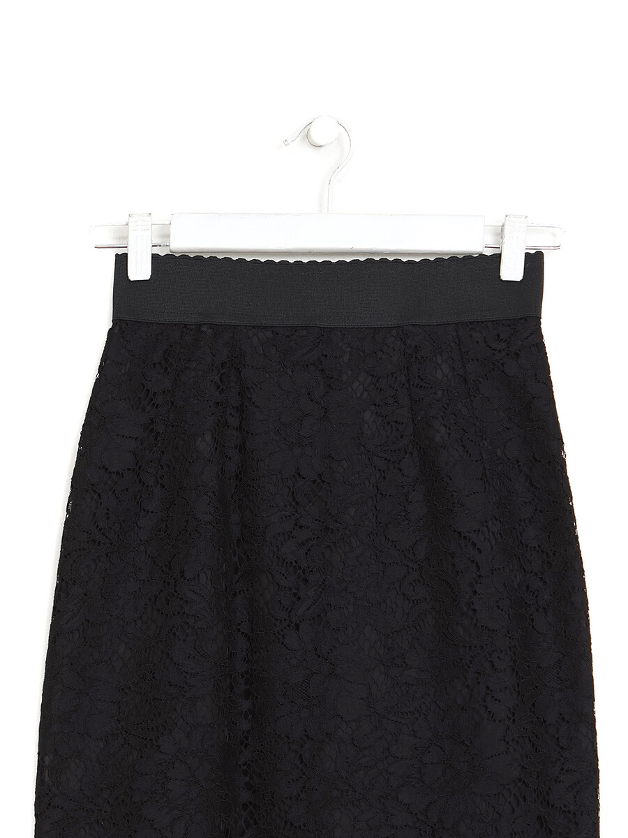 Jupe crayon noire avec superposition en dentelle florale. Fermeture éclair au dos.