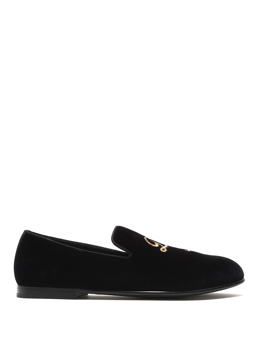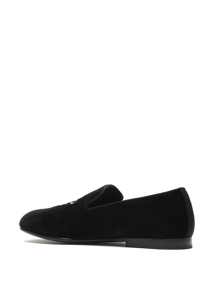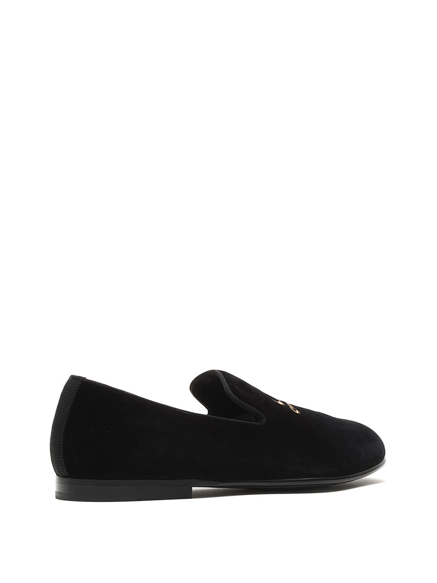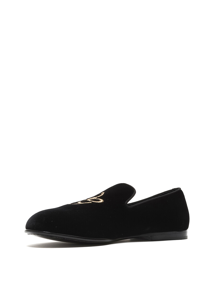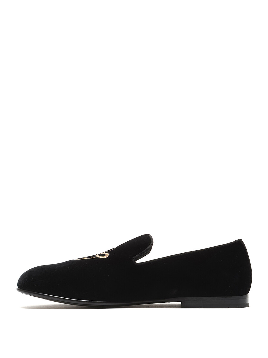 Mocassins en velours noirs classiques avec initiales brodées en or. Modèle à enfiler. Bout rond fermé. Semelle plate en cuir.