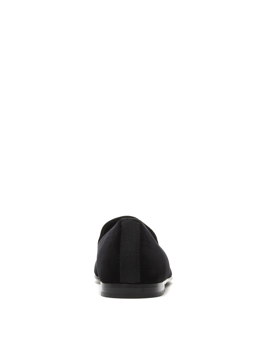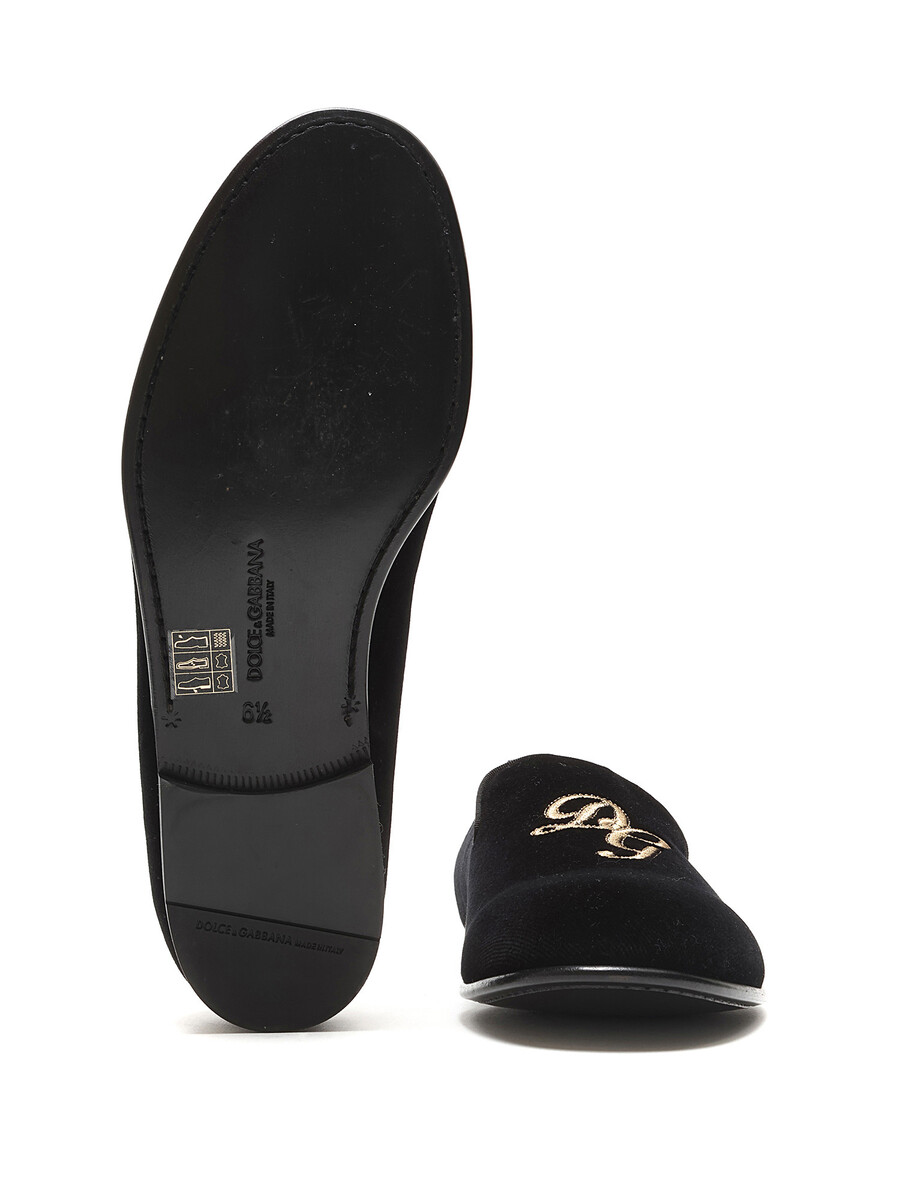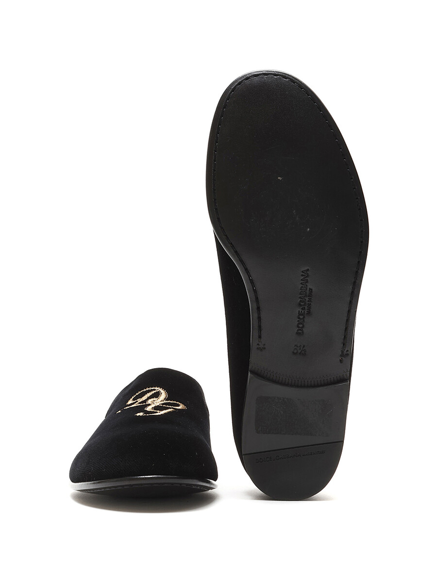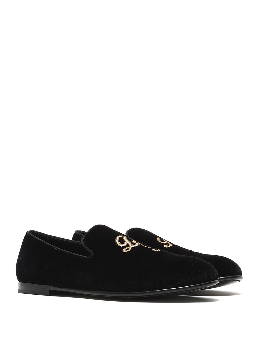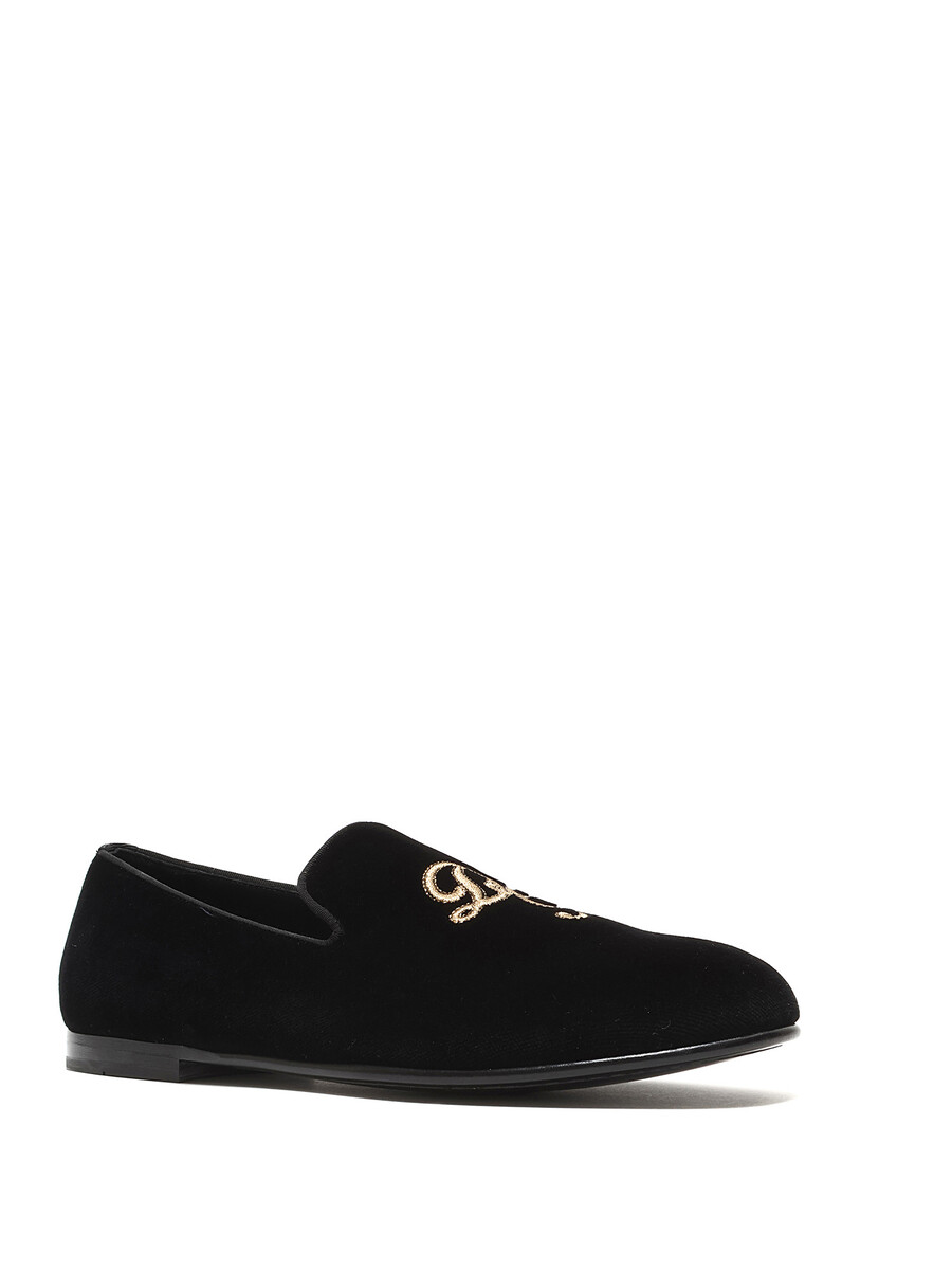 Mocassins en velours noirs classiques avec initiales brodées en or. Modèle à enfiler. Bout rond fermé. Semelle plate en cuir.