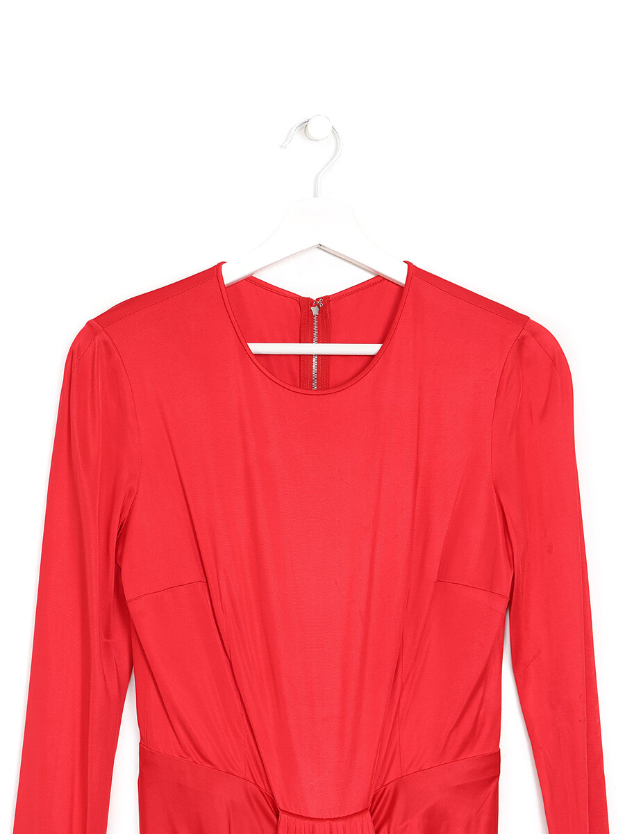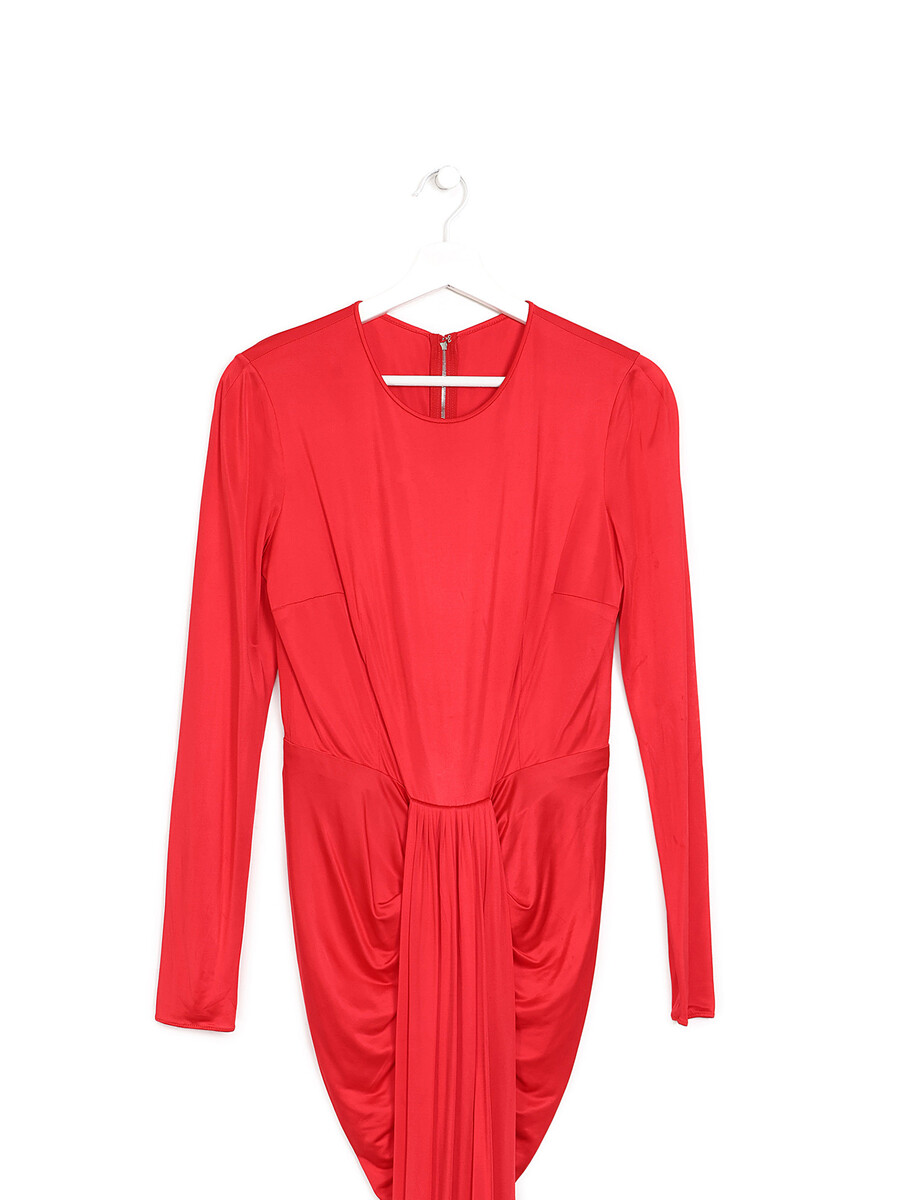 Robe du soir élégante à manches longues en tissu extensible rouge vif. Silhouette simple mais saisissante.