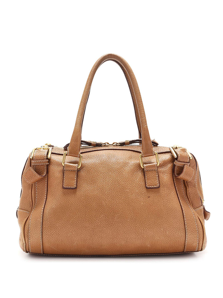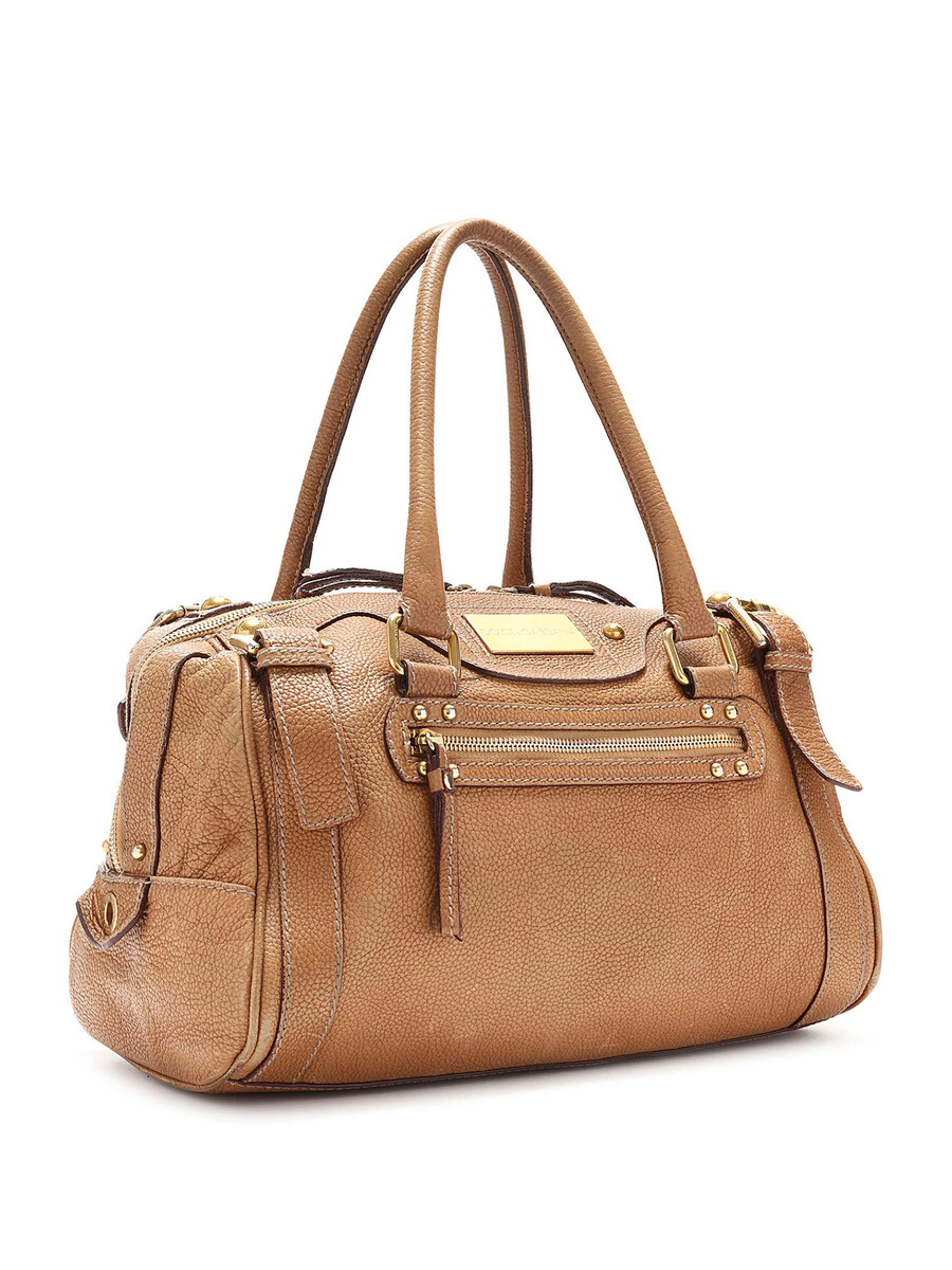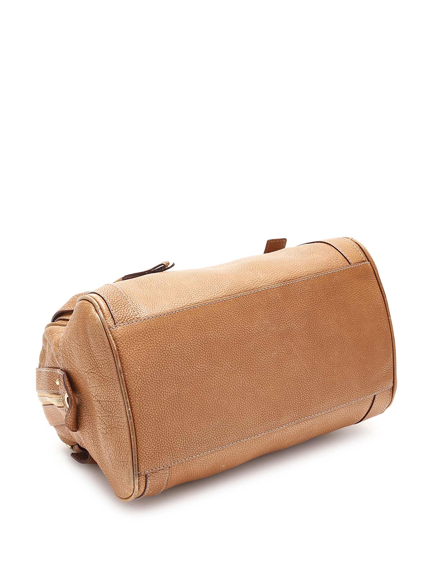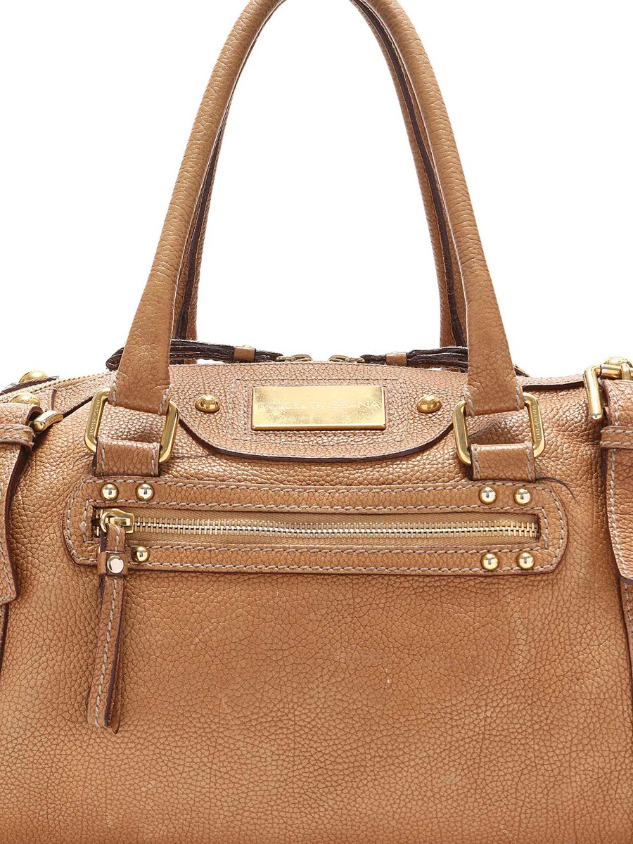 Sac à main en cuir grainé couleur fauve avec ferrures dorées et plaque logo. Fermeture à glissière. Doubles poignées en cuir roulé. Doublure intérieure imprimé léopard.