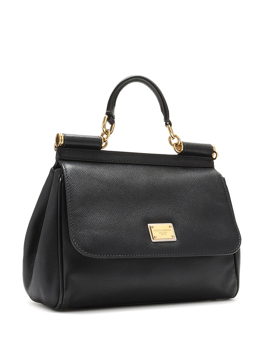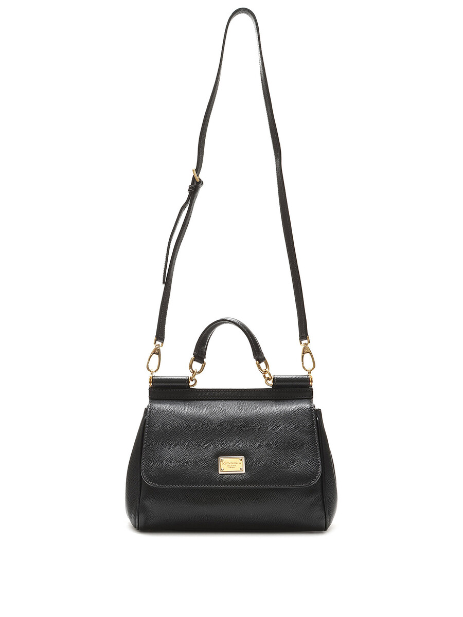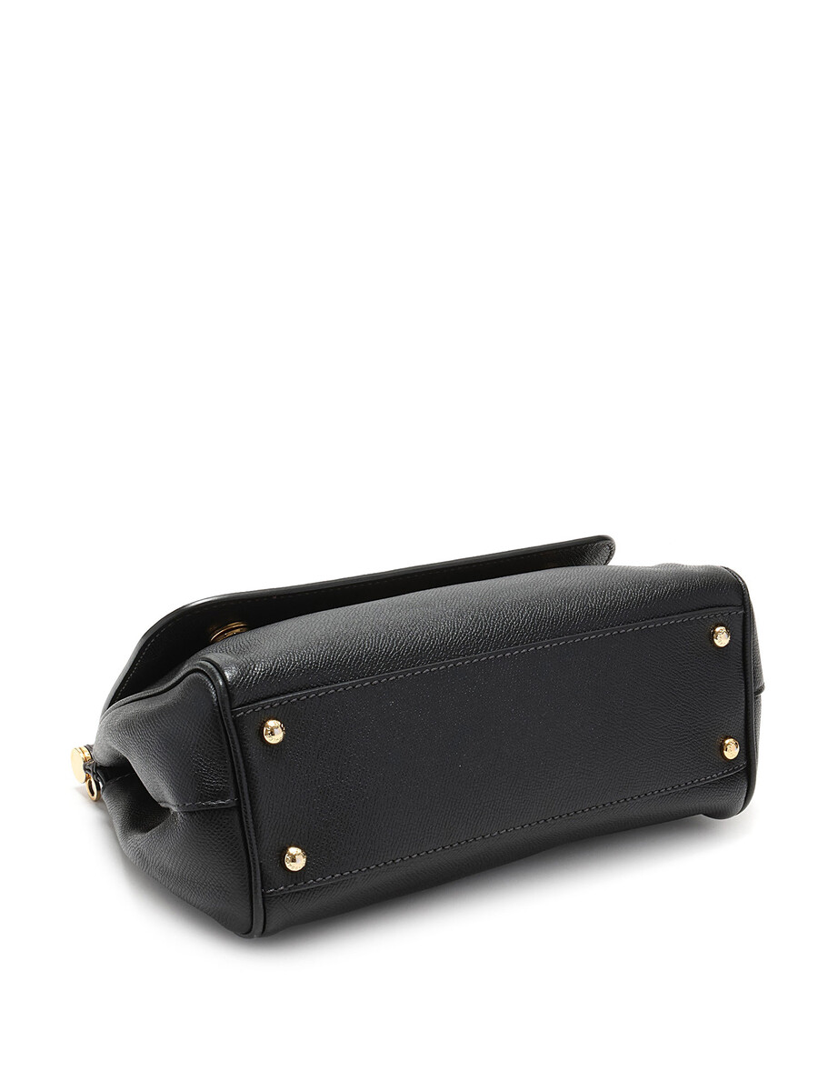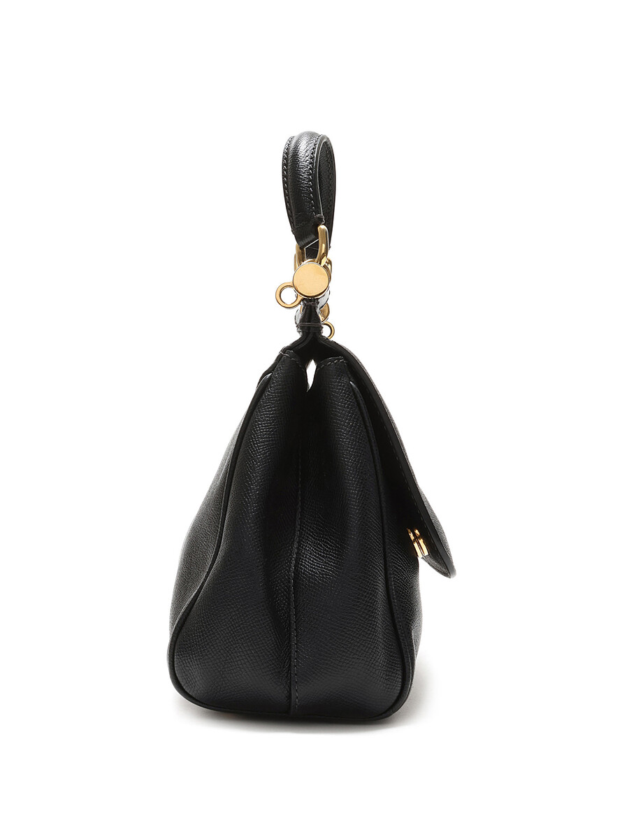 Sac à main en cuir Saffiano noir à design minimaliste. Fermeture magnétique à pression. Anse supérieure et bandoulière amovible. Ferrures dorées.