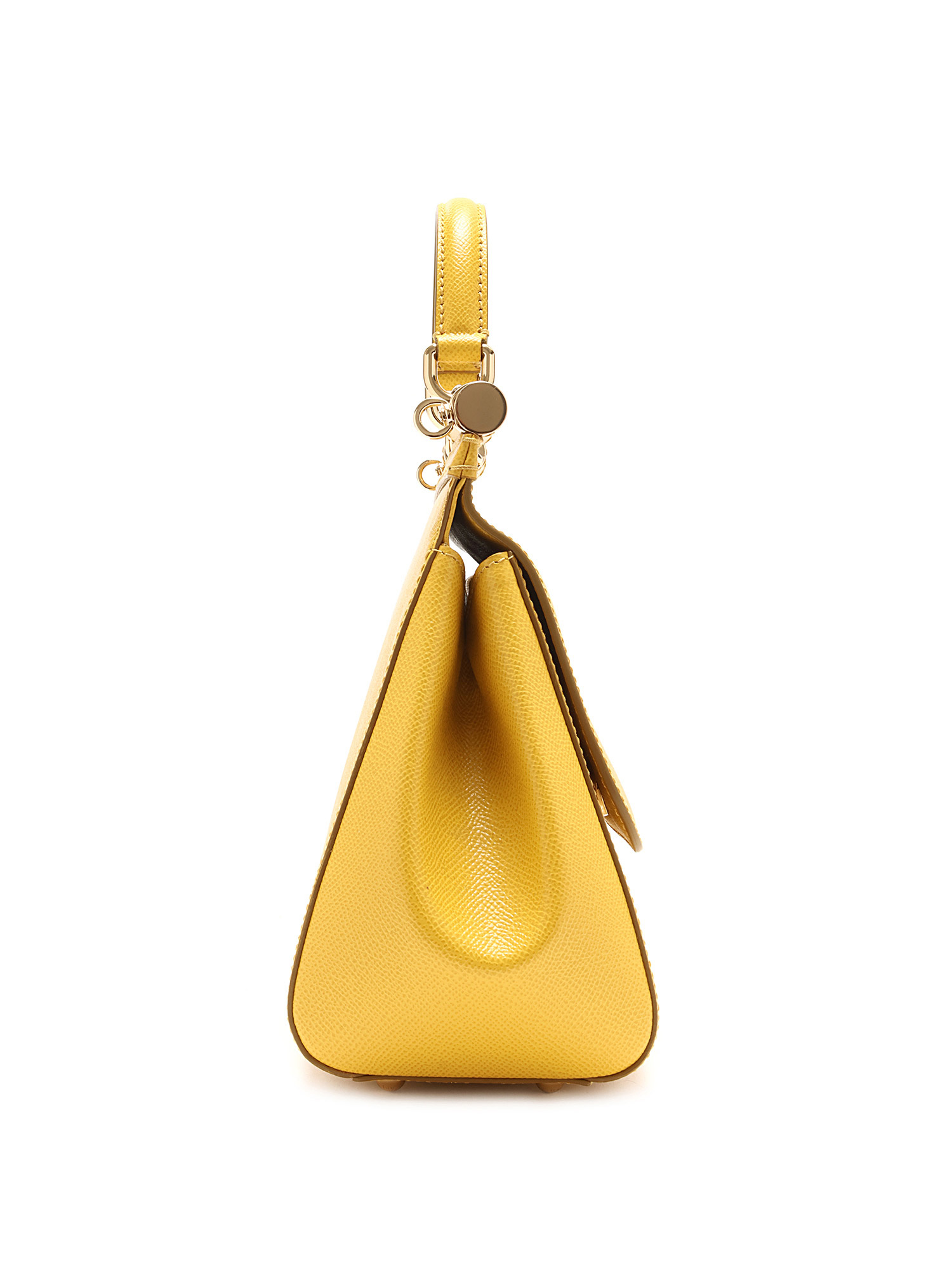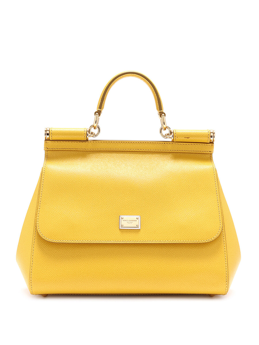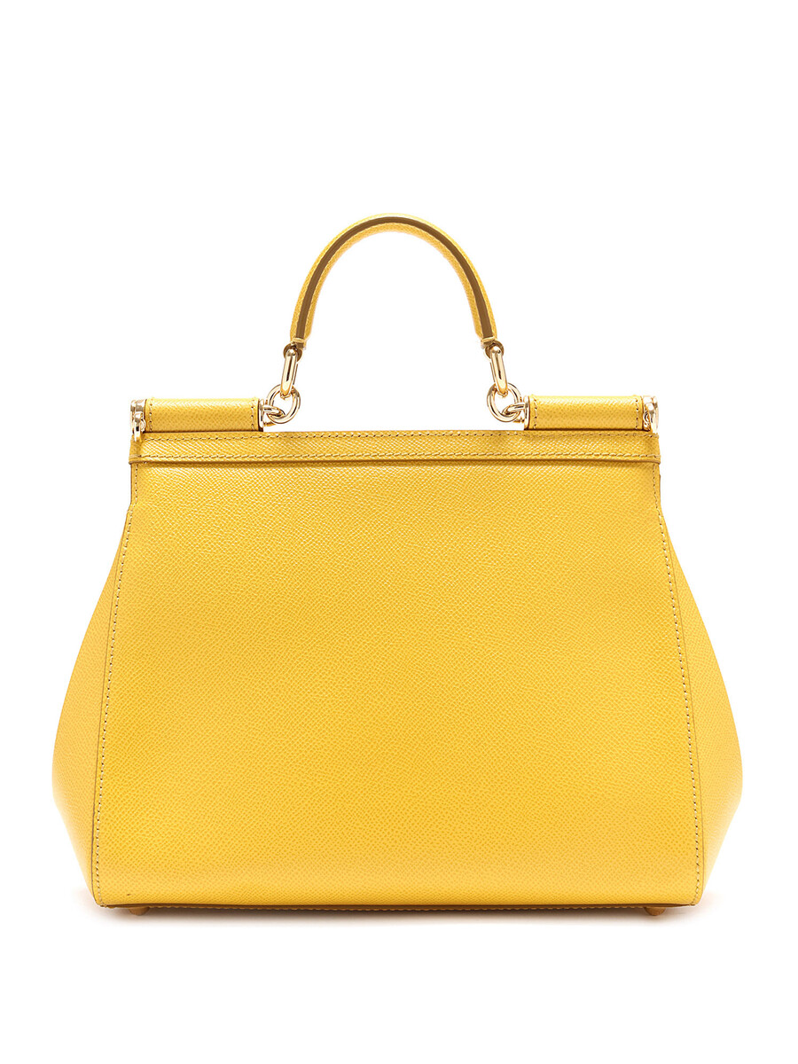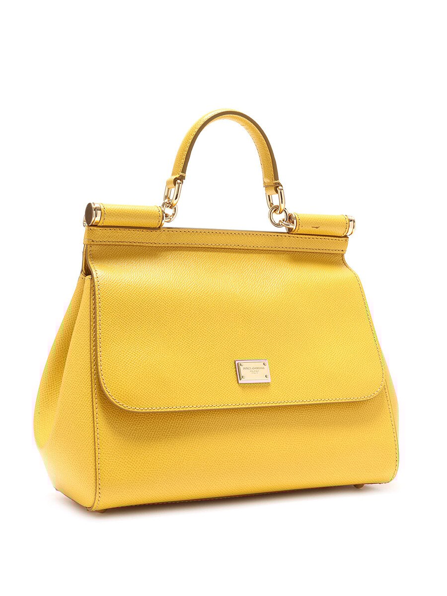 Sac Sicily en cuir de veau couleur jaune tournesol. Fermeture par pression. Poignée supérieure et bandoulière amovible. Ferrures en ton argenté. Inclus dust bag.