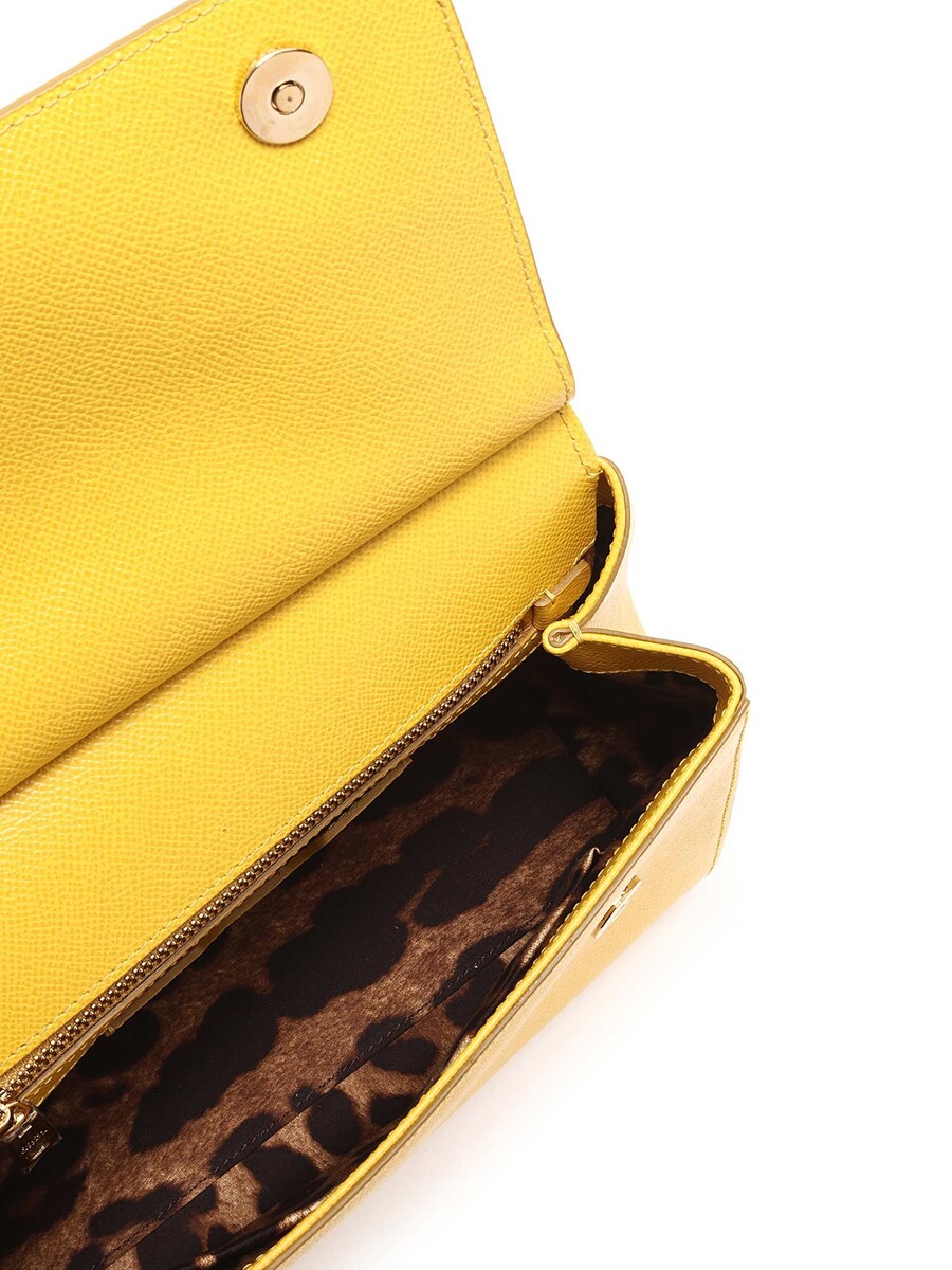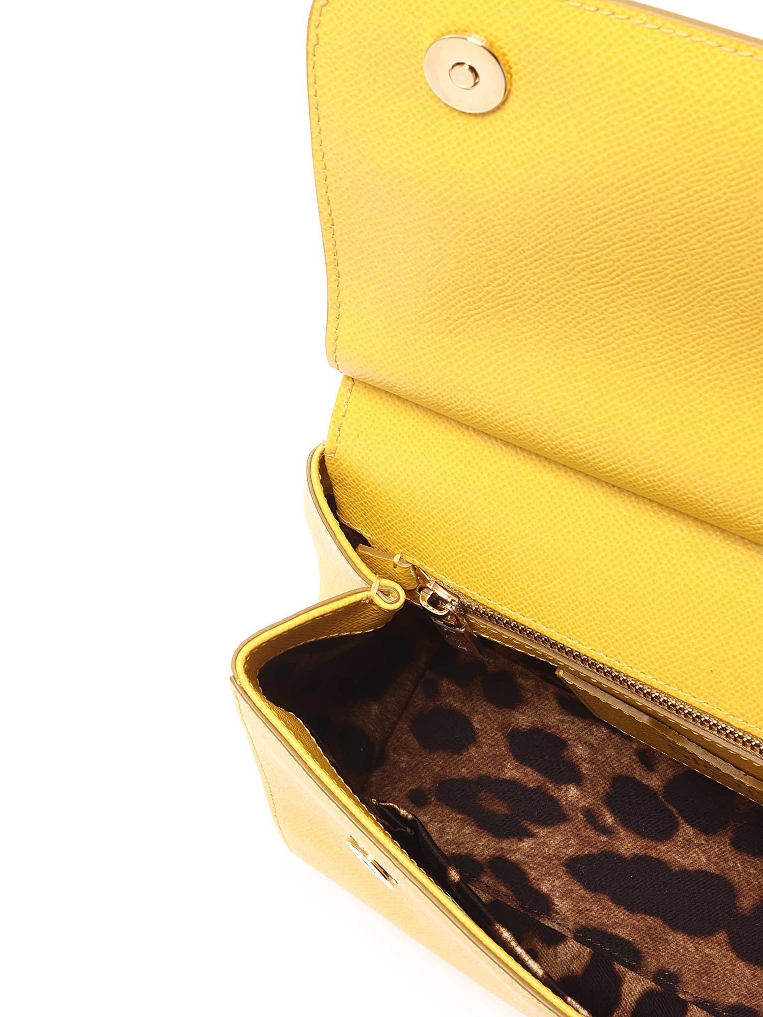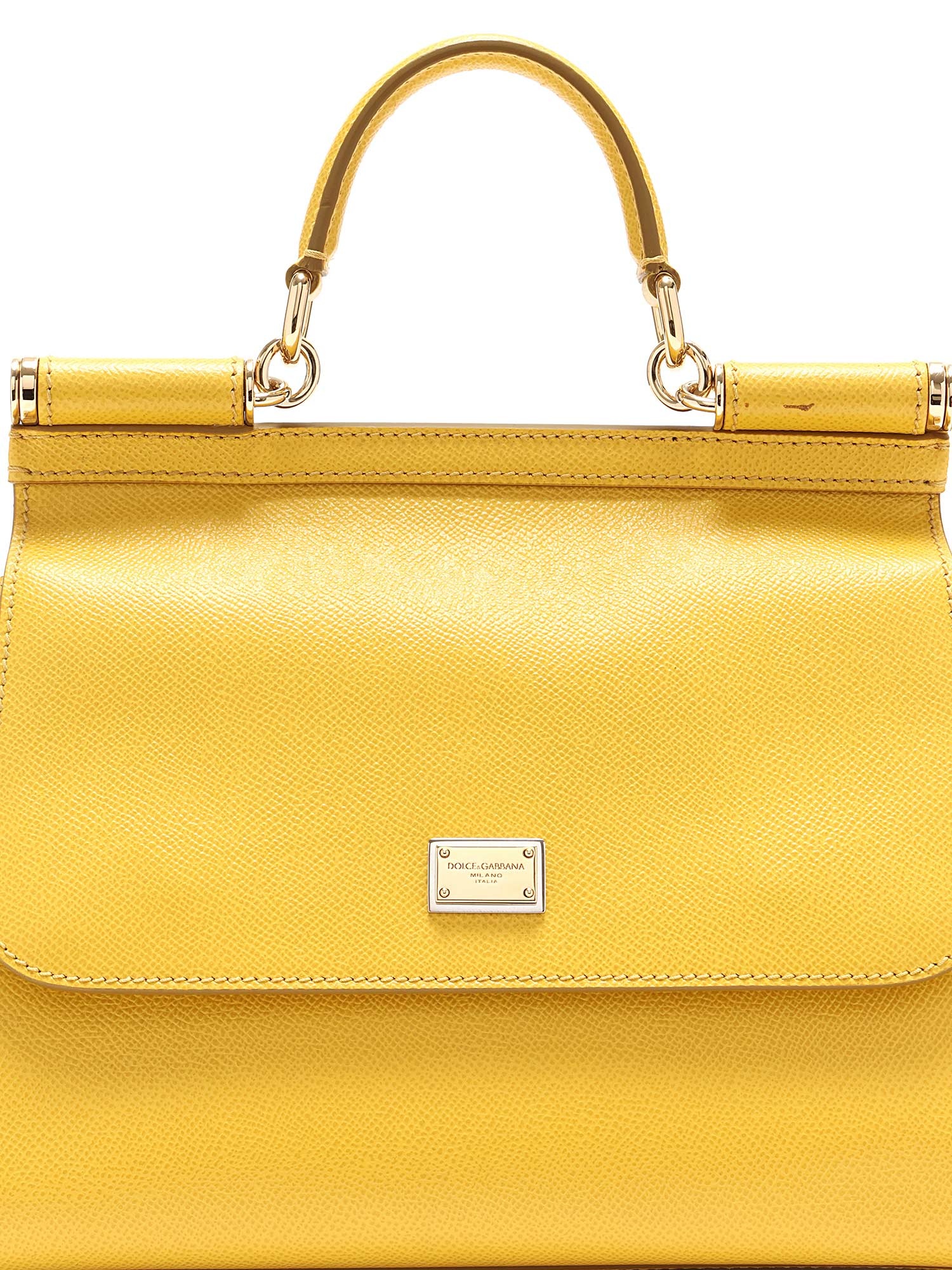 Sac Sicily en cuir de veau couleur jaune tournesol. Fermeture par pression. Poignée supérieure et bandoulière amovible. Ferrures en ton argenté. Inclus dust bag.