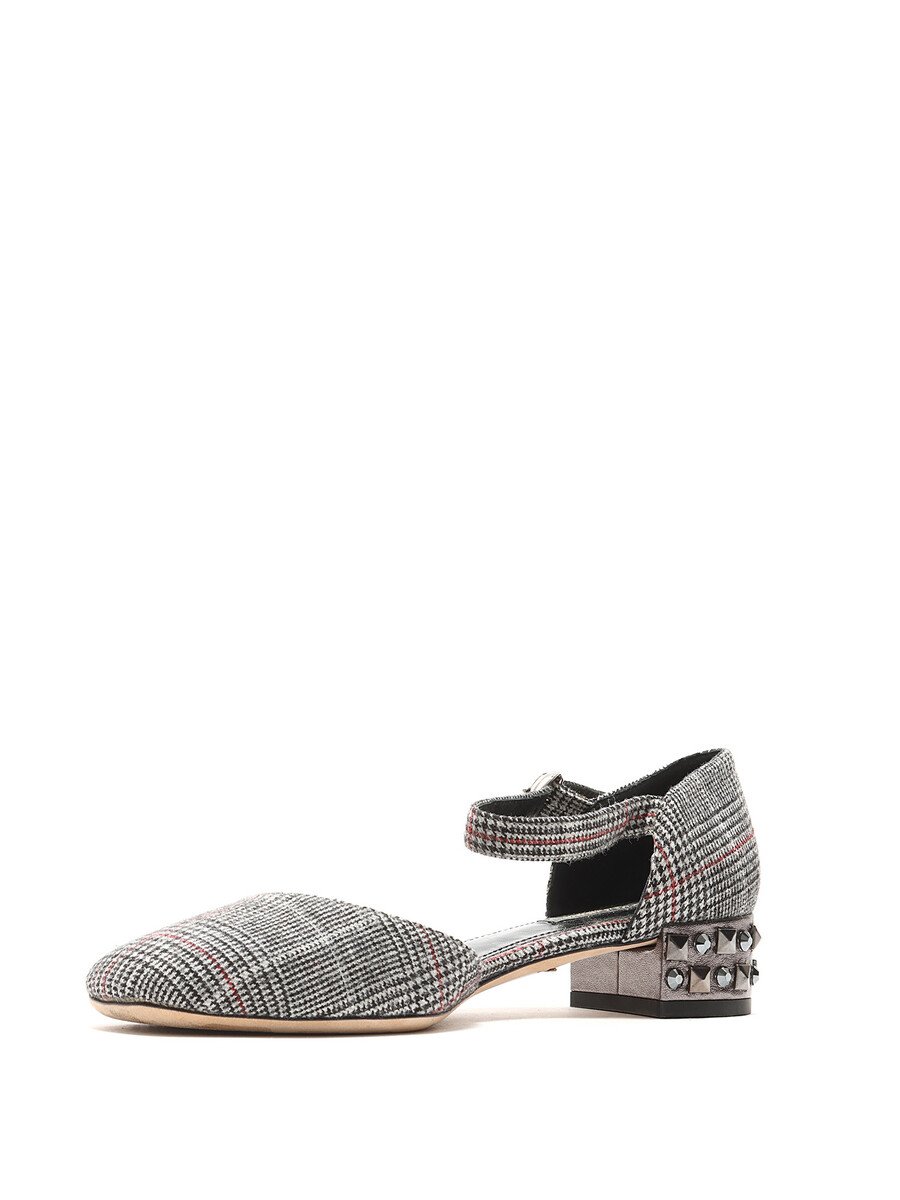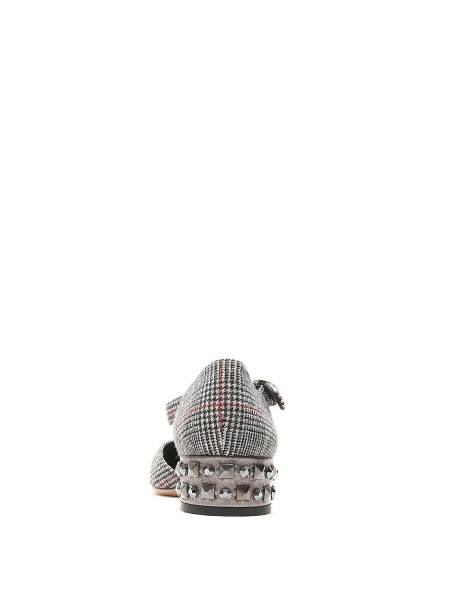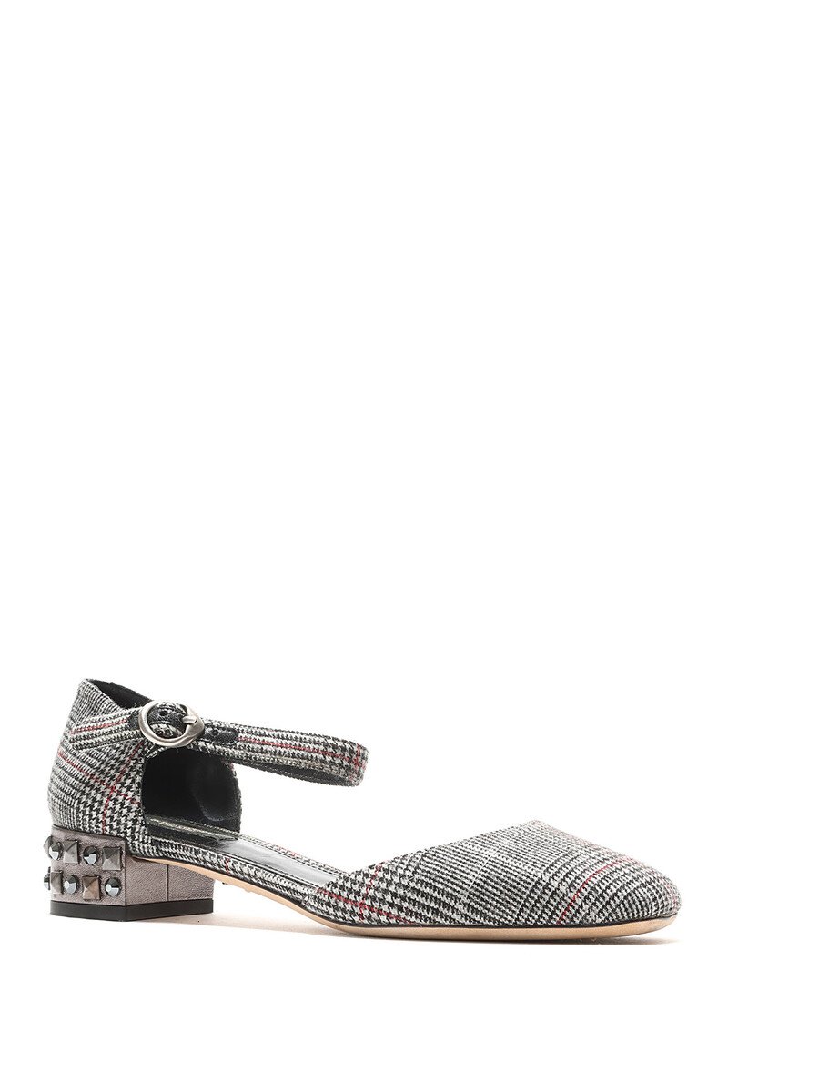 Escarpins Mary Jane à carreaux noirs, gris et blancs ornés de clous. Fermeture à boucle. Bout rond. Semelle en cuir. Talon bloc clouté. Détails métalliques argentés.