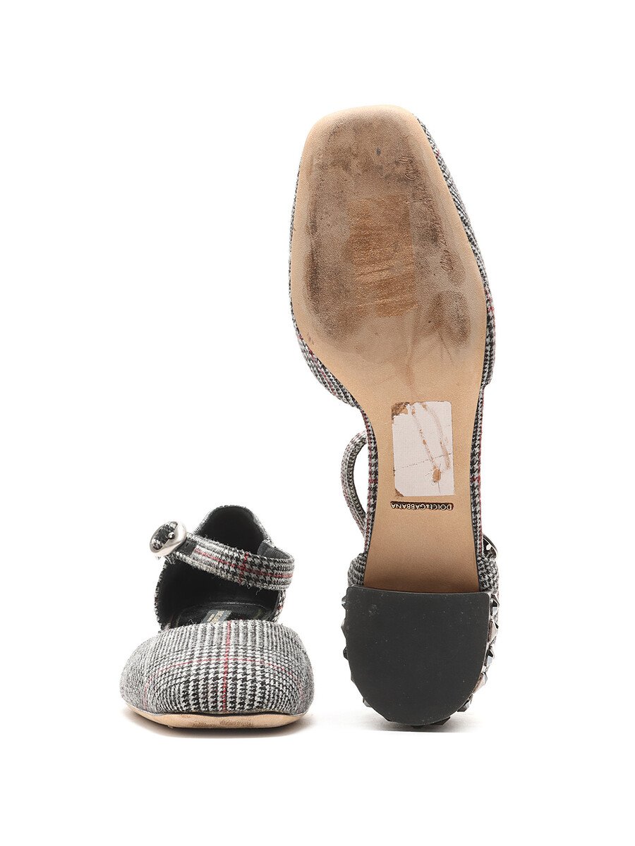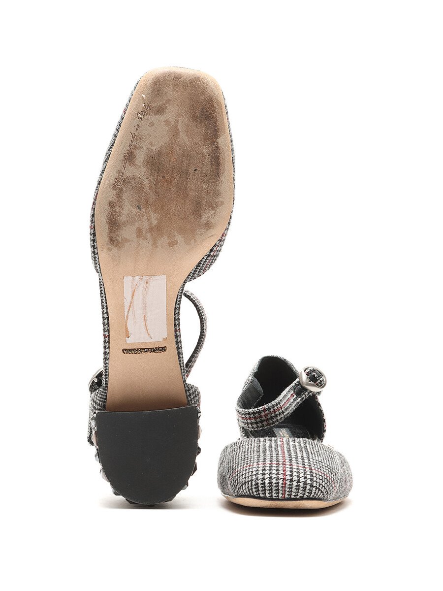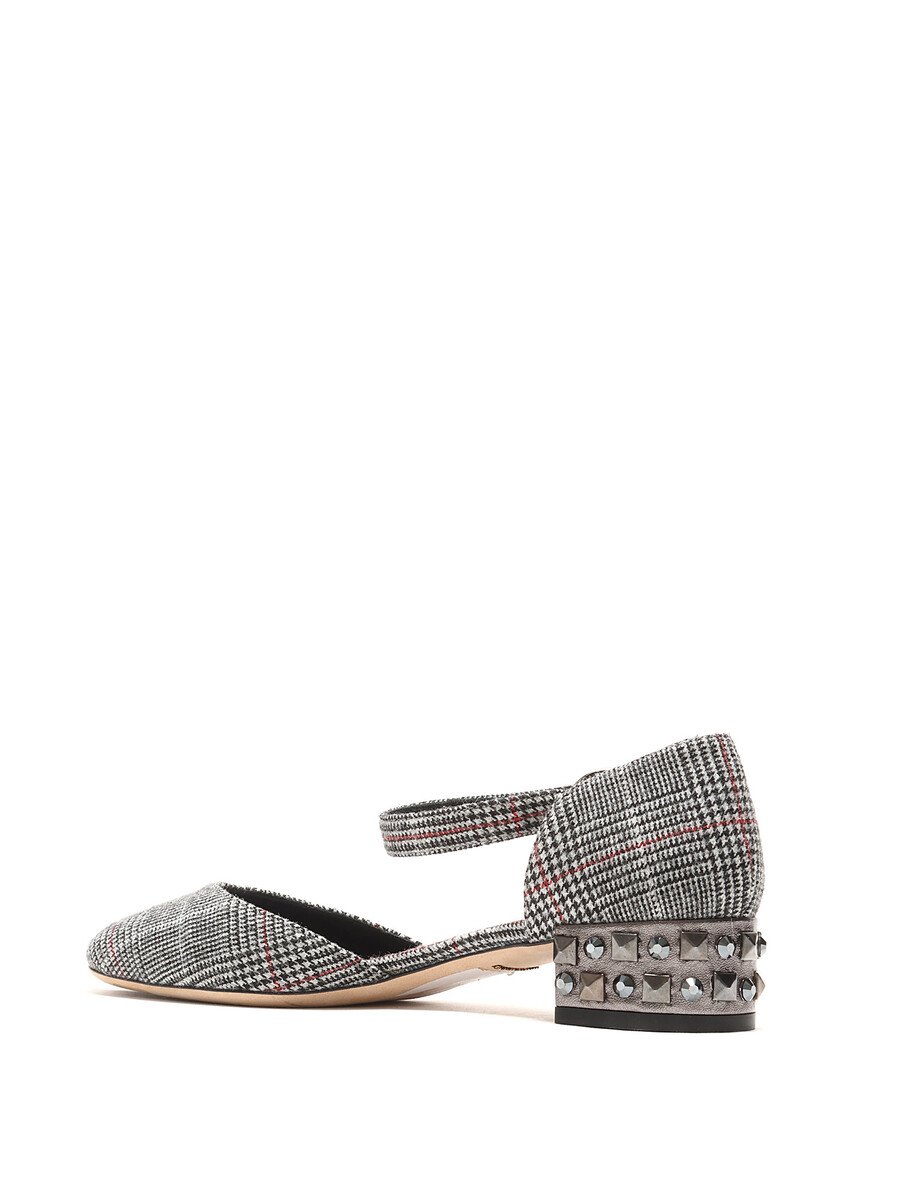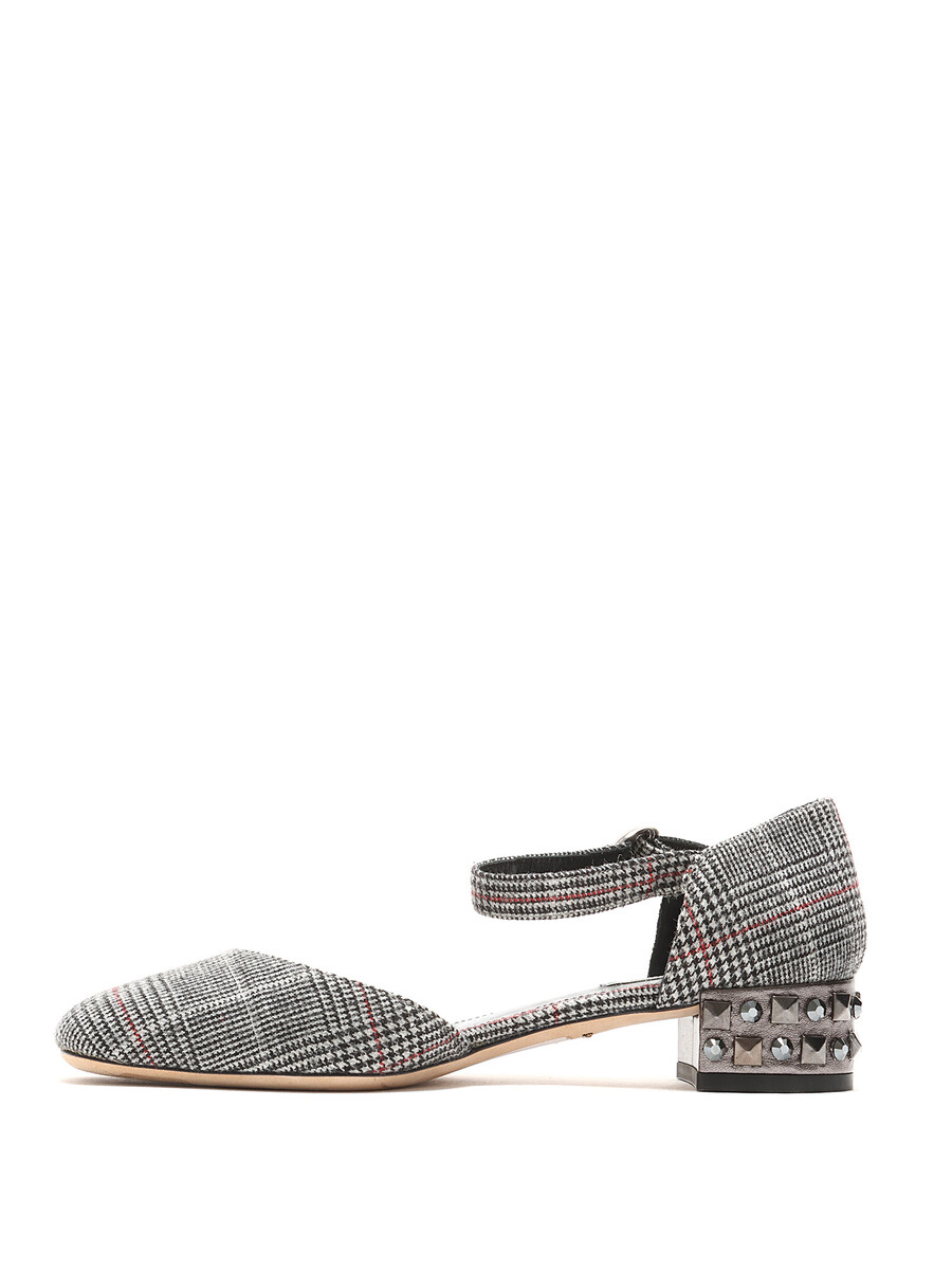 Escarpins Mary Jane à carreaux noirs, gris et blancs ornés de clous. Fermeture à boucle. Bout rond. Semelle en cuir. Talon bloc clouté. Détails métalliques argentés.