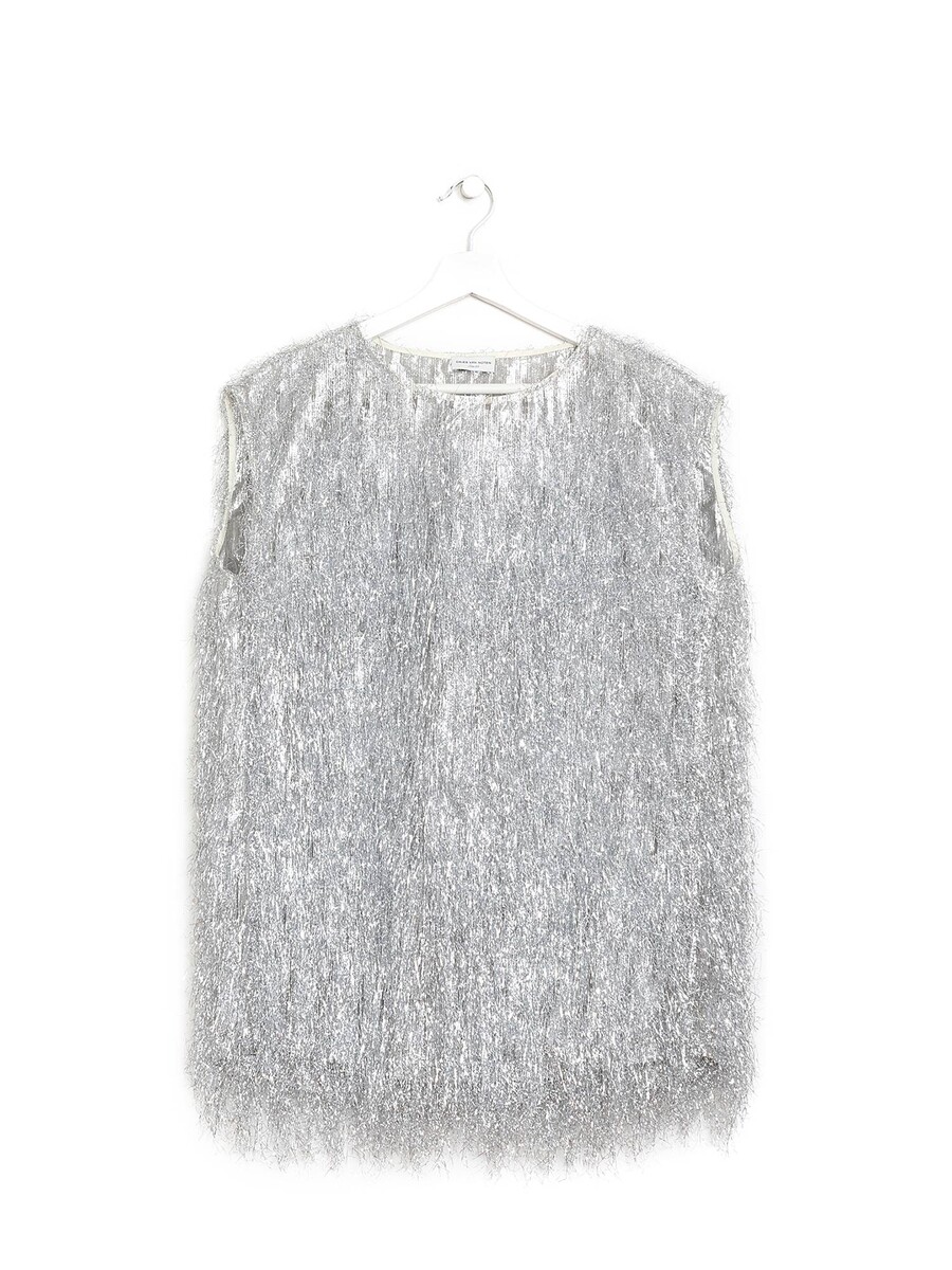 Mini robe sans manches ornée de franges métalliques. Col rond. Silhouette en ligne A.