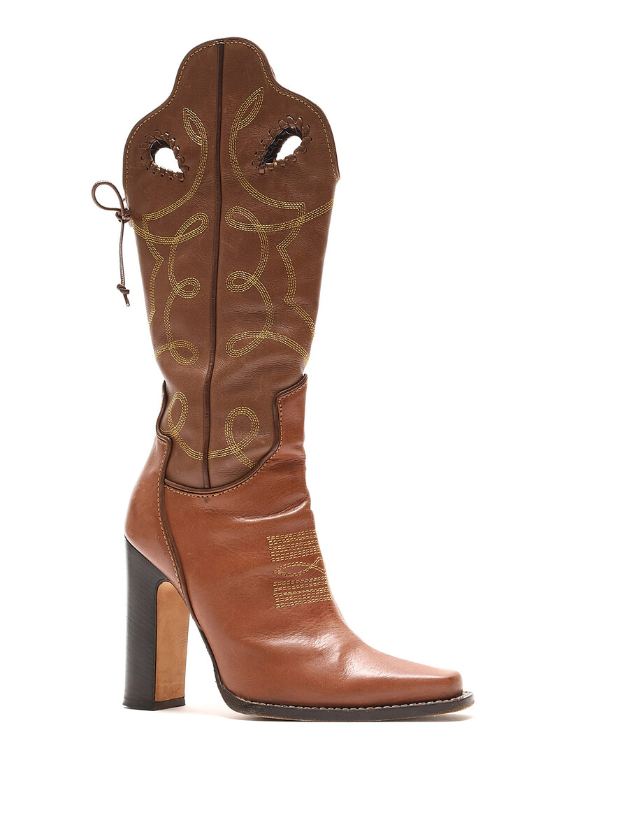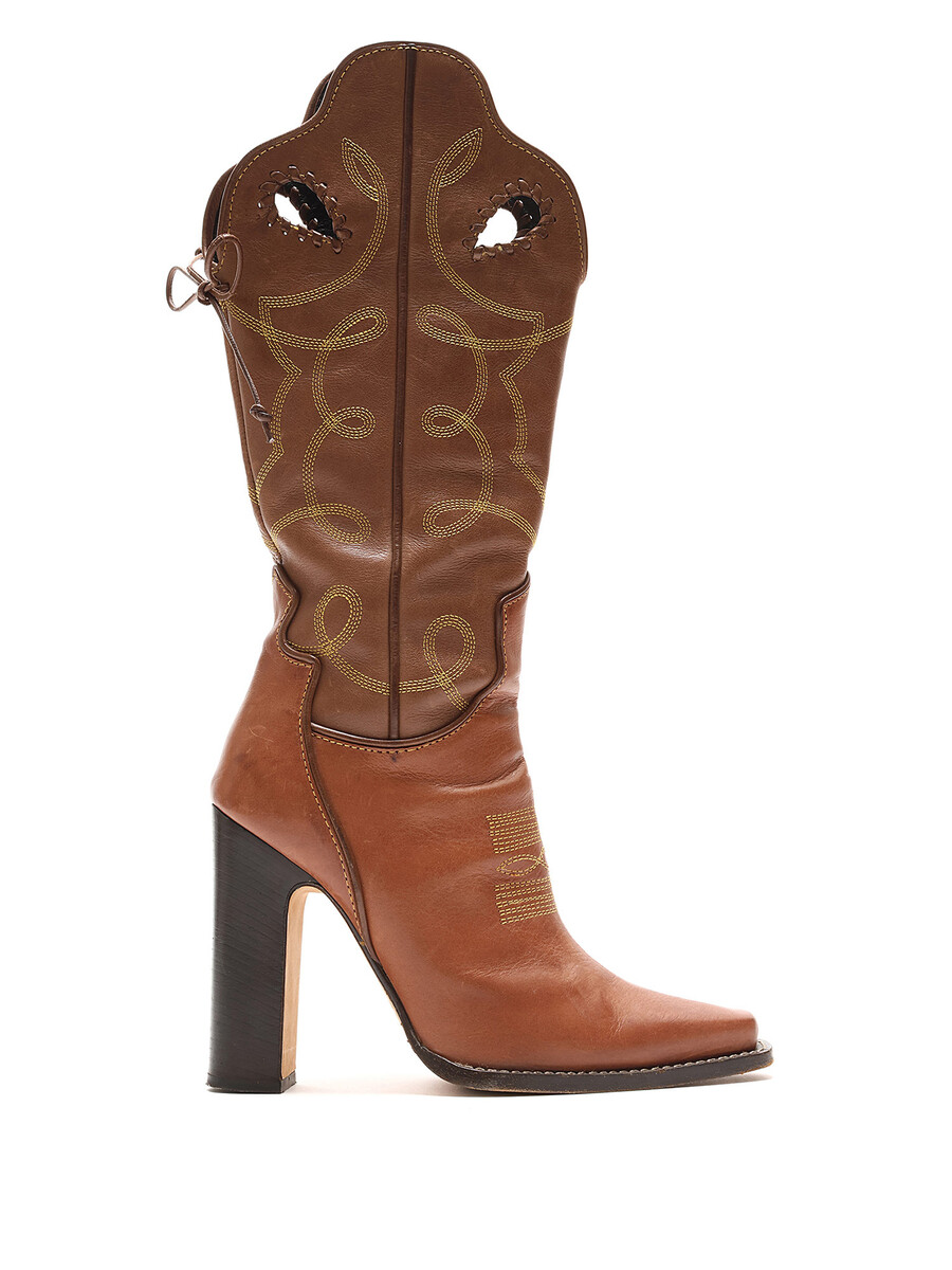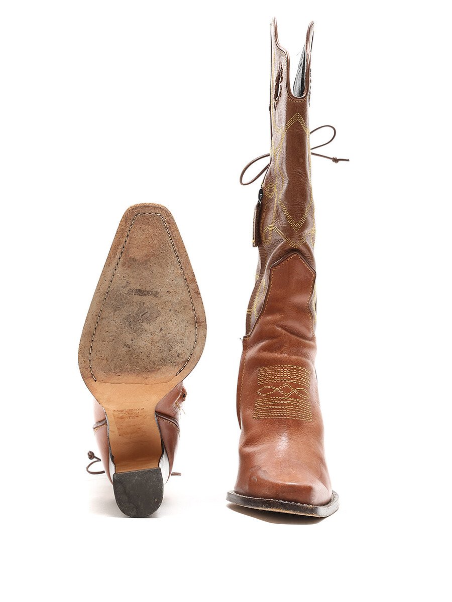 Bottes en cuir brun avec surpiqûres contrastantes et laçage. Fermeture à glissière latérale. Bout pointu. Semelle en cuir.