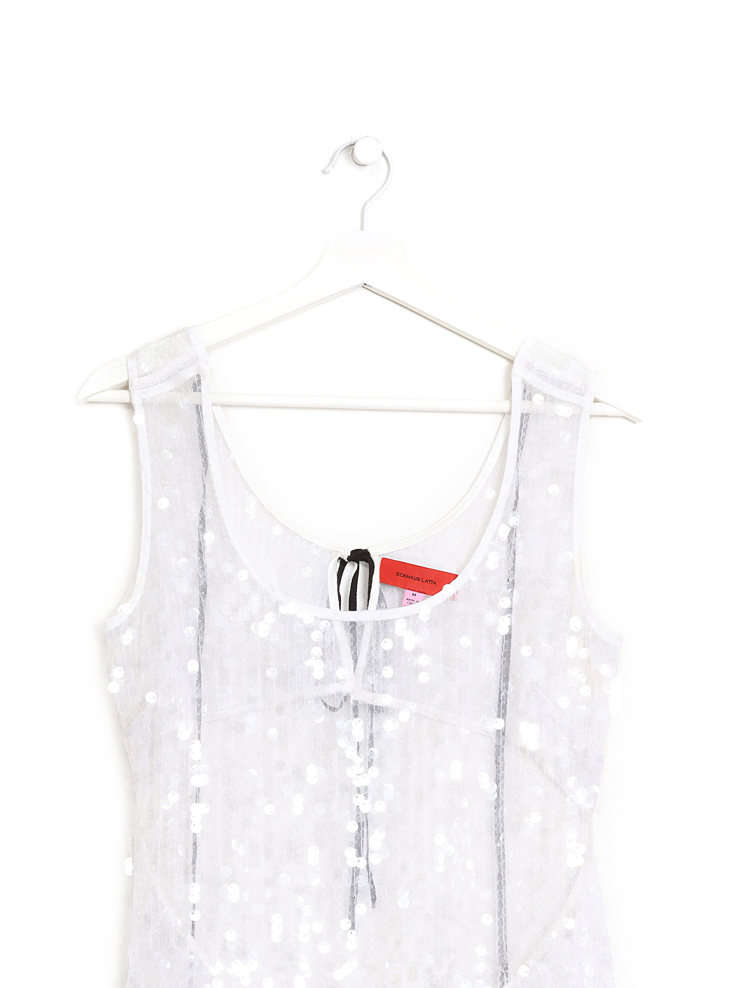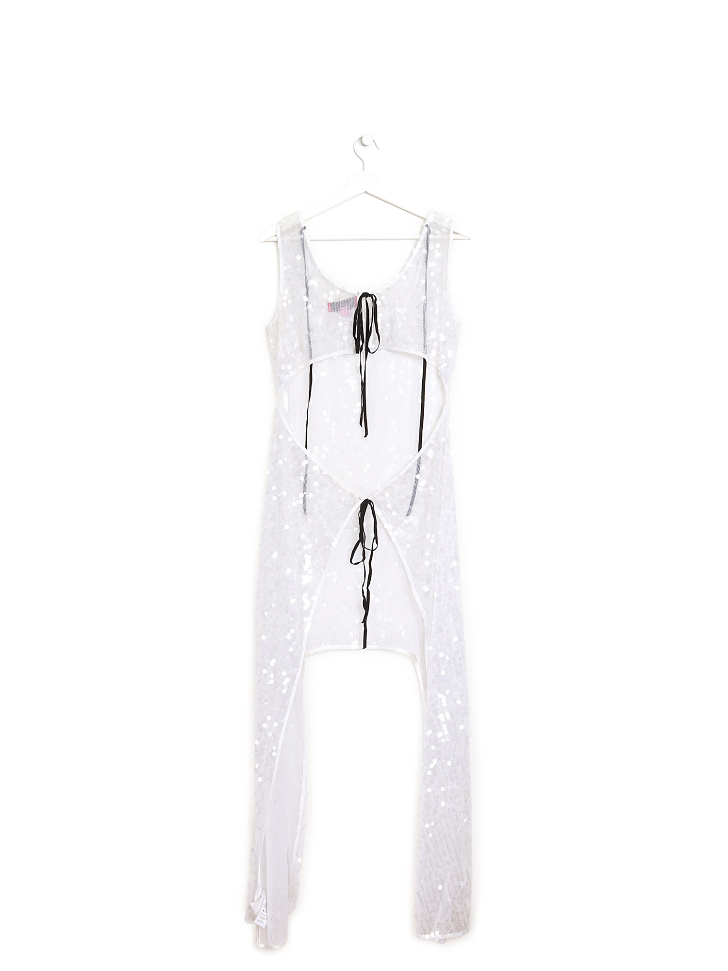 Robe sans manches blanche ornée de paillettes sur l'ensemble. Bandes à nouer à l'épaule.