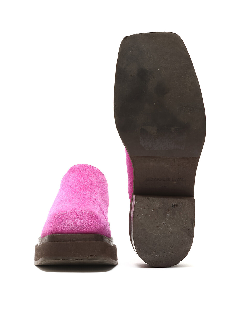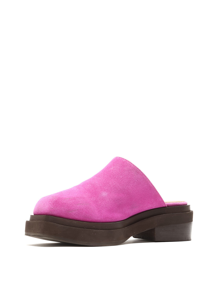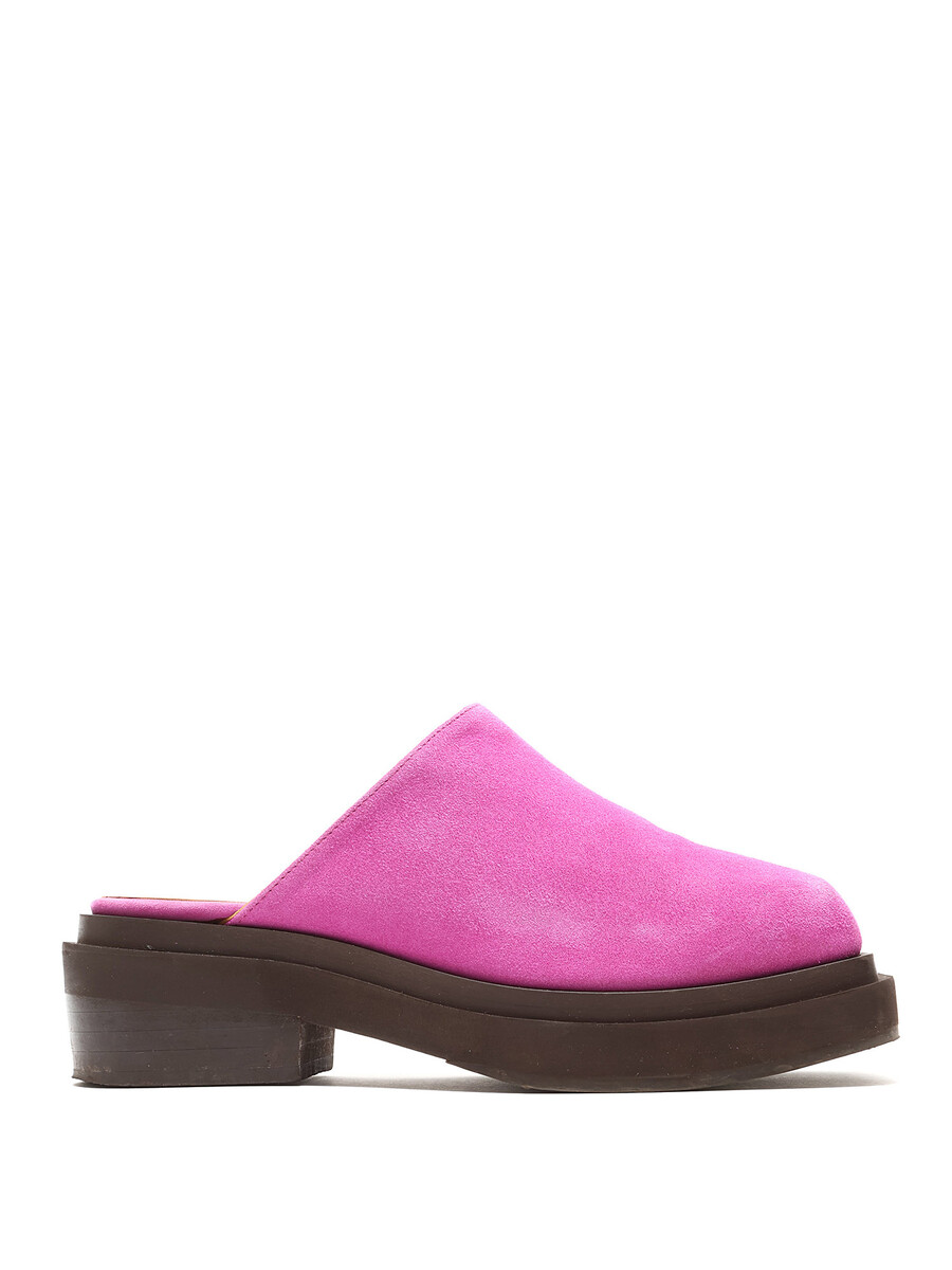 Mules en suède magenta vif, à enfiler. Design à bout carré. Semelle plate en caoutchouc.