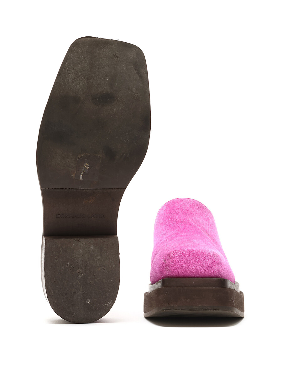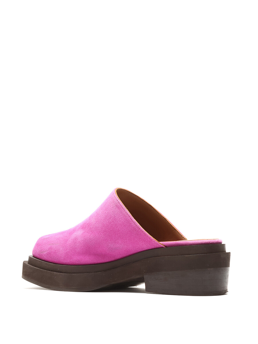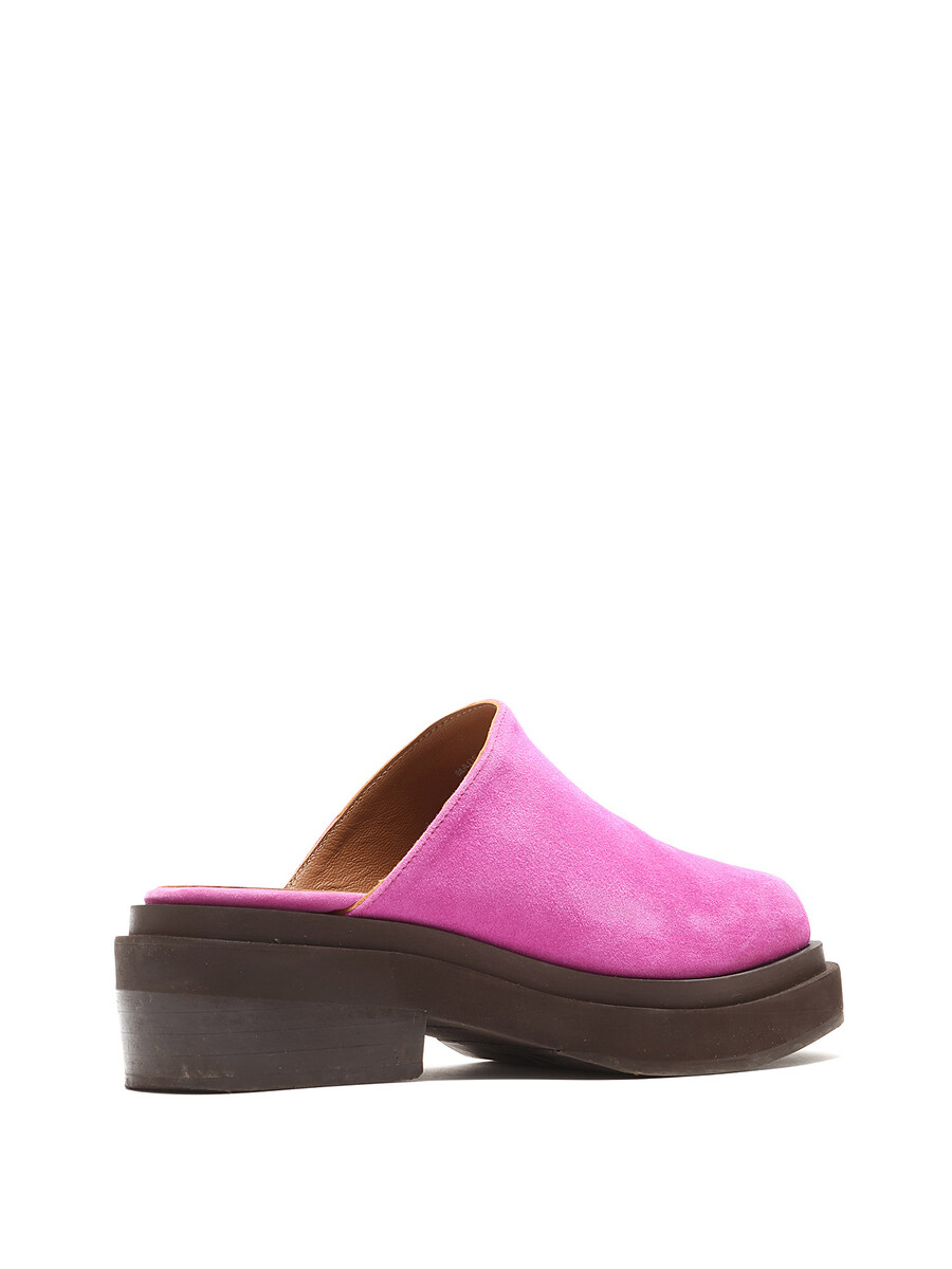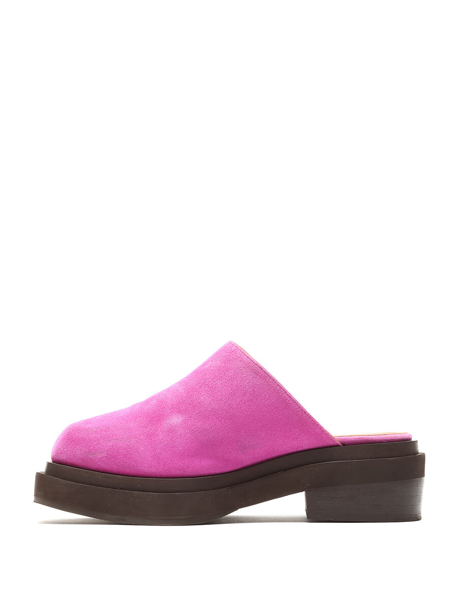Mules en suède magenta vif, à enfiler. Design à bout carré. Semelle plate en caoutchouc.