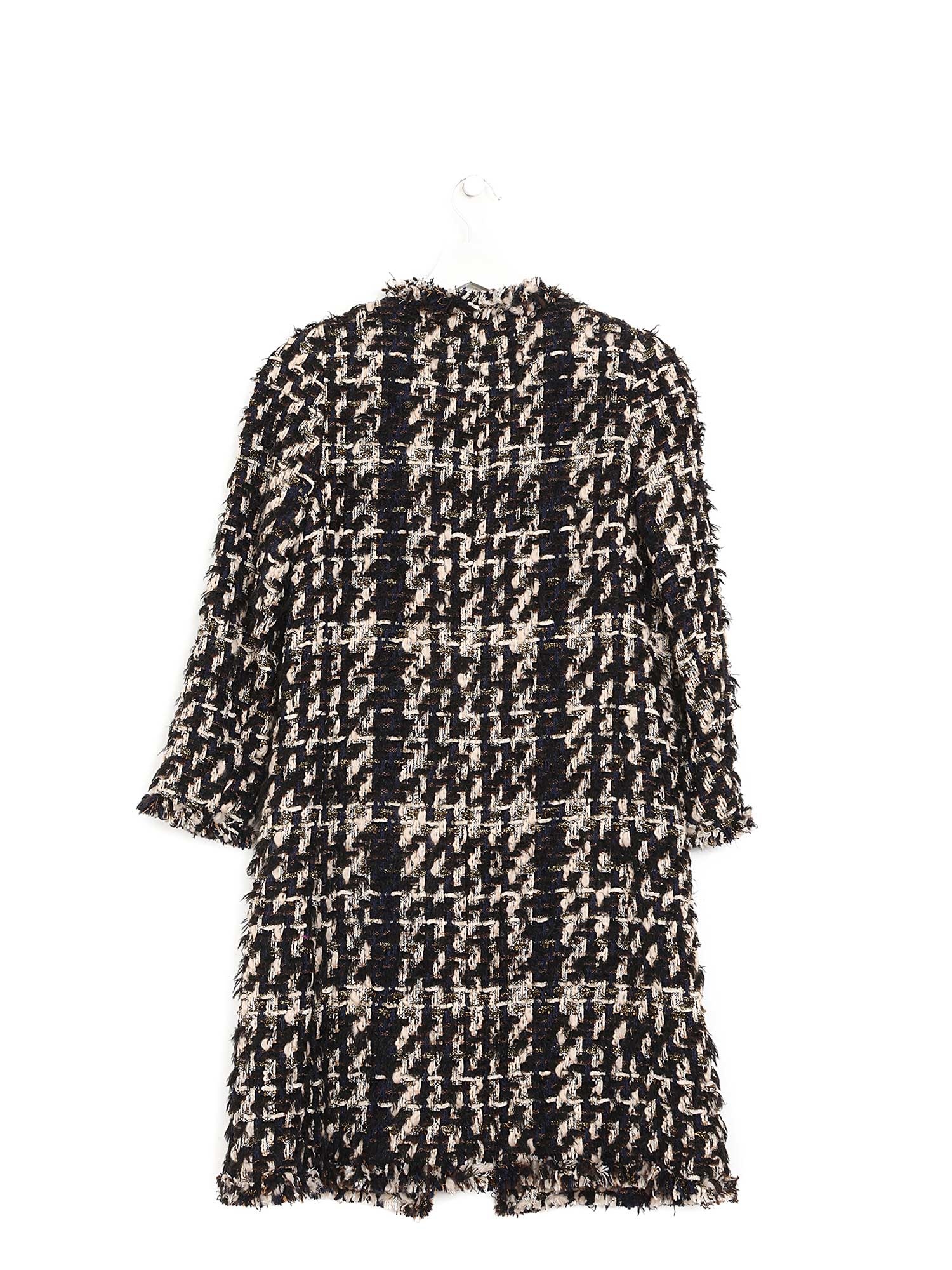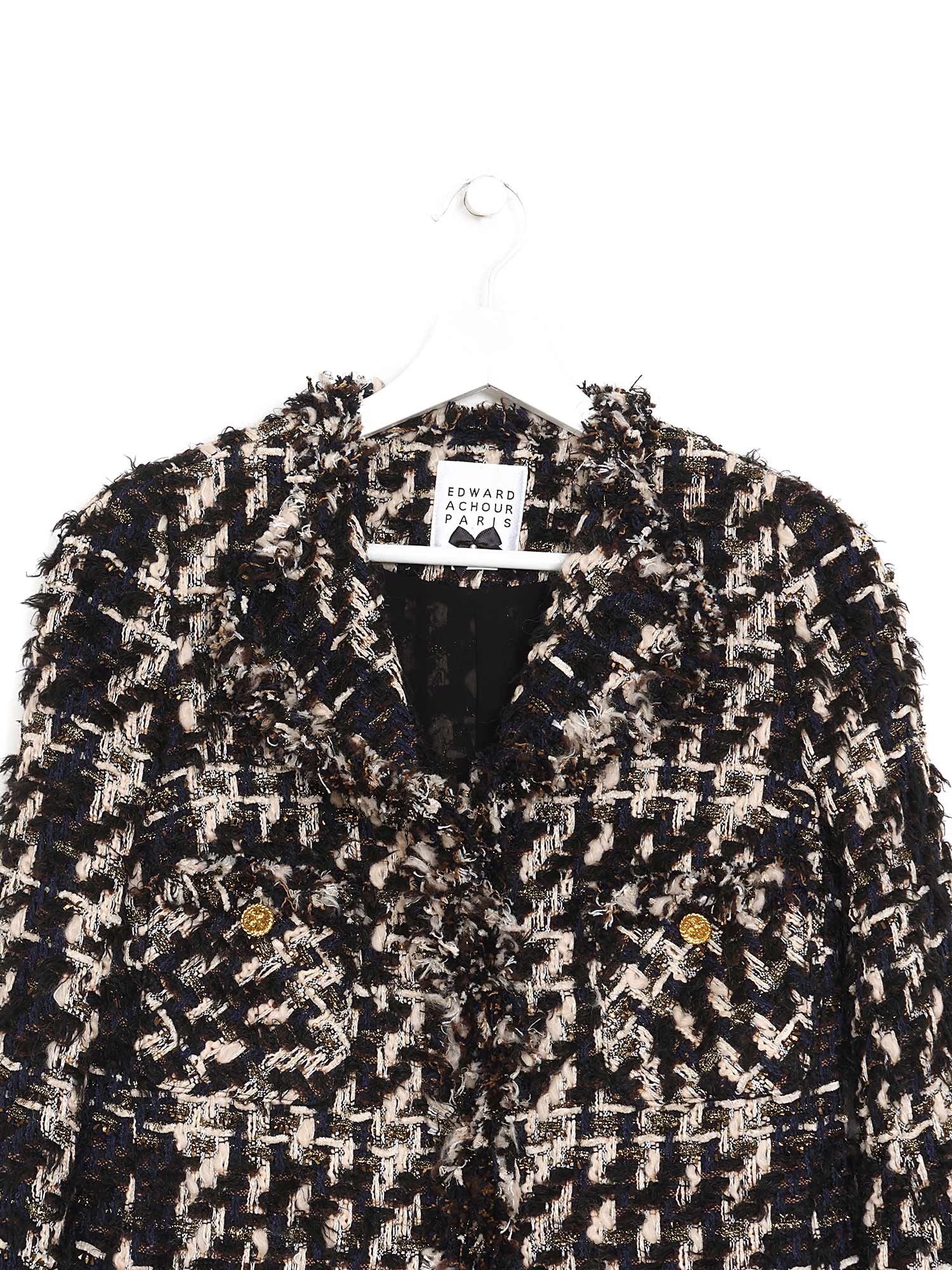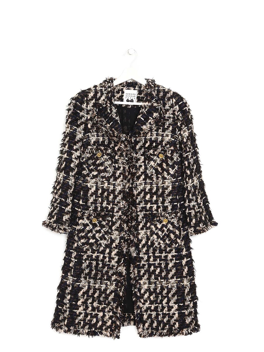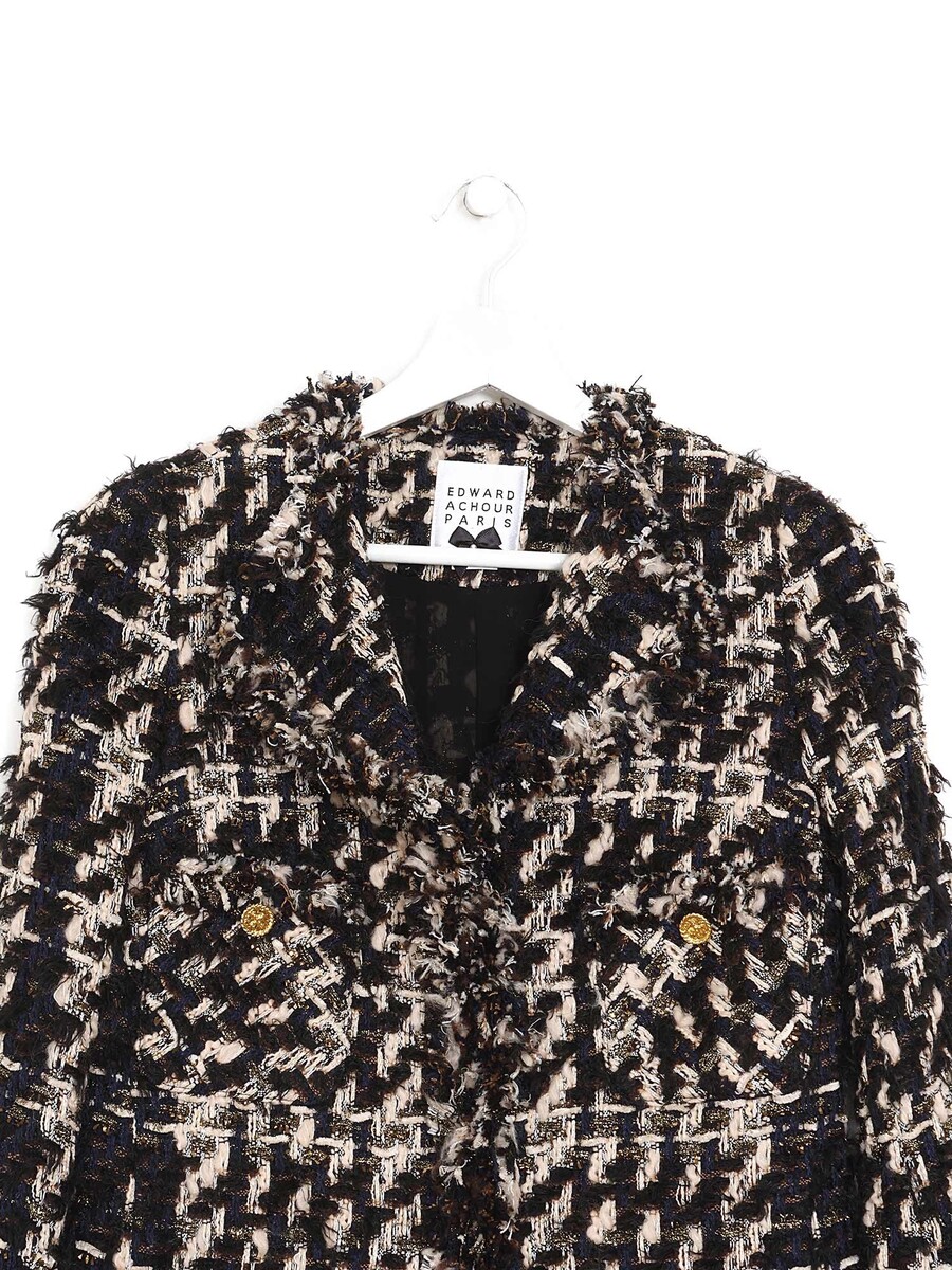 Veste en tweed à motif à carreaux noir et blanc avec col classique et fermeture à boutons.