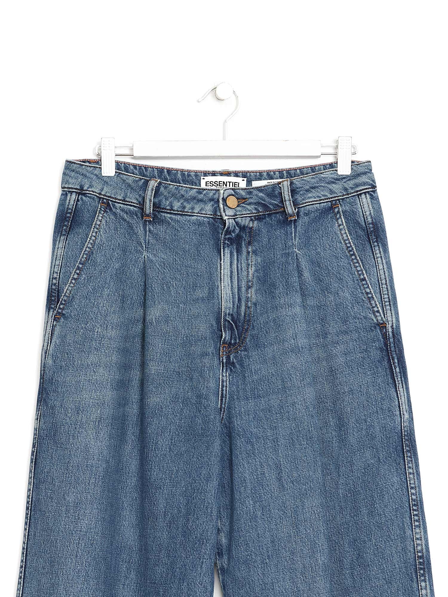 Jean en denim coupe décontractée en bleu. Fermeture à boutons sur le devant. Quatre poches.