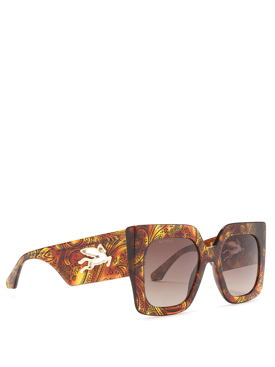 Lunettes de soleil en écaille de tortue avec motif baroque complexe et ornements de chevaux argentés.