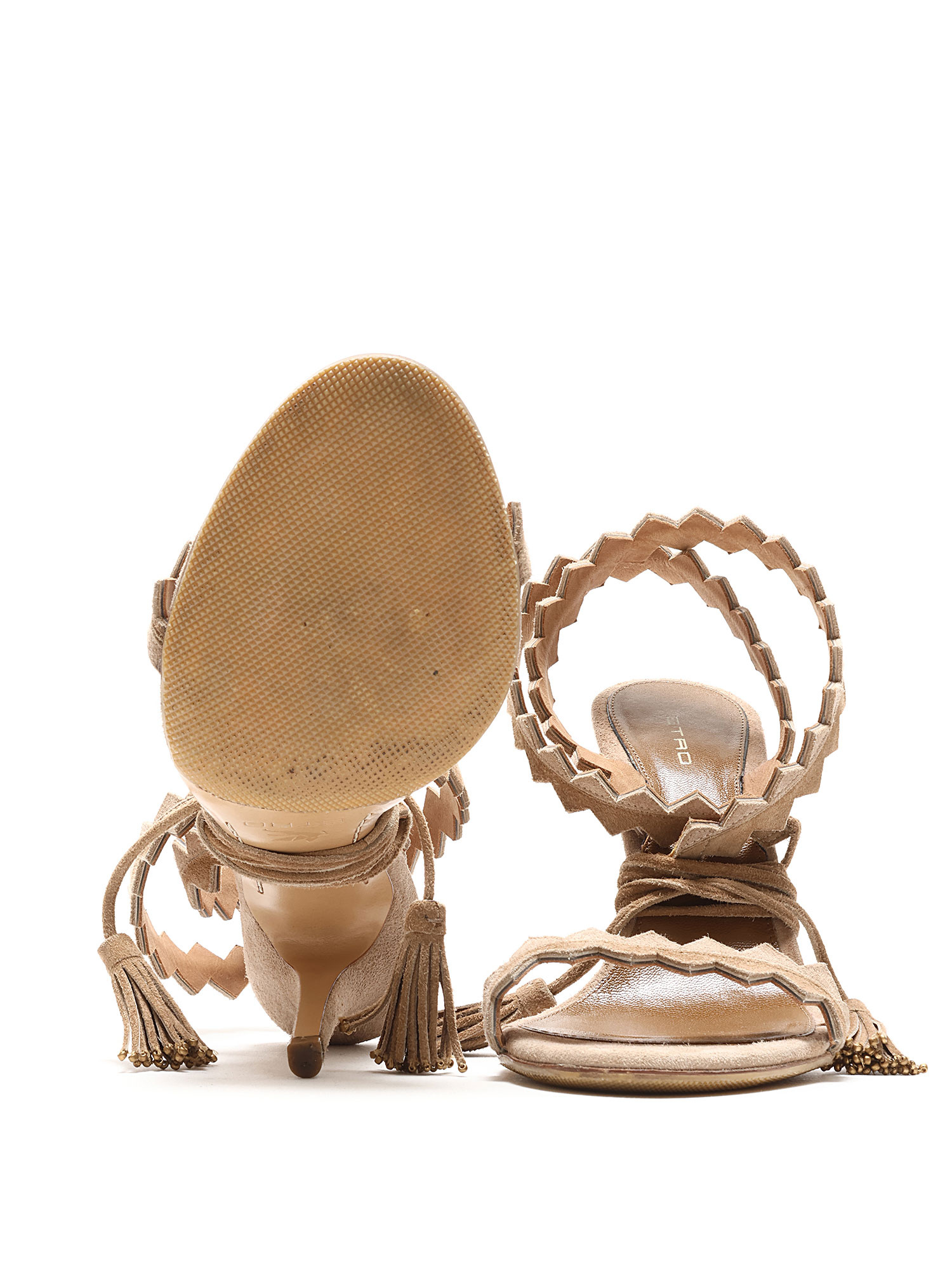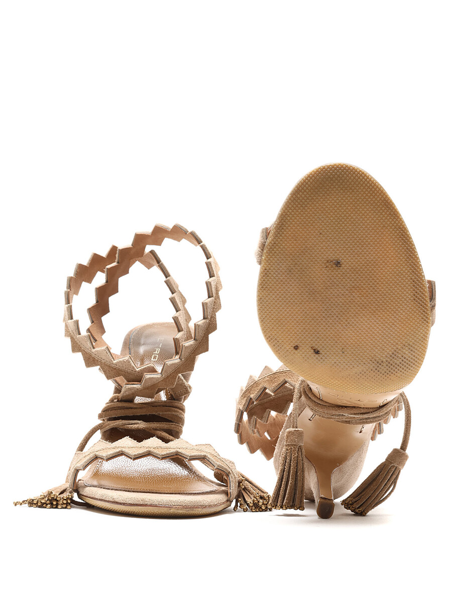 Sandales en suède avec brides en zigzag et ornées de glands. Fermeture à lacets. Bout ouvert. Semelle en cuir.